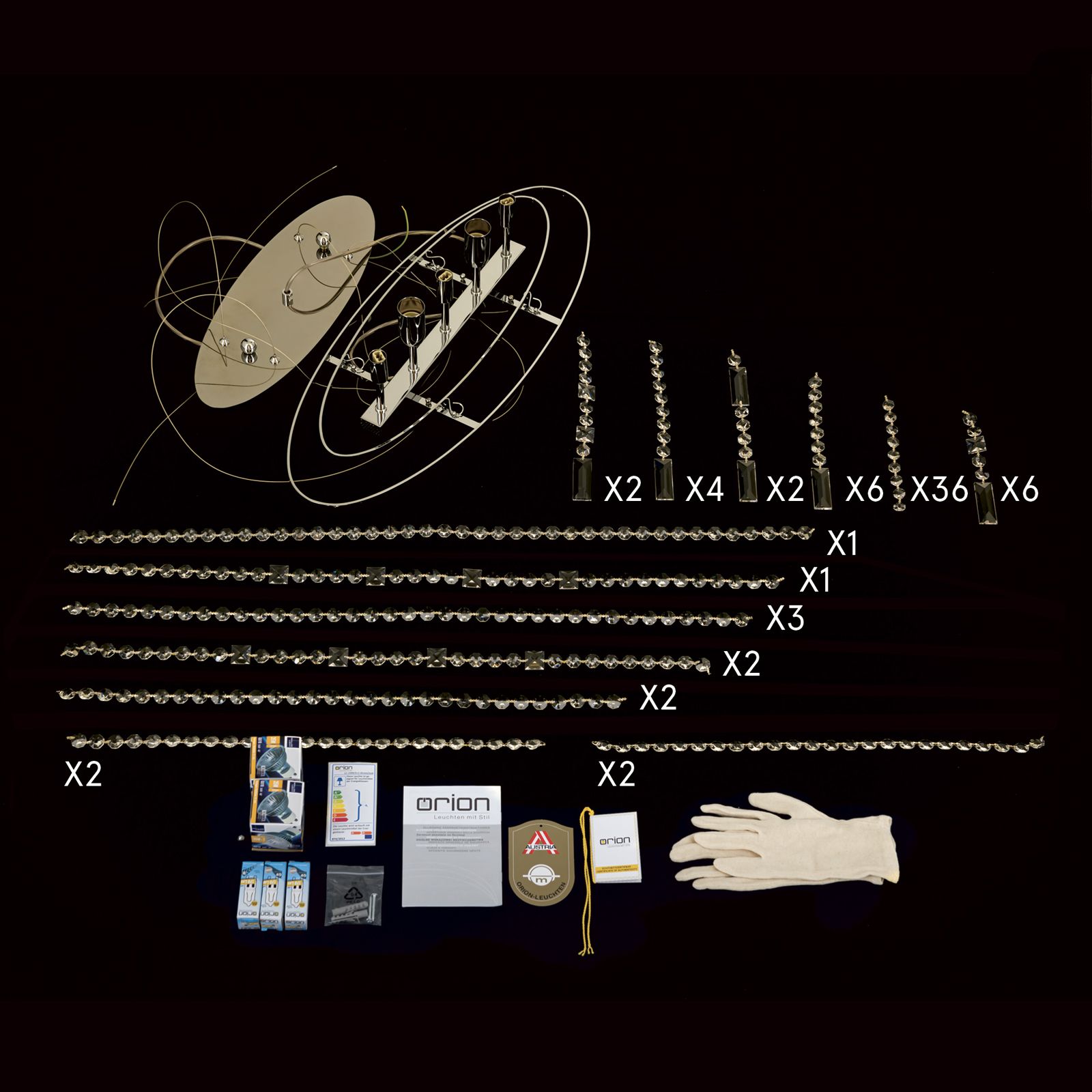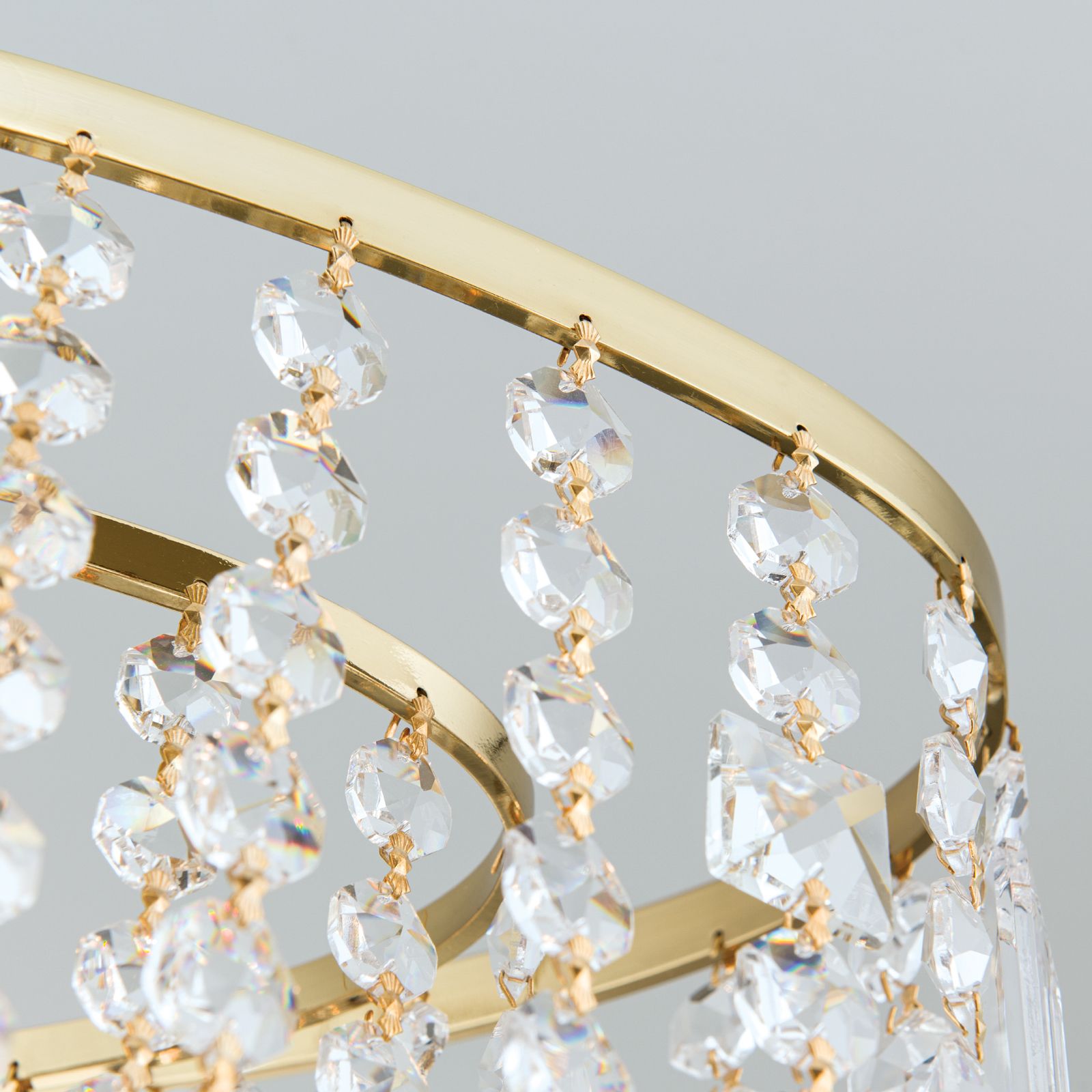 The heart of this light is undoubtedly the numerous cut SCHÖLER CRYSTAL® crystals, which are attached in different shapes to both the outer ring and the socket of the light's frame. These crystals capture the light in a magical way, sparkling and radiating it in all directions to create an incomparable atmosphere.