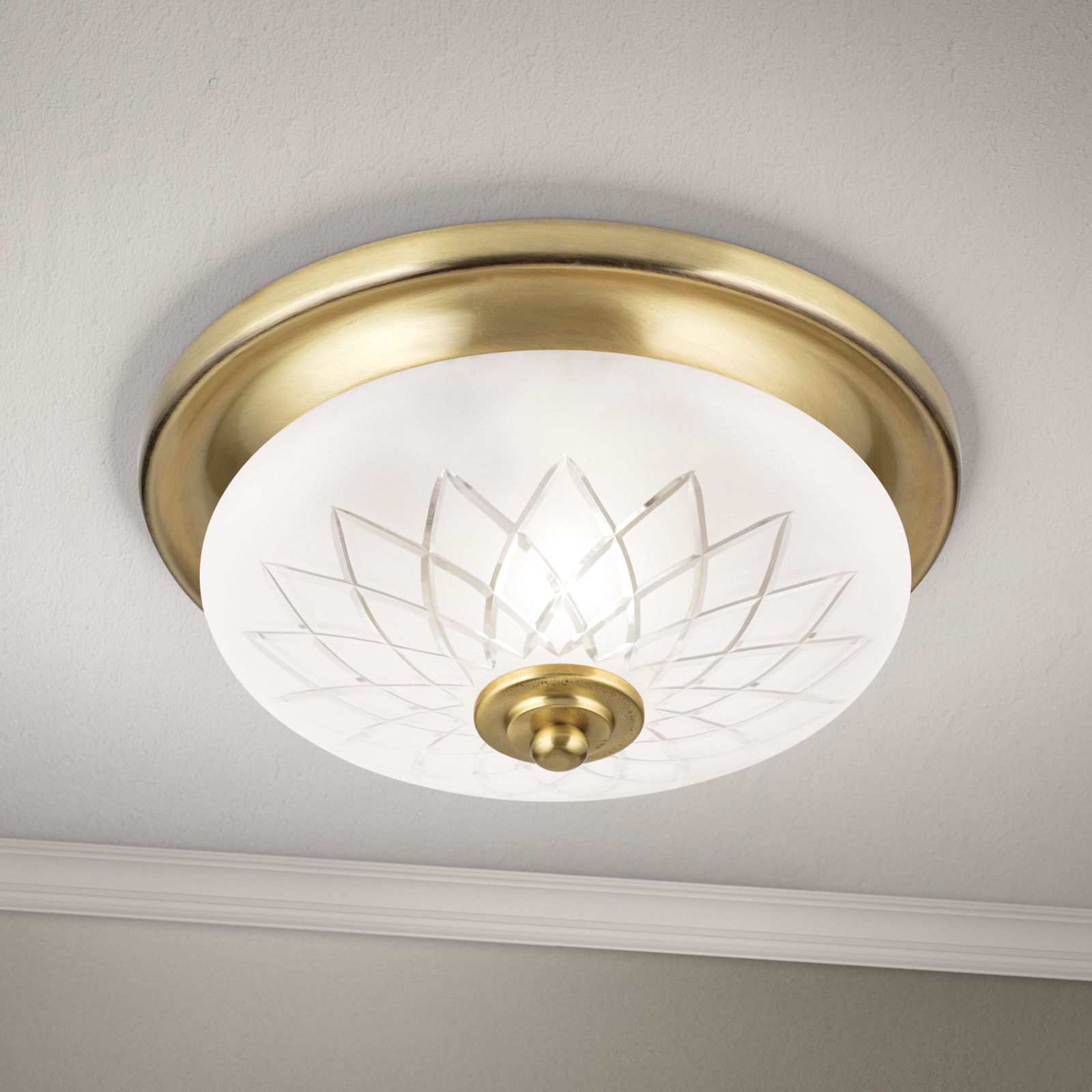 The luminaire impresses with its bronze finish, which gives it an elegant and sophisticated look. The satinised glass shade with diamond cut not only ensures glare-free and uniform light distribution, but also sets stylish accents. This luminaire combines high-quality design with functional lighting.