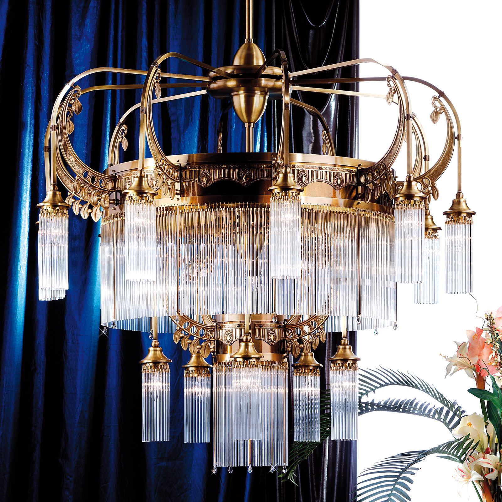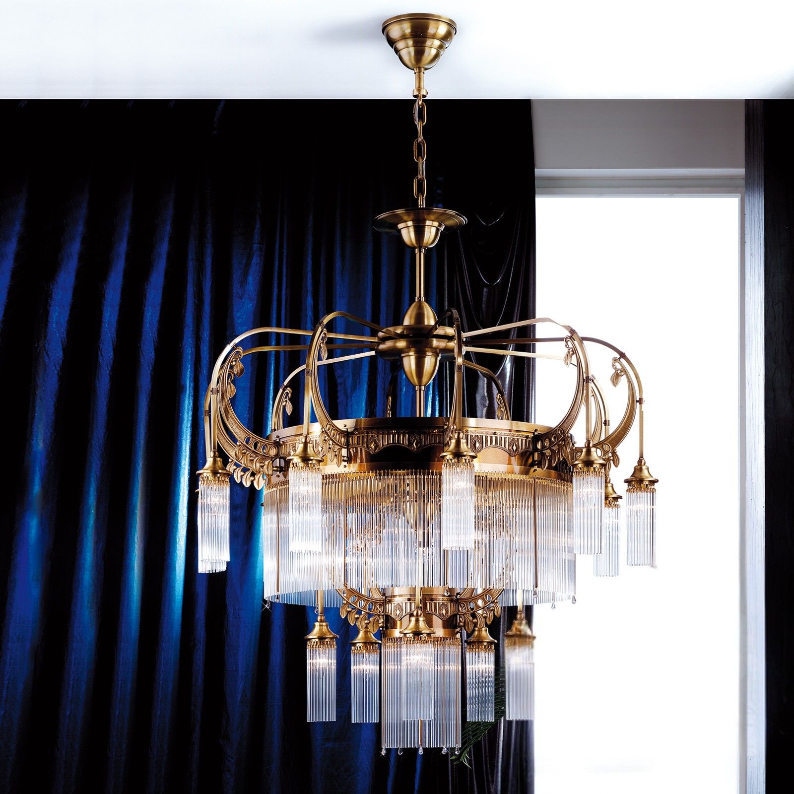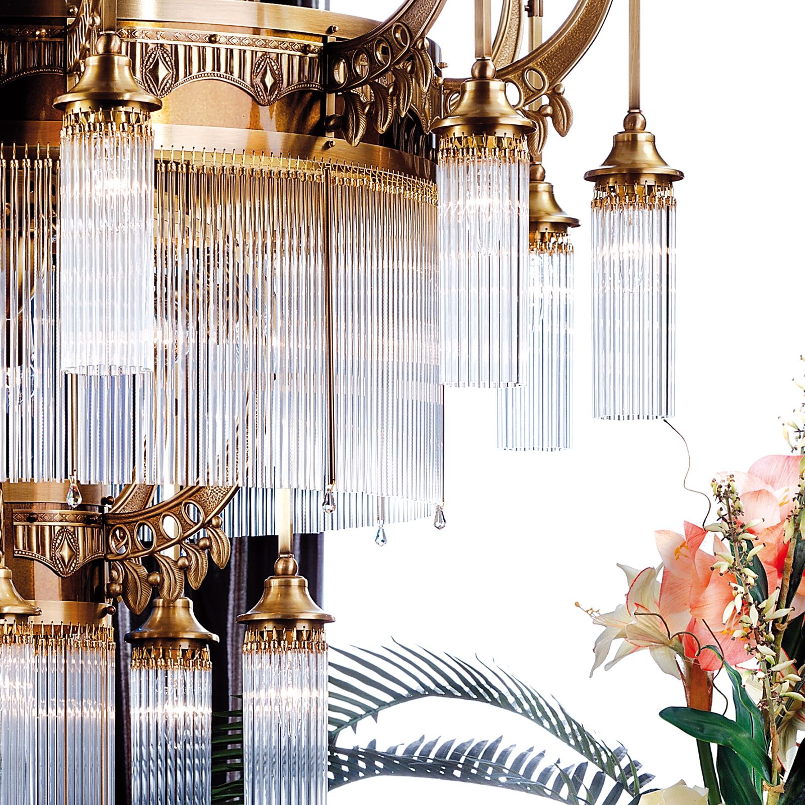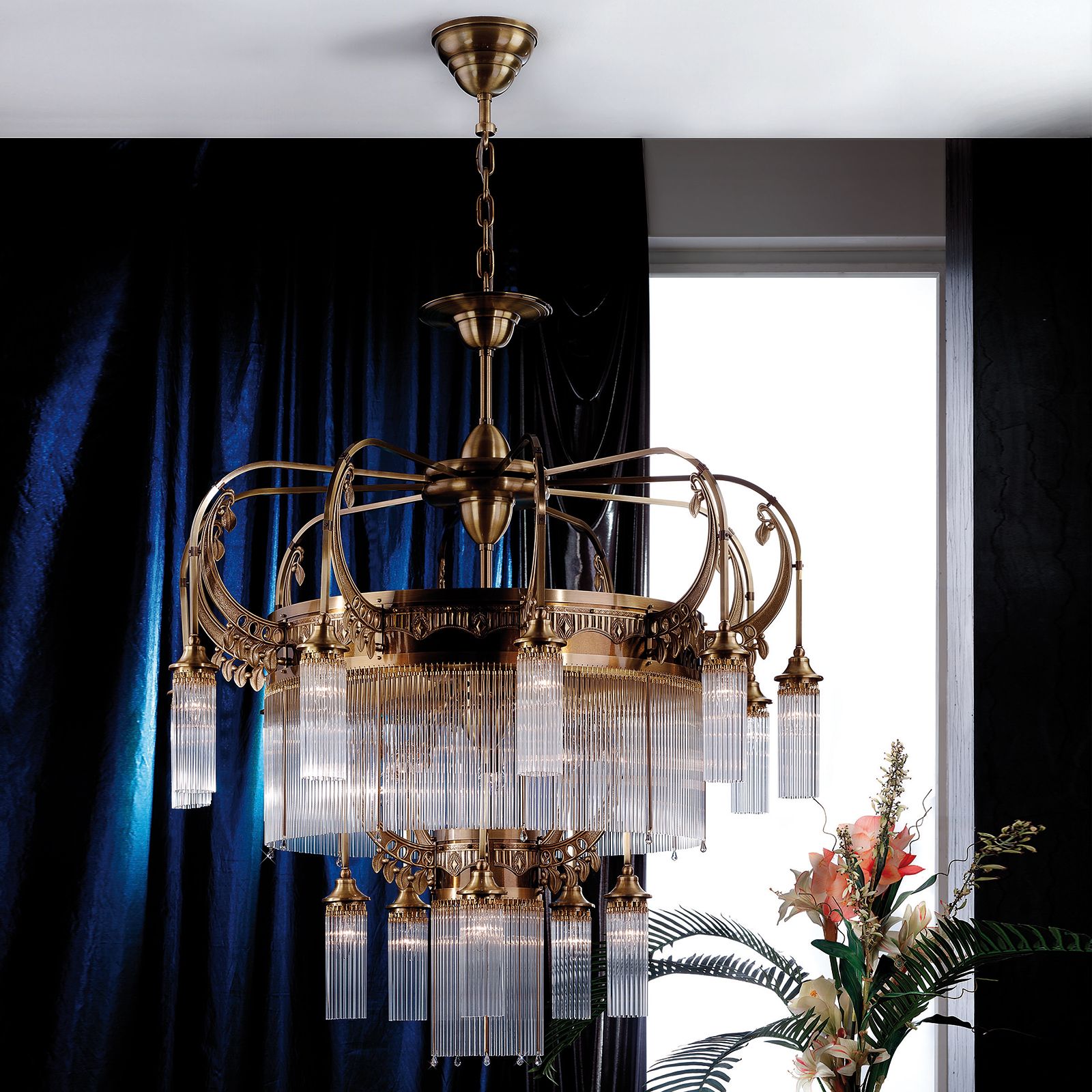 The 21-flames chandelier from the ADELE series is a magnificent furnishing jewel adequately placed in conference rooms of large law firms, foyers of a luxury hotels or in exceptionally large living rooms. The upper storey with ten flames is grouped around a large brass frieze with a curtain of solid glass rods hanging from it. Five flames within this decorative band provide additional light. Below, a group of five lamps forms a circle around a central flame. Art Deco ornaments in fine finish entwine up the arms' clasps.