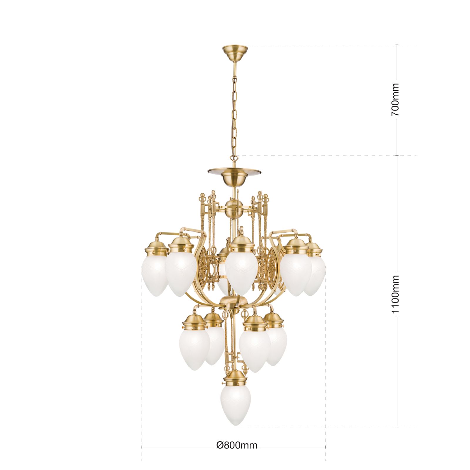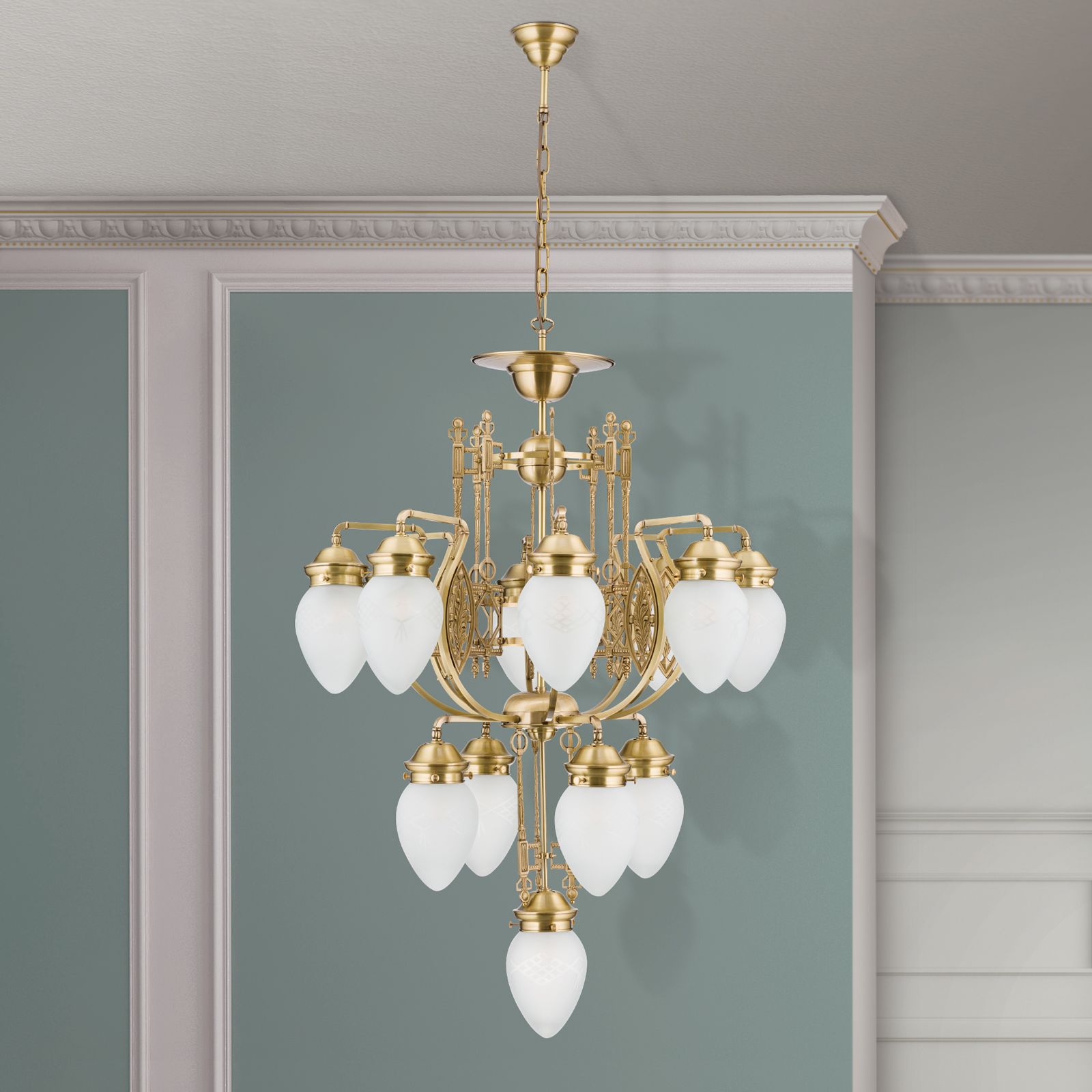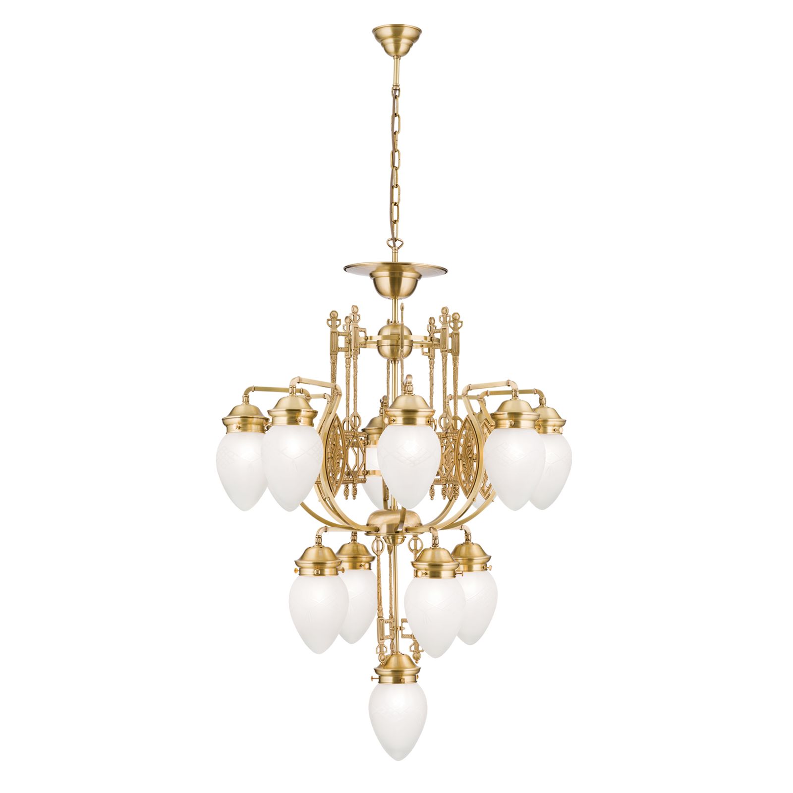 With its thirteen flames, this chandelier from the BUDAPEST series lights up even magnificent grand salons or sophisticated reception rooms. Entirely dedicated to Hungarian Art Nouveau style, the chandelier is a refreshingly original eye-catcher. Like ripe forest berries, the clear matt shades bow down from the centre of the room. A two-tier central shaft distributes two rings of light around the central light. The brass wroks' ornamental exuberance reflects the light countless times painting the ceiling with artistic shadow play. This chandelier is equipped with 13 E27 sockets for 60 watts maximum each.