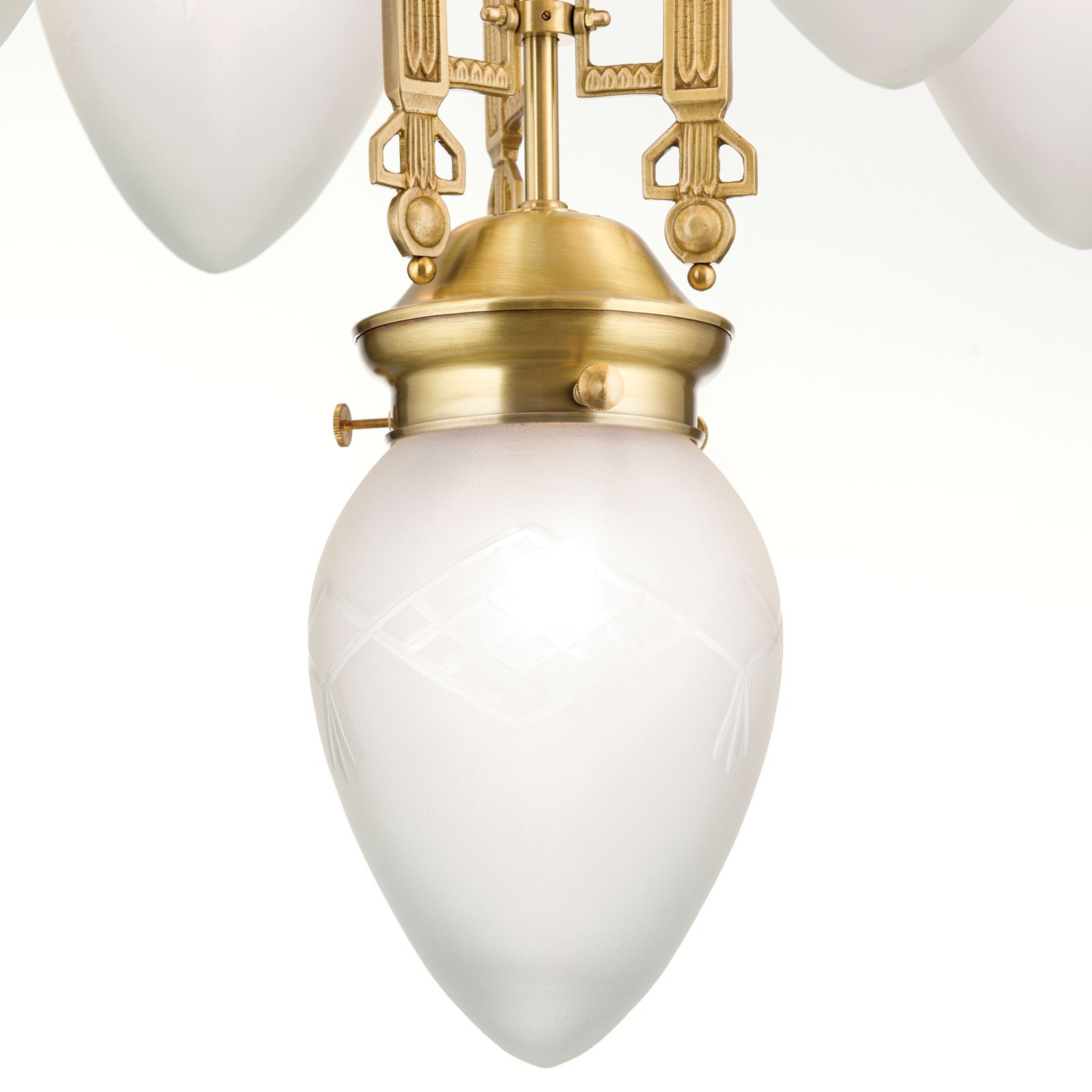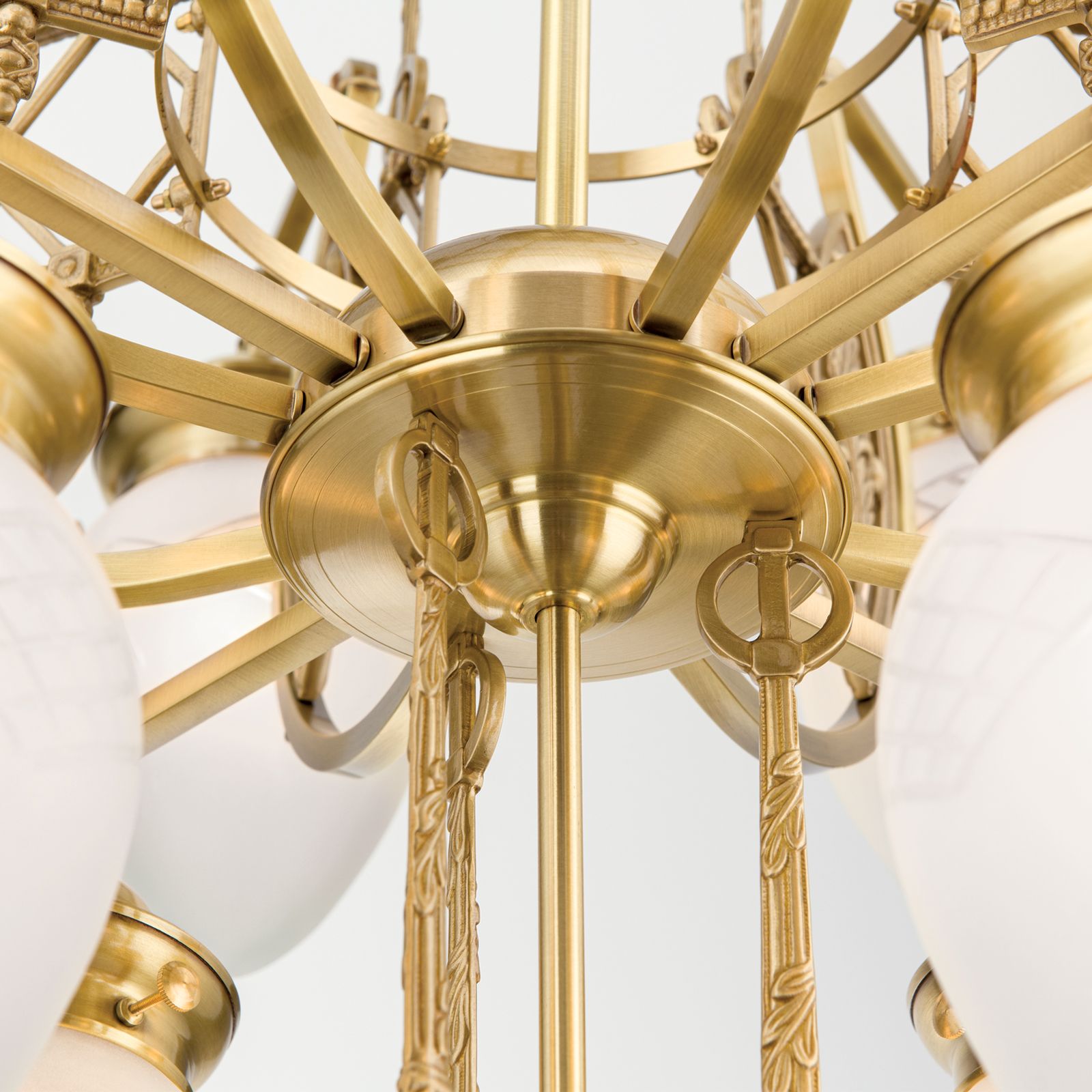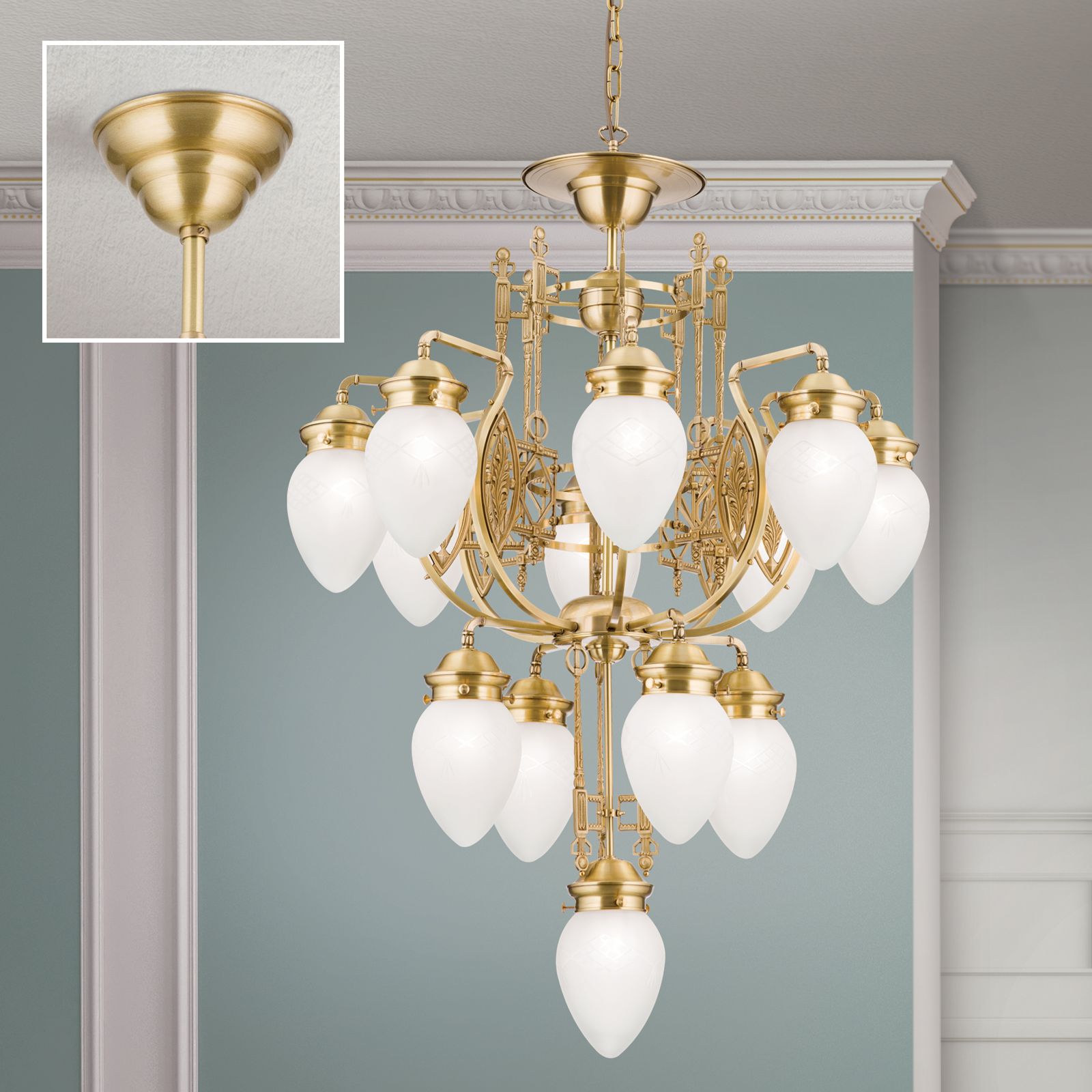 With its thirteen flames, this chandelier from the BUDAPEST series lights up even magnificent grand salons or sophisticated reception rooms. Entirely dedicated to Hungarian Art Nouveau style, the chandelier is a refreshingly original eye-catcher. Like ripe forest berries, the clear matt shades bow down from the centre of the room. A two-tier central shaft distributes two rings of light around the central light. The brass wroks' ornamental exuberance reflects the light countless times painting the ceiling with artistic shadow play. This chandelier is equipped with 13 E27 sockets for 60 watts maximum each.