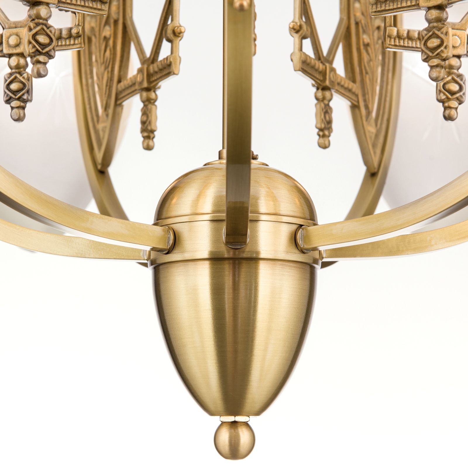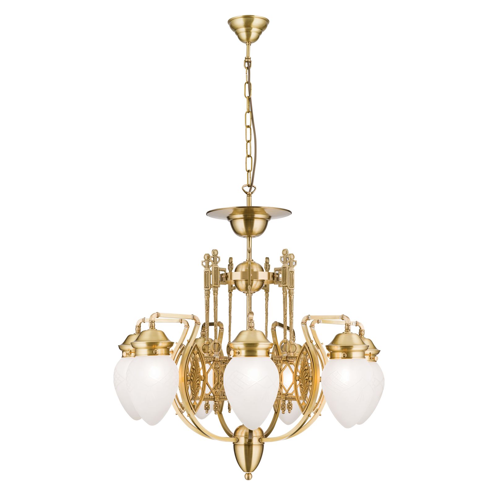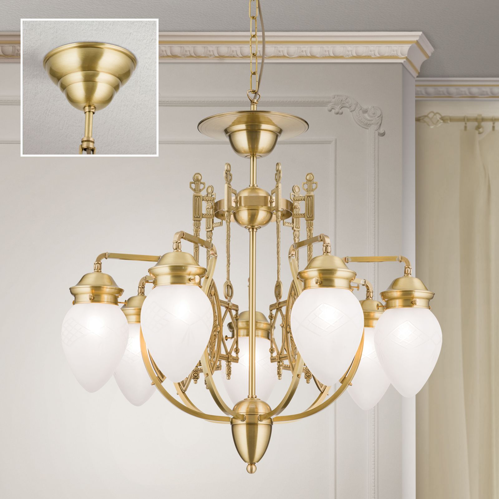 The chandelier from the BUDAPEST series is a truly "royal" furnishing object. The arrangement of its seven arms around a central column is indeed reminiscent of a crown. The column is adorned with an imperial orb with shafts that support the chadelier arms grouped around it. Artfully sweeping arches merge into helmet-shaped lamp surrounds. Unmistakably Art Nouveau-inspired ornaments - wreaths, diamonds - and historicism-style foliage round off the inventive composition.