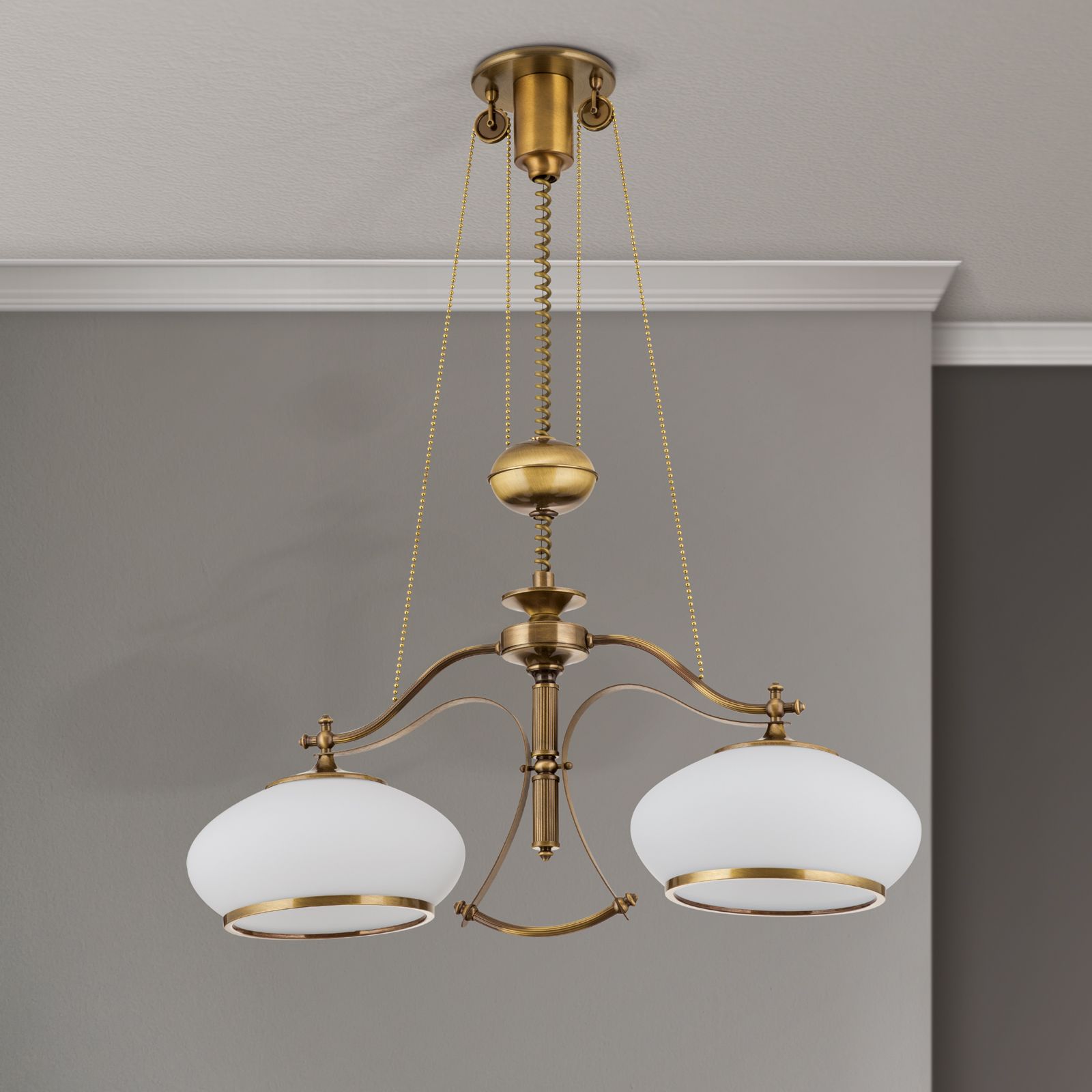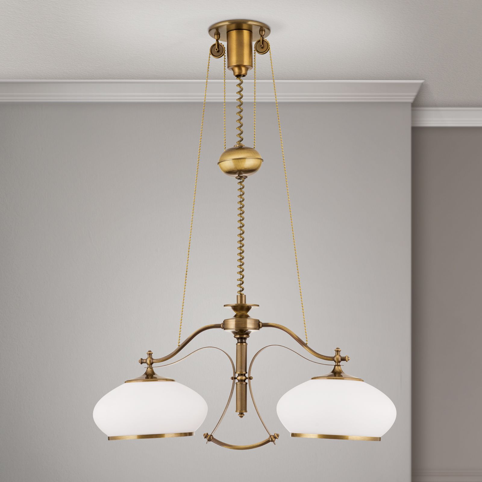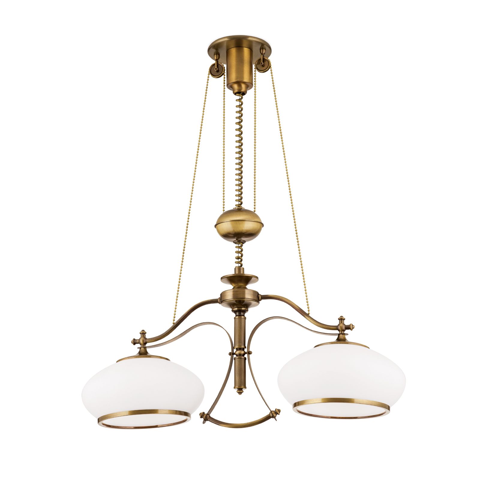 Chandelier EMPIRE, Antique Brass finish, with 2 opal glasses & pulley/weight