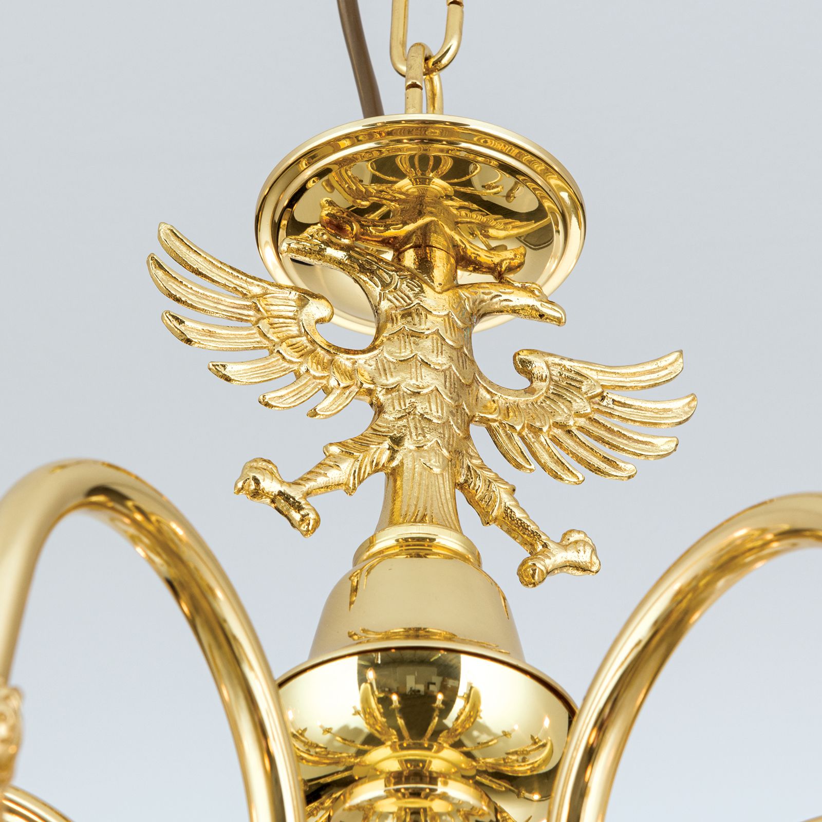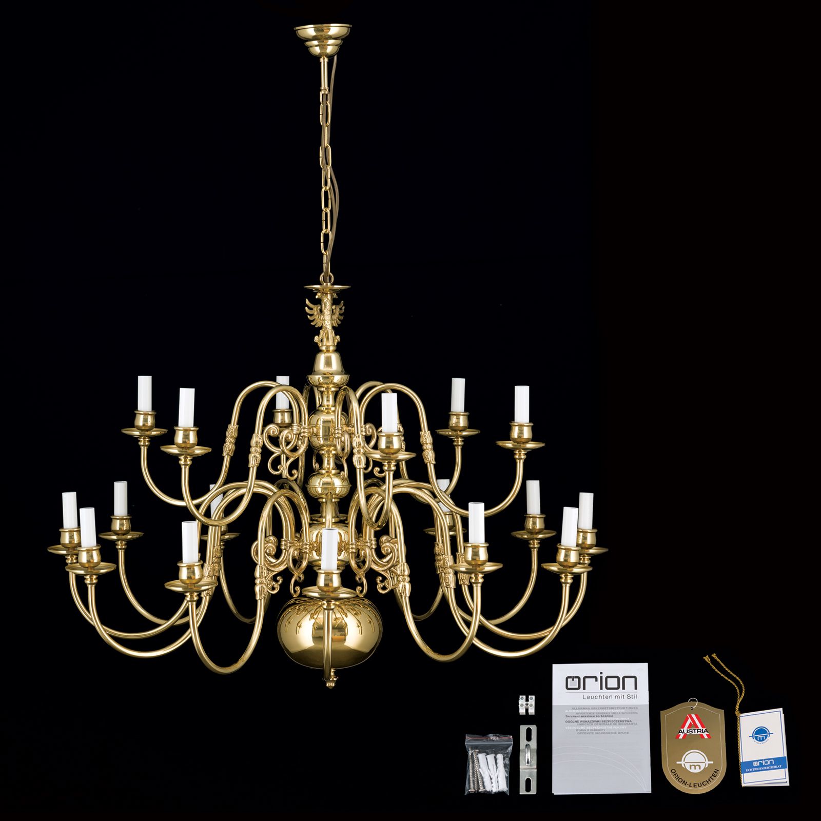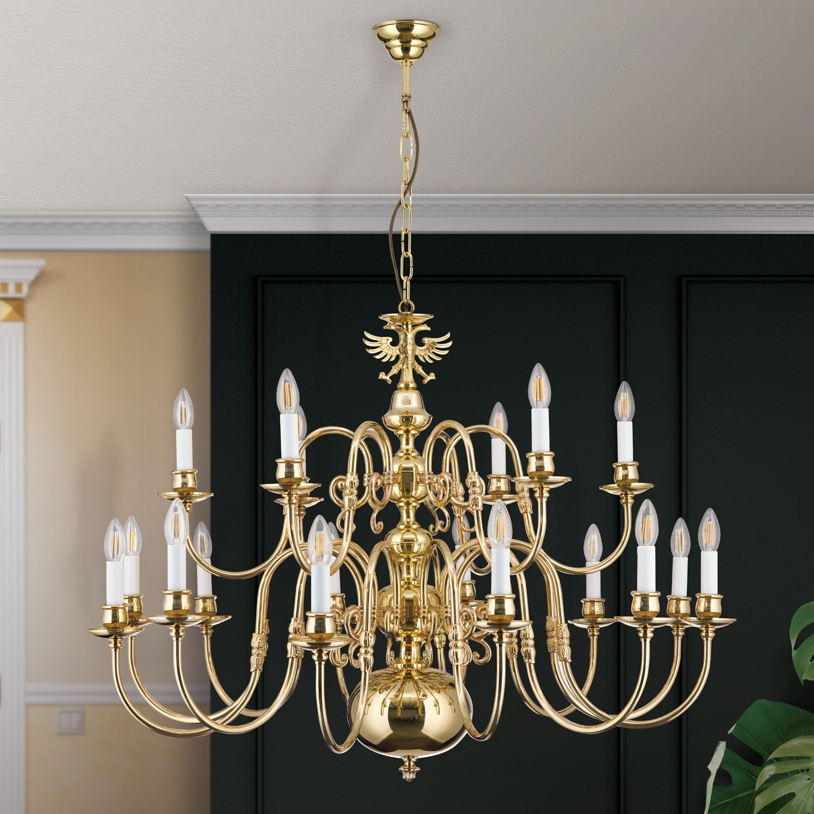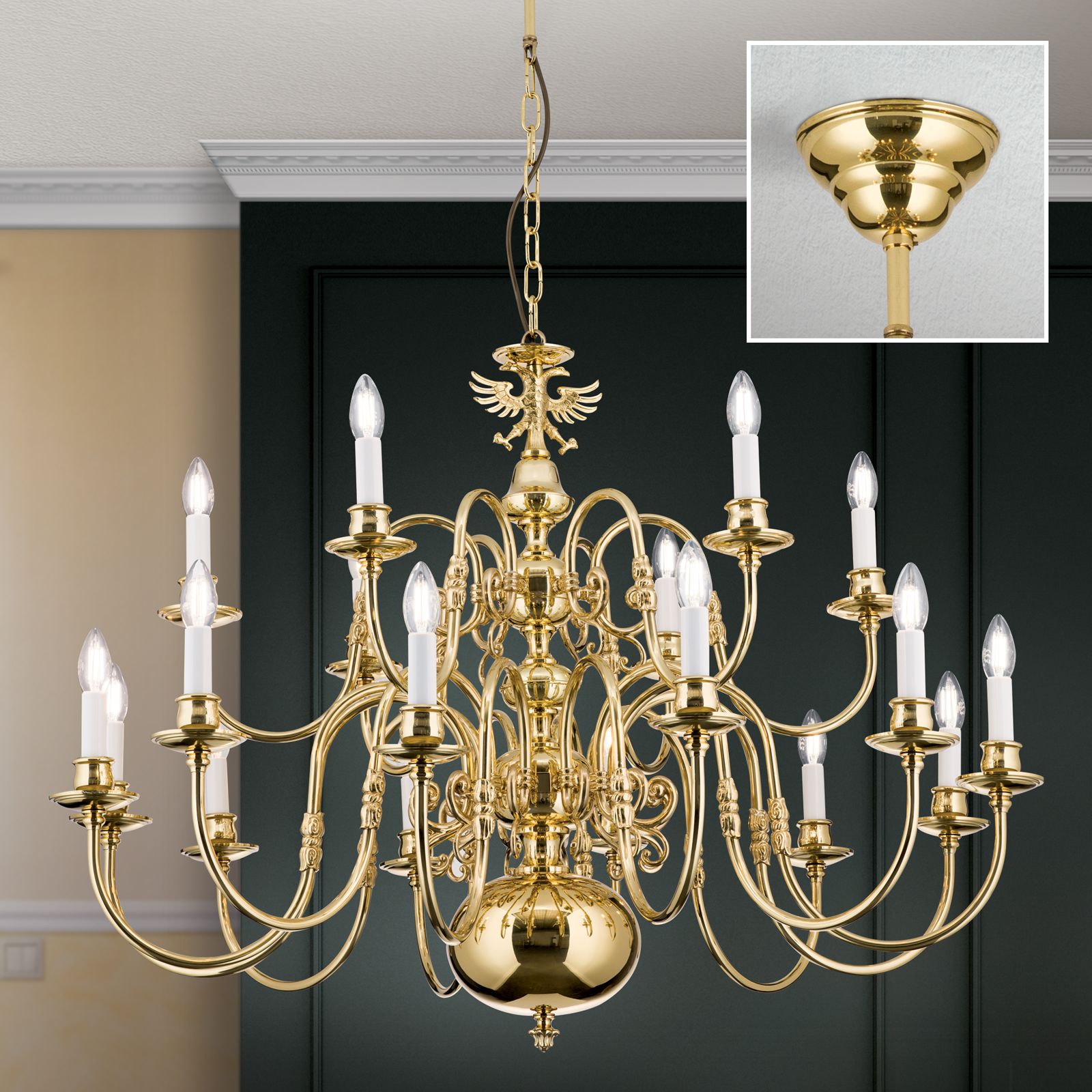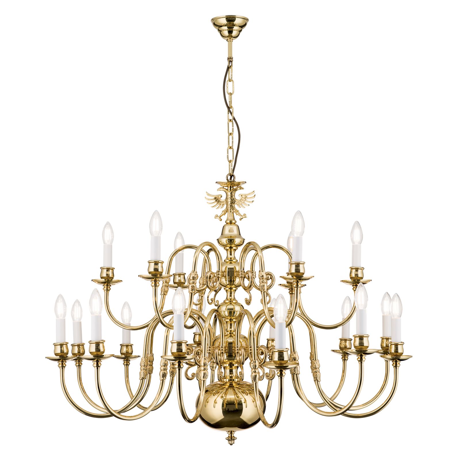 Chandelier FLÄMISCH, 12+6-flames, shiny brass, with eagle