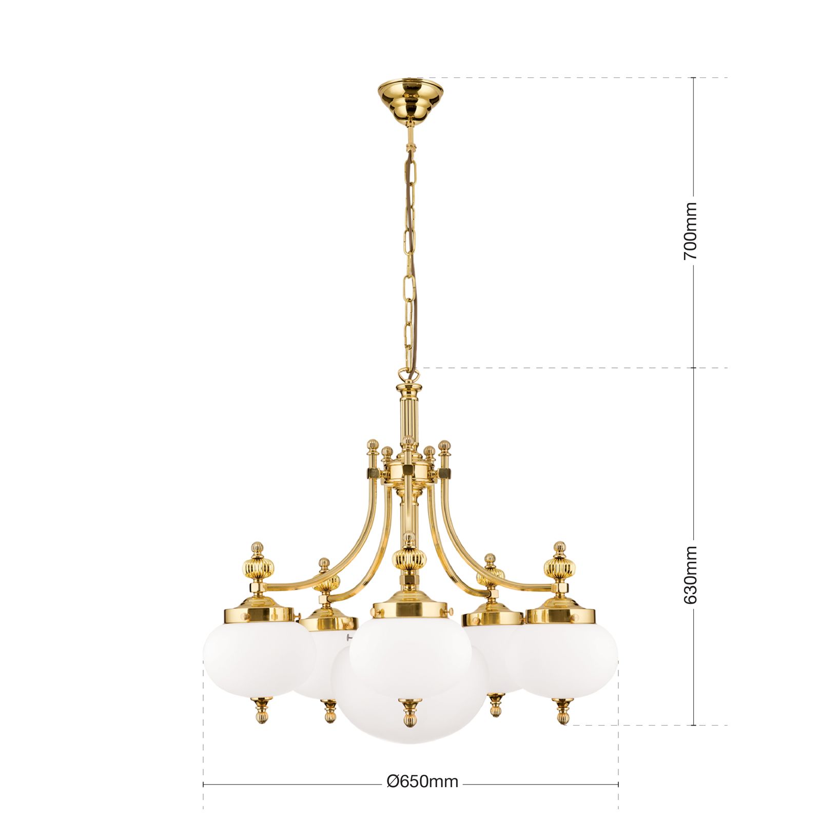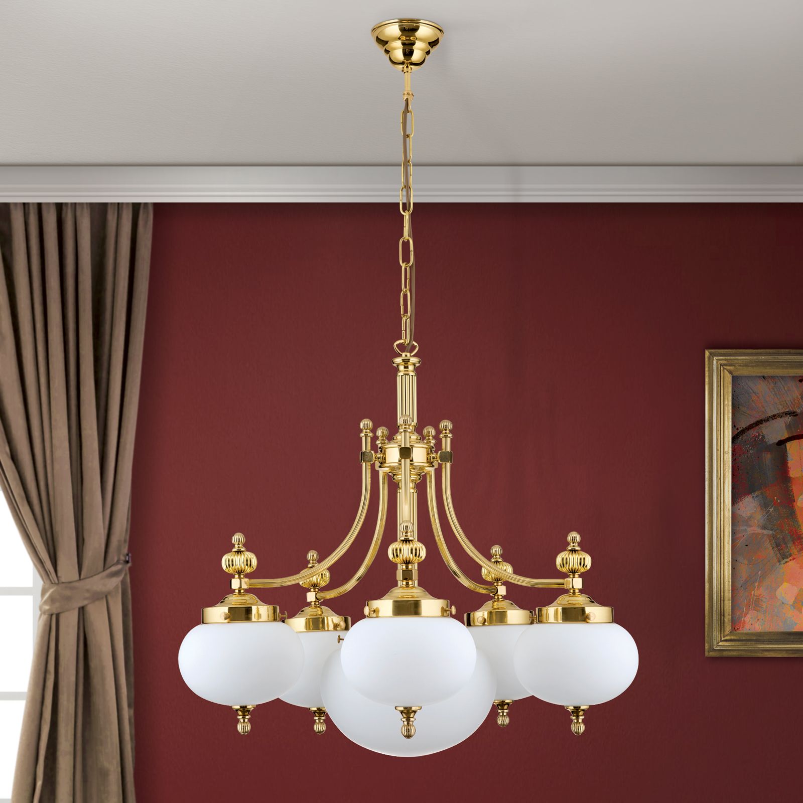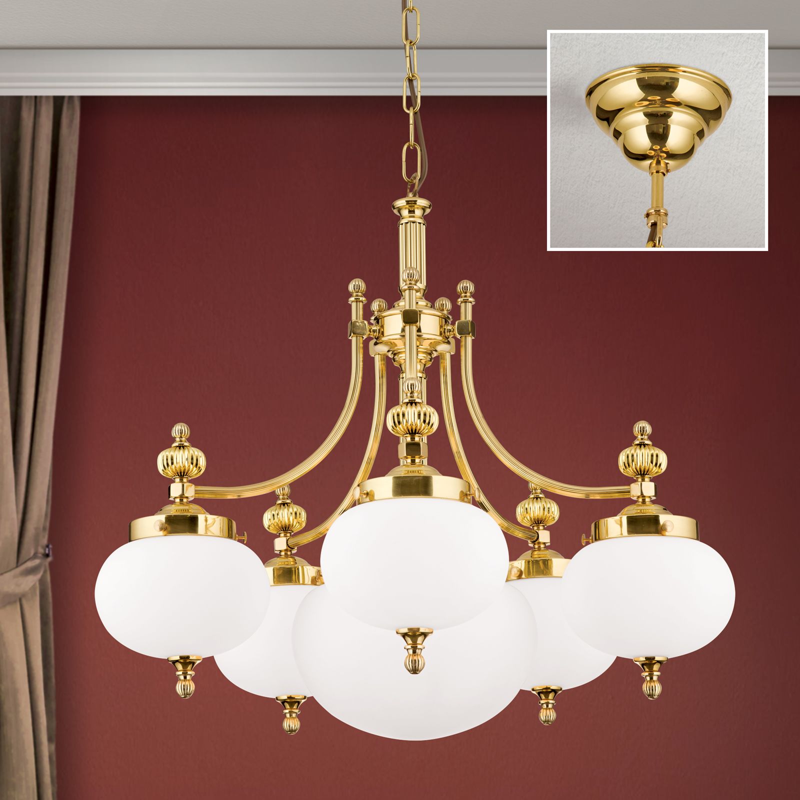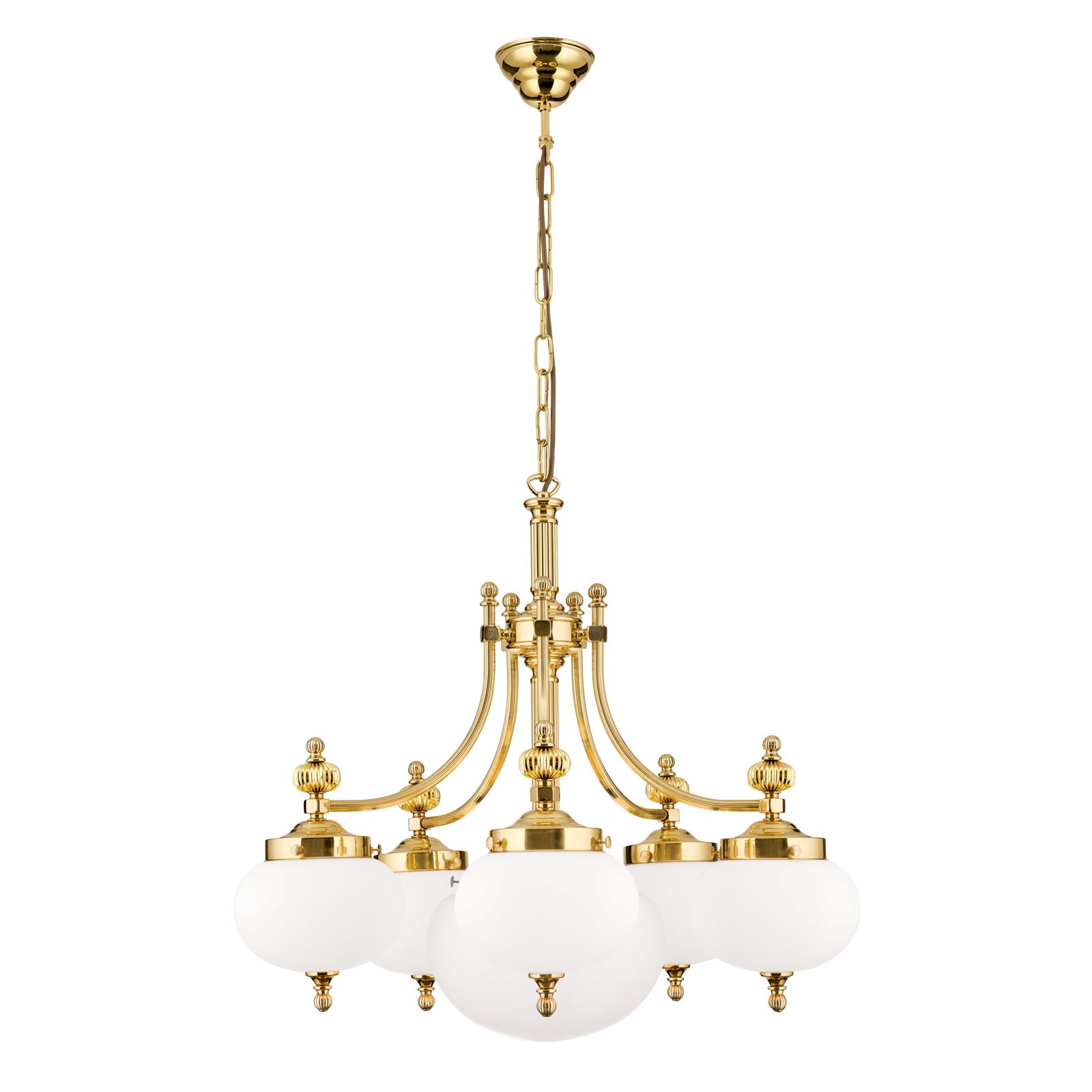 Chandelier WIENER NOSTALGIE, 5+1-lamps, shiny brass, with opal matt glass, downwards