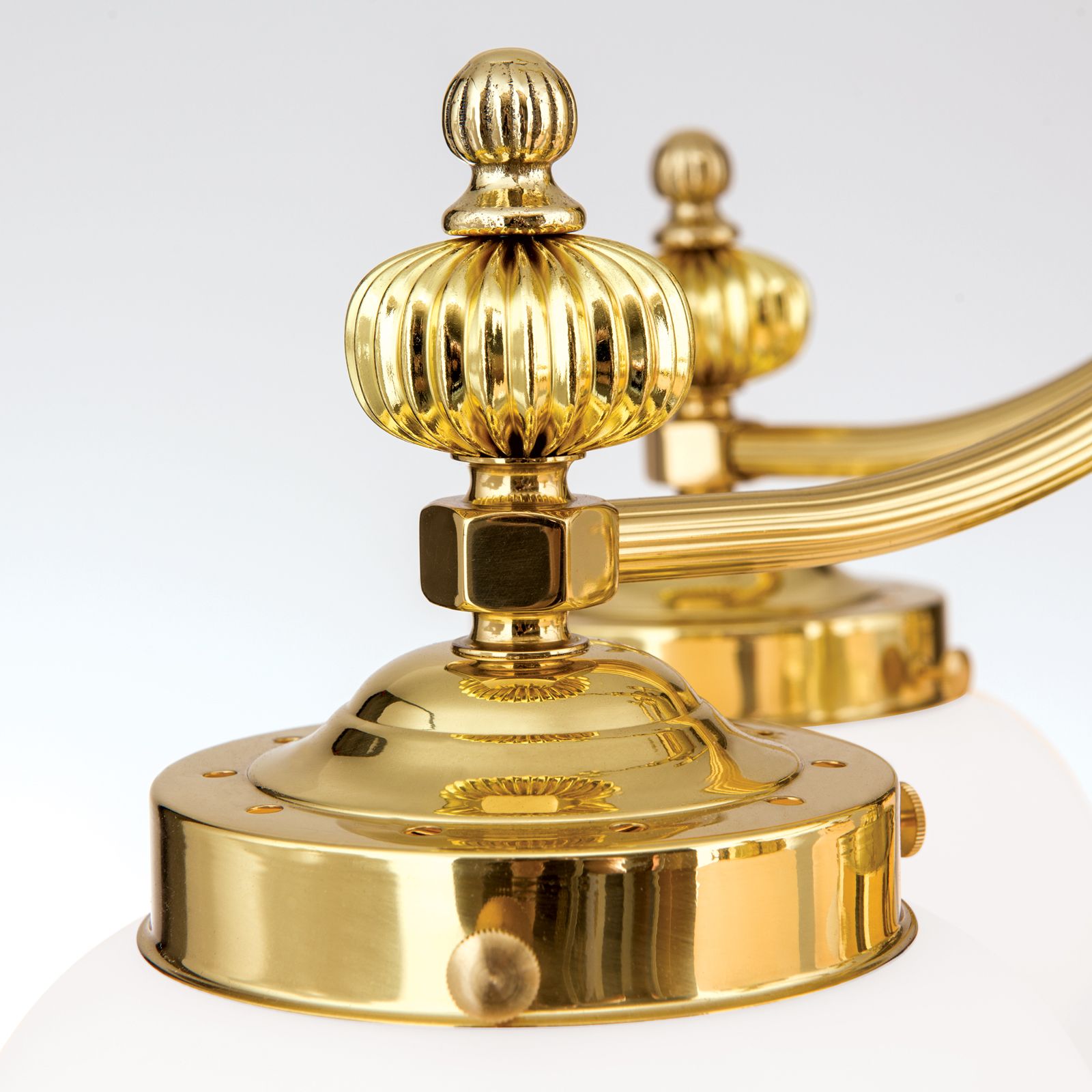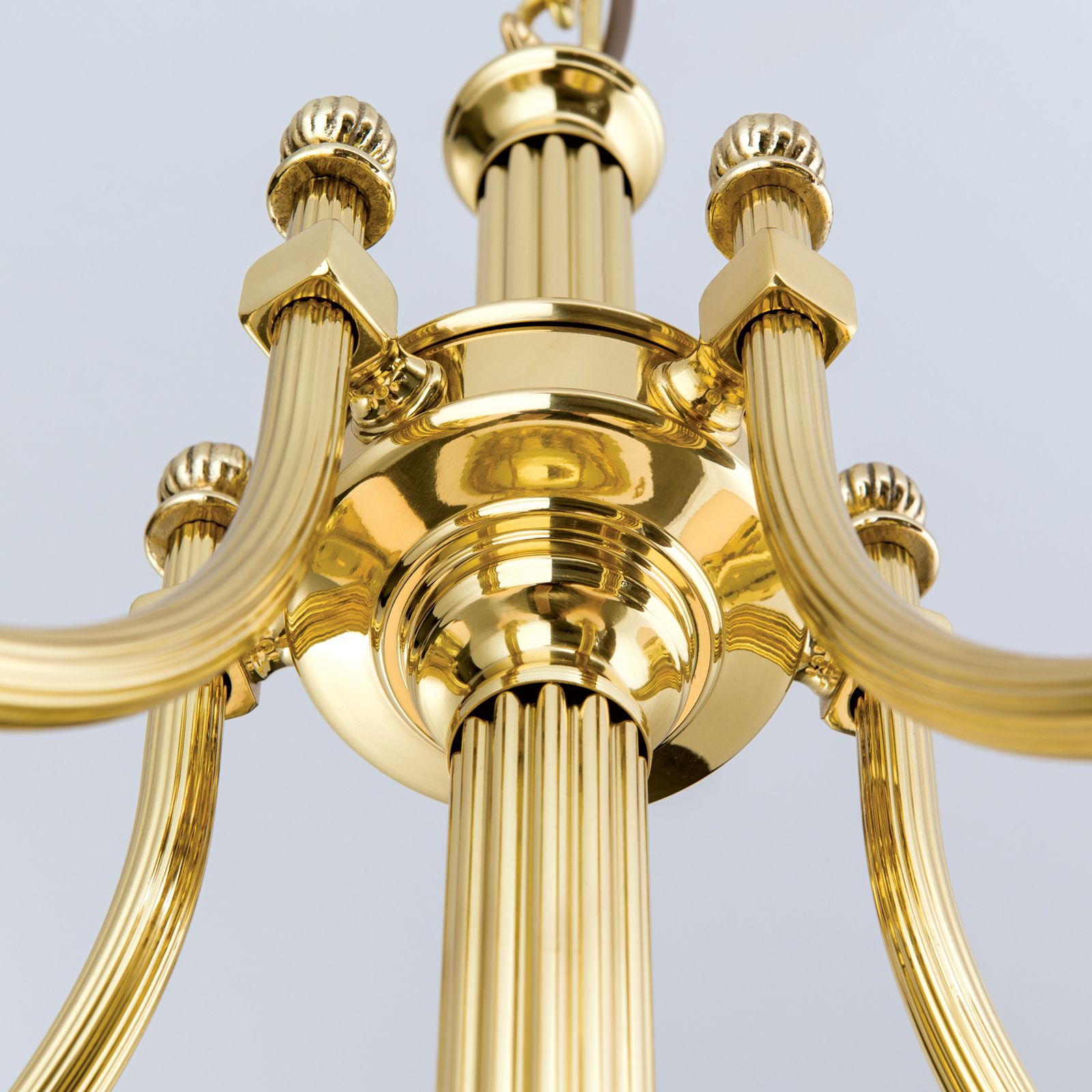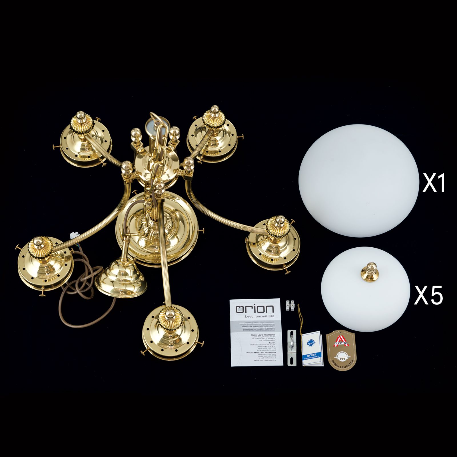 The chandeliers from the WIENER NOSTALGIE series are worthy representatives of the traditional Viennese coffee house style. The obvious need for powerful lighting is met by generously sized glass shades radiating downwards. The high-quality brass frame with fluted column and sweeping arms fades modestly into the background. The folding spheres as shade finials playfully quote the receding splendour of historic chandeliers. Its luminosity is suitable for 20 to 30 square metre rooms ranging from antique style to functional-modern. The chandelier is fitted with six E27 sockets, each with 60 watts maximum.