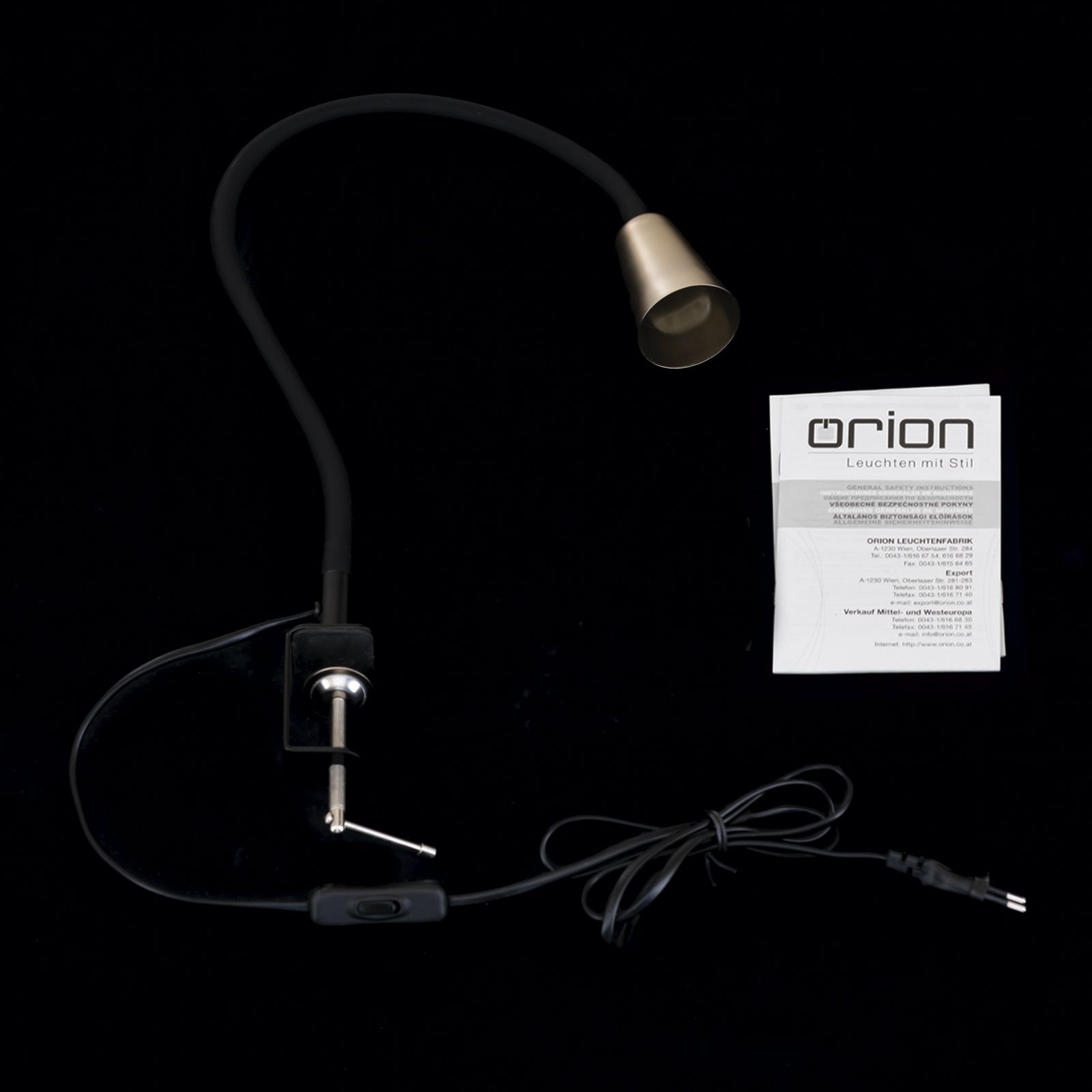 The luminaire head is available in a choice of elegant matt brass or trendy khaki and adds a special touch to any room. The sturdy metal clamp in black can be securely attached to table tops, shelves or bed frames. Thanks to the felt backing, your surface is protected from scratches. The clamping range is up to 5.5 cm.