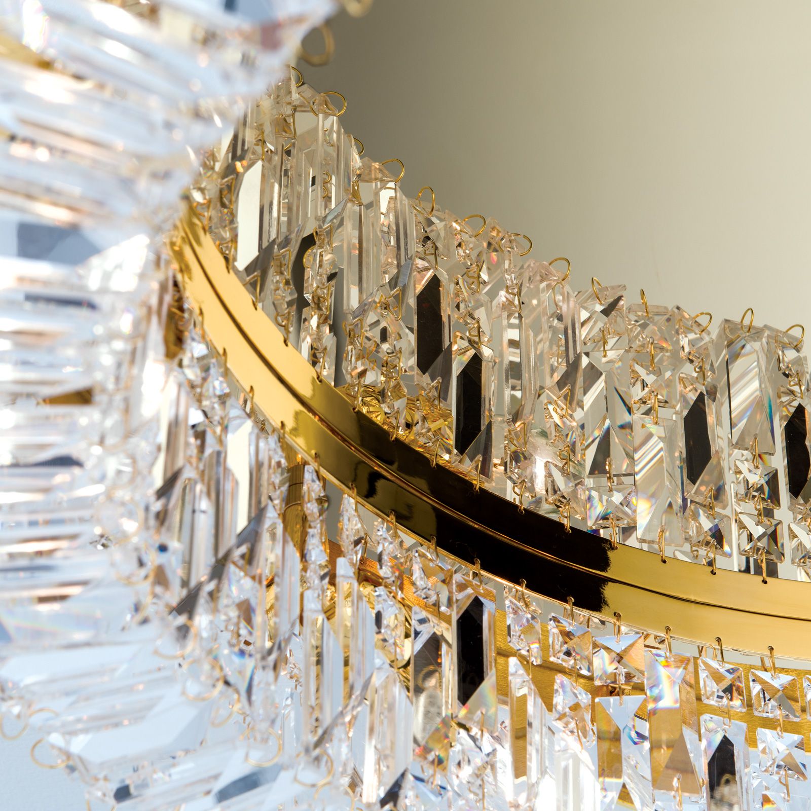 Ceiling light RING impresses with its magnificent look and brings style and elegance to every living space. This light source is ideal for upscale interior styles, where it becomes the radiant focal point of any room. With a length of 115 cm, width of 63 cm and height of 14 cm, mounting it above a cantilevered dining table is ideal. The main feature is clear crystal prisms attached to an oval brass frame. The first-class SCHÖLER CRYSTAL® crystals' reflections create unique light plays whose full splendour is not only revealed when the light is switched on. To create the perfect mood, the ceiling light is dimmable. The 12 bulbs in E14 sockets can be fitted with 40 maximum each and are fitted behind the crystals. The ceiling light is available in chrome and gold finishes.