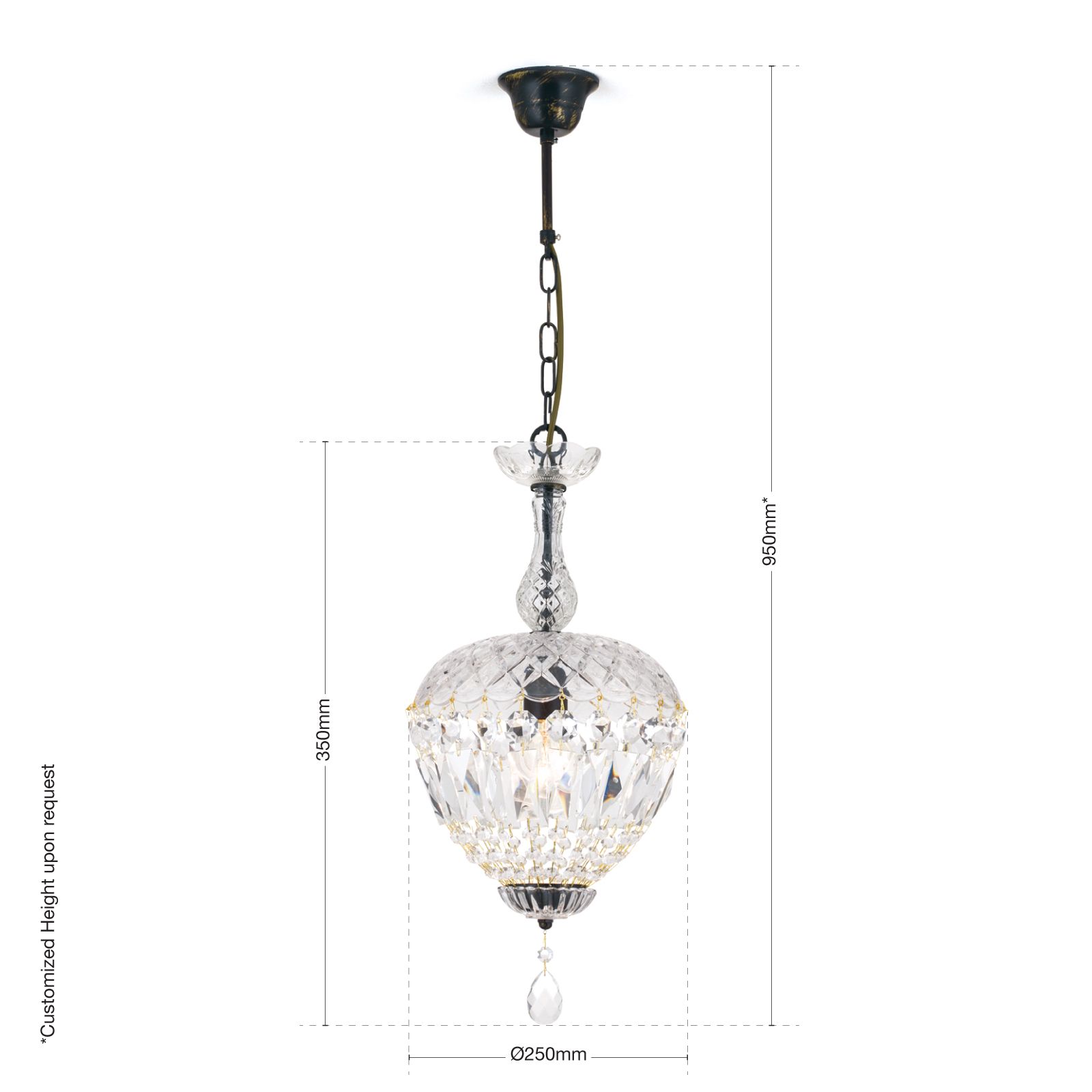 The shade contains a downward-facing E27 socket. A clear glass halogen lamp is perfect to show off the lighting effects of the crystal.