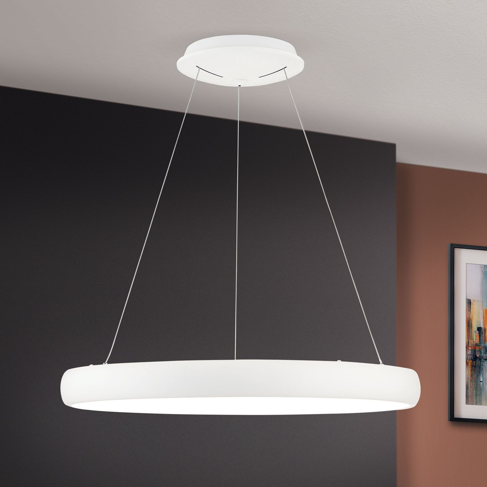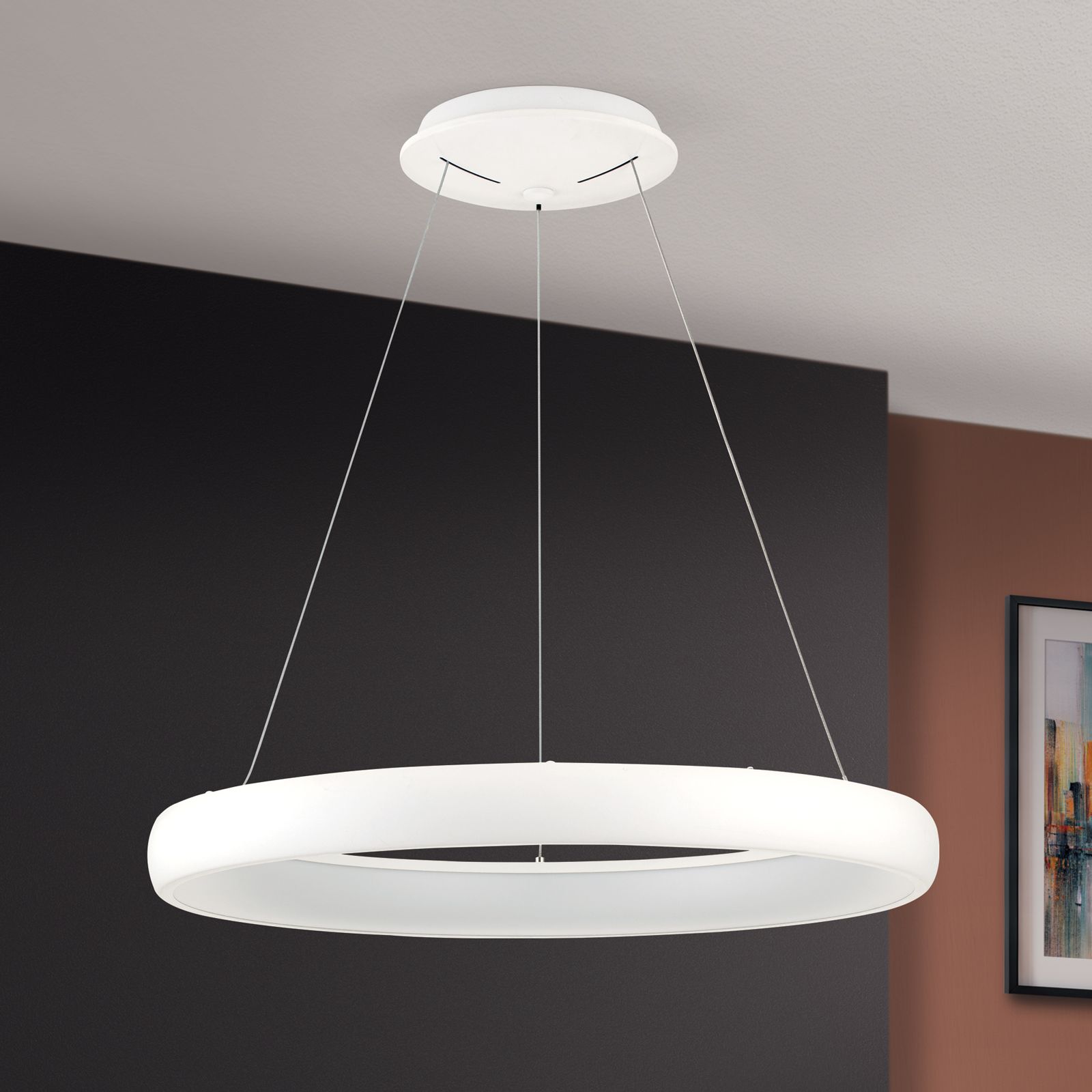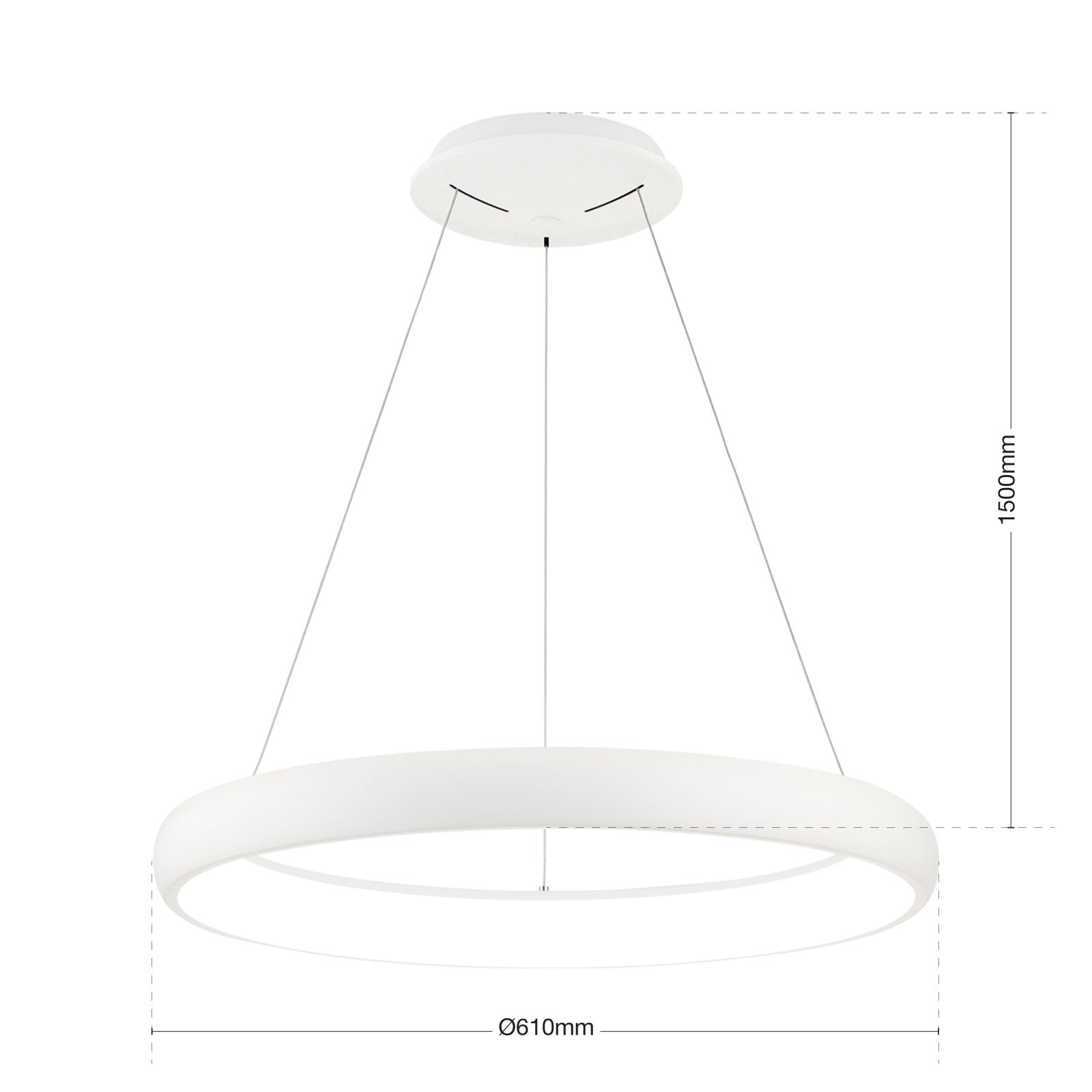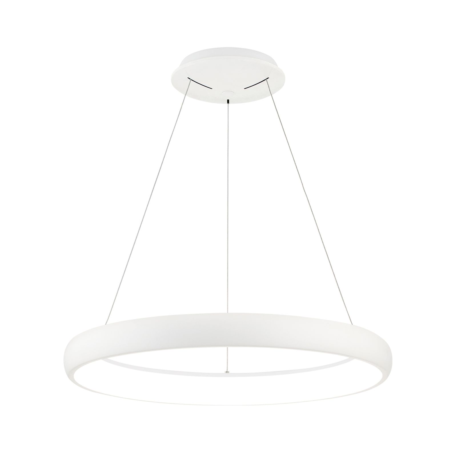 Pendant lamp VENUS is a modern purist light source in the form of a ring. Due to the simple design, it is suitable for use in many living spaces. Above a dining table, in the living room and bedroom or above the conference table in the office, it illuminates the desired area wonderfully without dazzling, because the illuminant is inside. The stylish, minimalist ring is held by three filigree wire ropes attached to a round base. Equipped with modern LED technology and a light output of 2750 lumens, it emits warm white light to the room and creates a pleasant ambience. If desired, the light can be regulated in brightness with the help of a phase cut dimmer or LED dimmer.