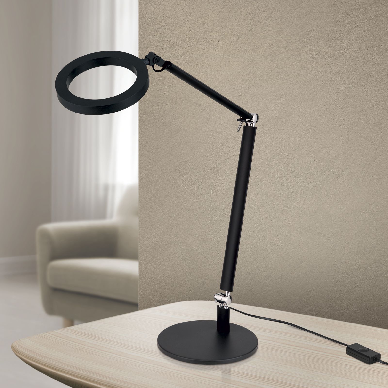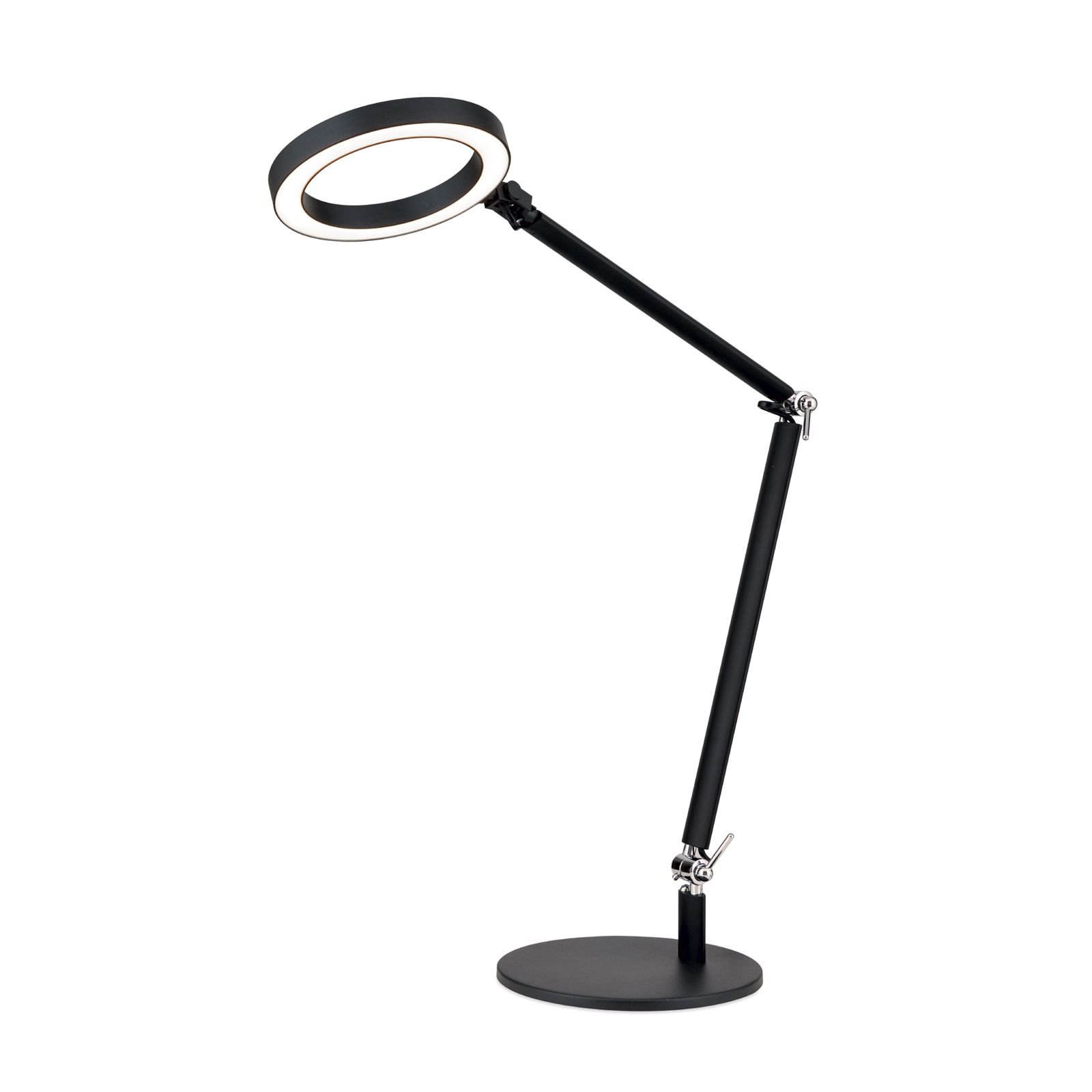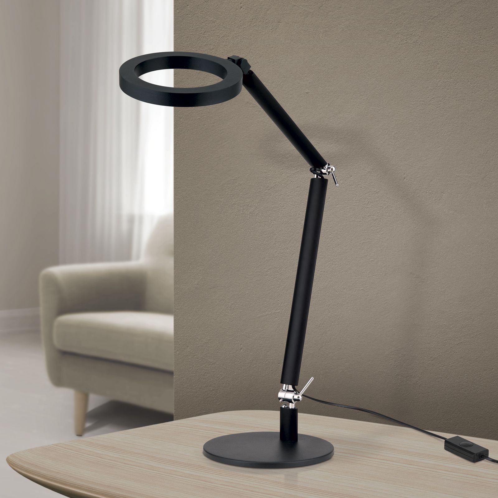 The RINGO LED table lamp is not just a light source, but also a stylish element for your home or office. Its modern design in black and the flexible chrome joints make it possible to adjust the height of the light from 40 cm to 75 cm.