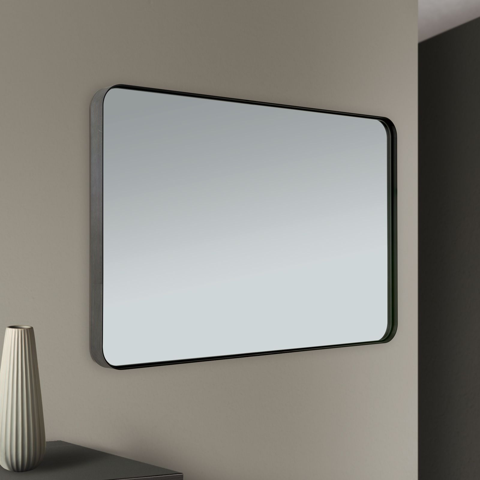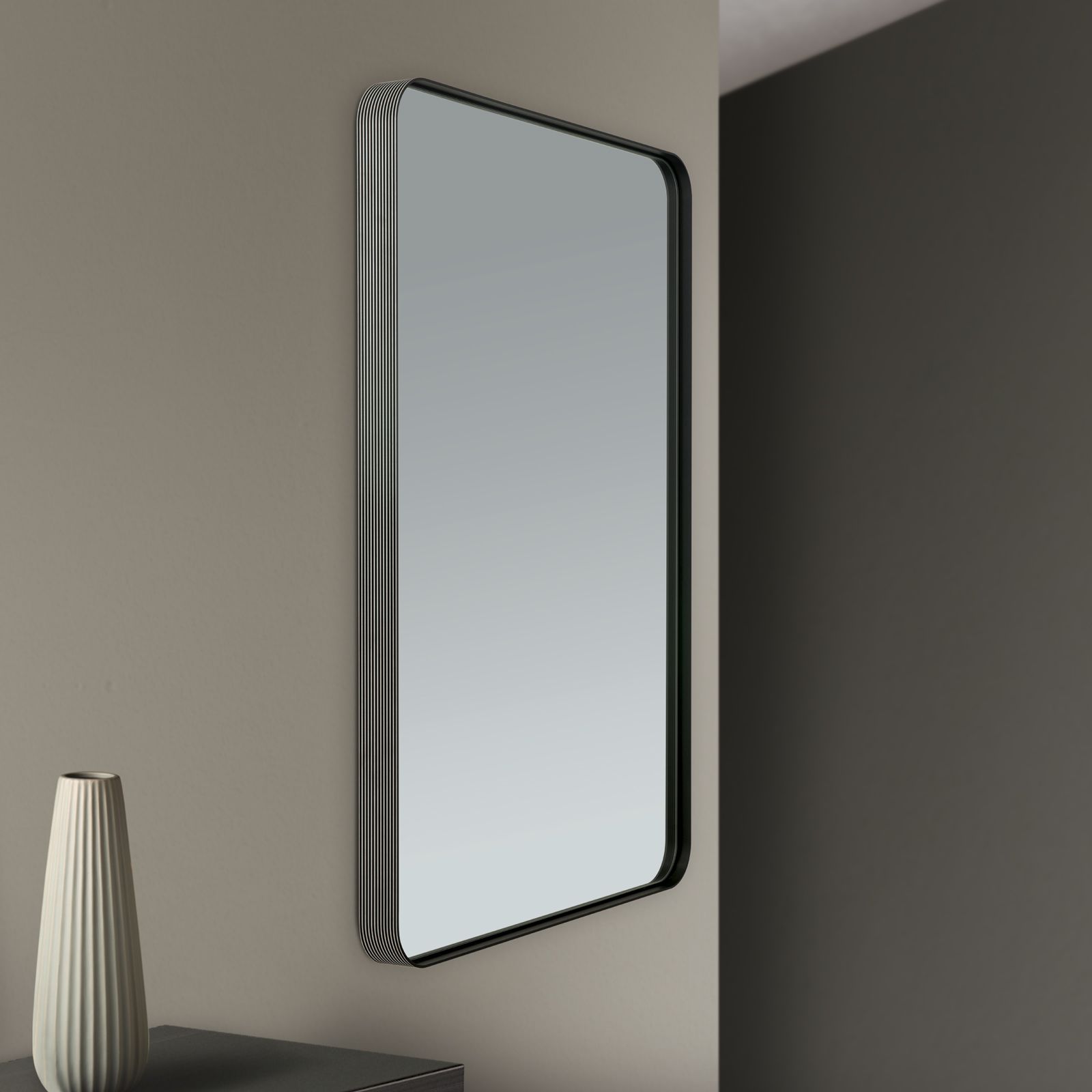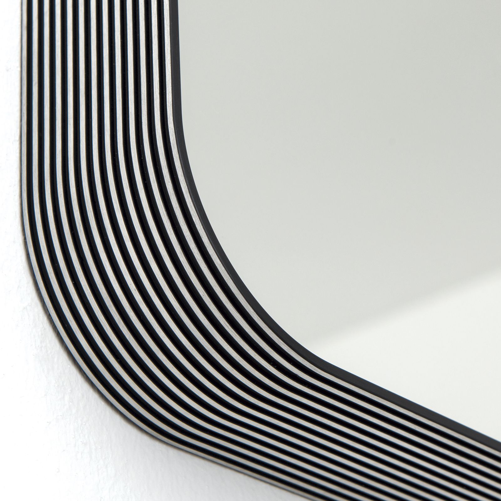 The frame of the mirror is made of robust aluminium, which ensures durability and stability. A special highlight are the fine grooves in the profile, which create a fascinating dark/light shade. This detail gives the mirror a sophisticated look and makes it a real eye-catcher.