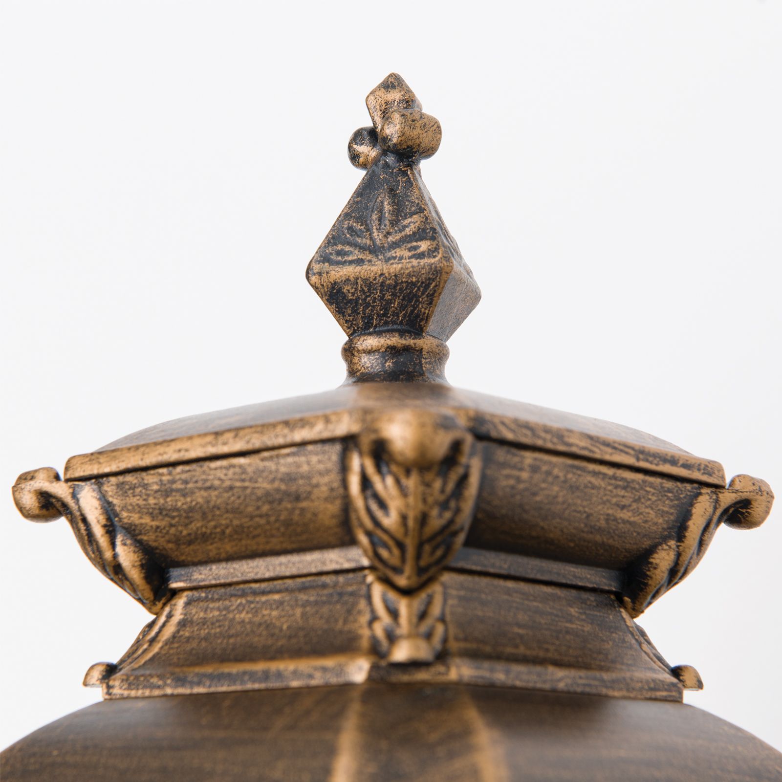 The cast silumin is refined by a stove-enamelled, hand-wiped patina finish redendering it particularly corrosion-resistant with an antique look. It is available with a suspended or upright lantern mounted on a decorative plate.