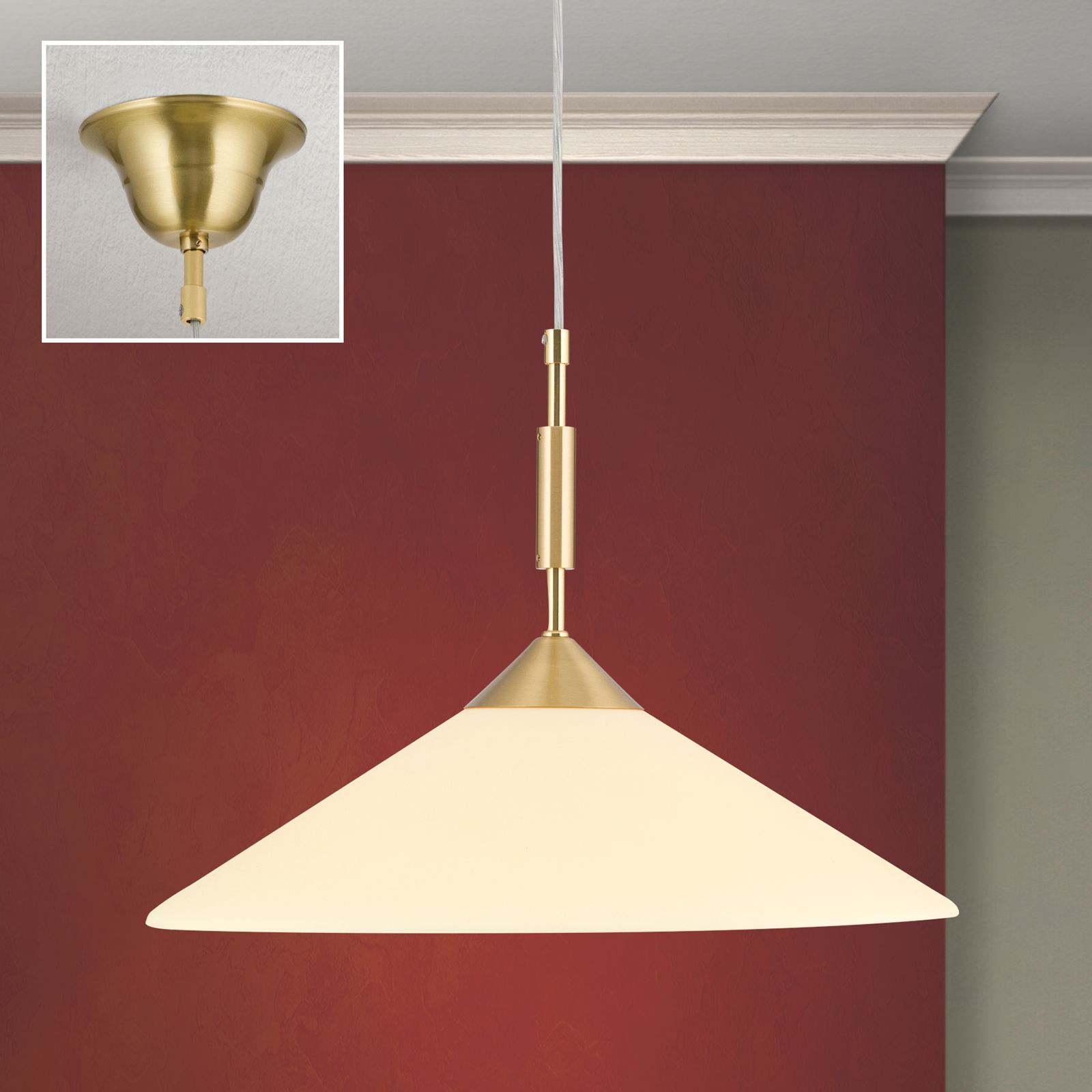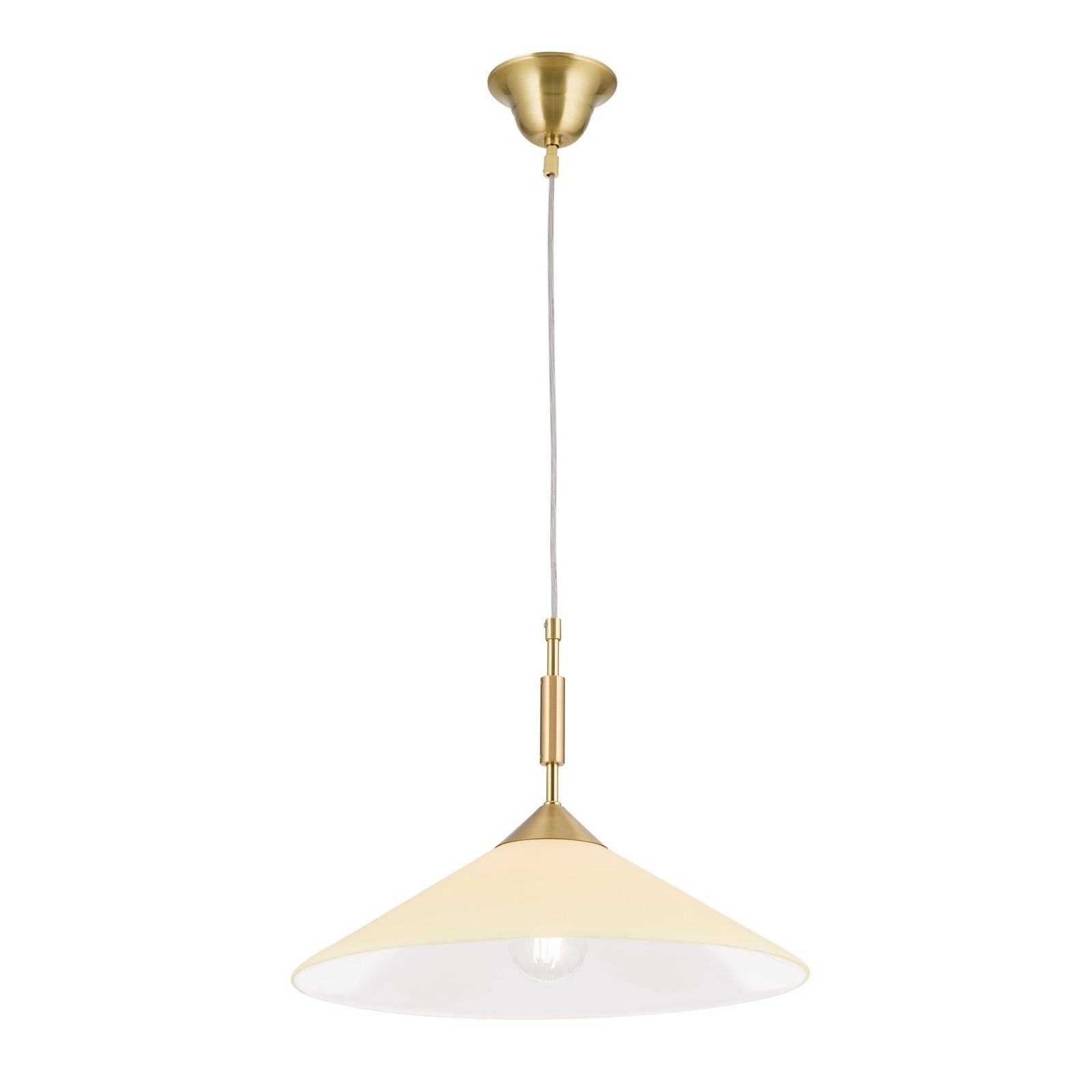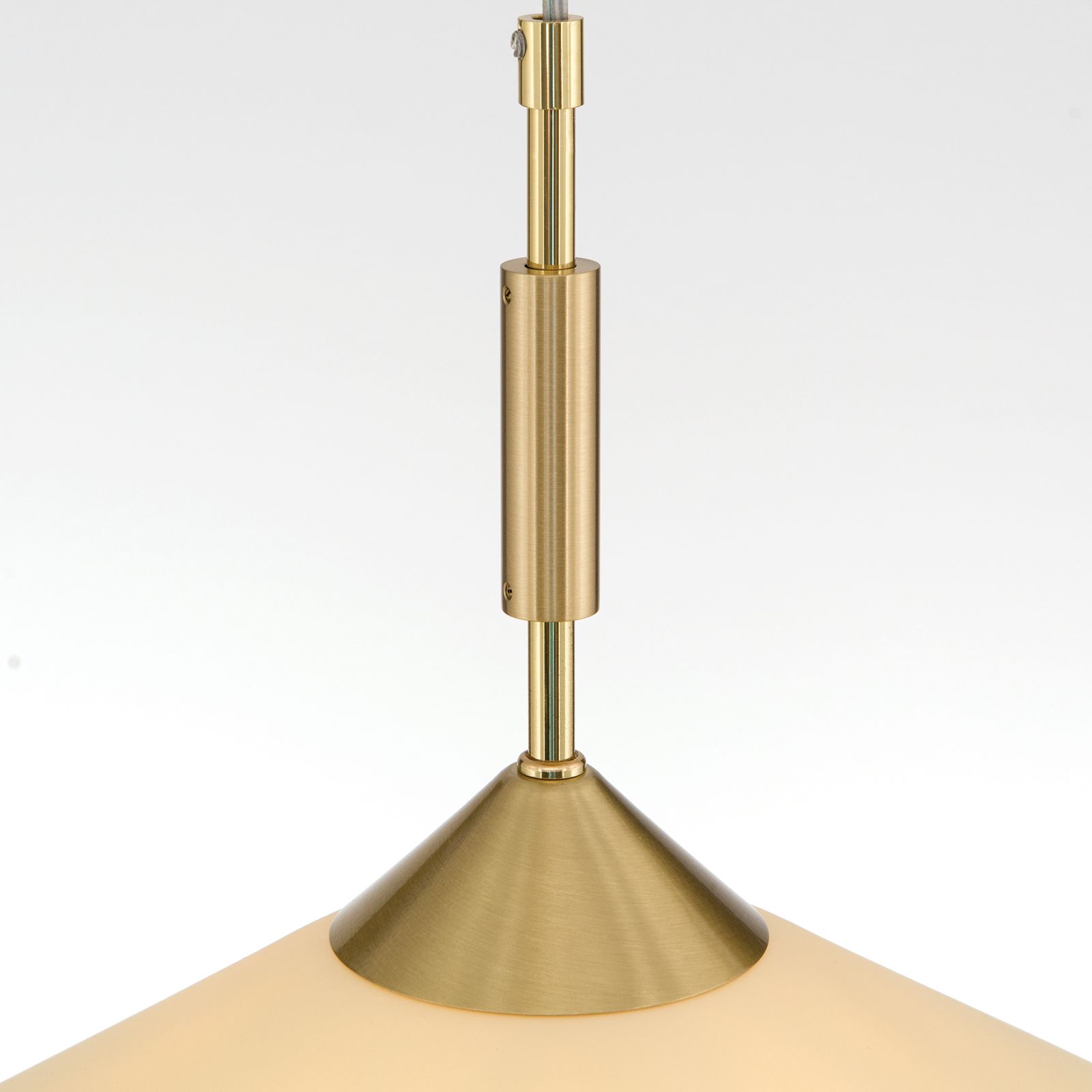 The luminaire mount is made of brass available in a version with matt brass finish and champagne-coloured cone glass, as well as with satinated finish with opal glass. The pendant lamp is equipped with an E27 socket for 75 watts maximum. LED mirror head bulbs are not only visually harmonious, they also prevent glare from the illuminant.