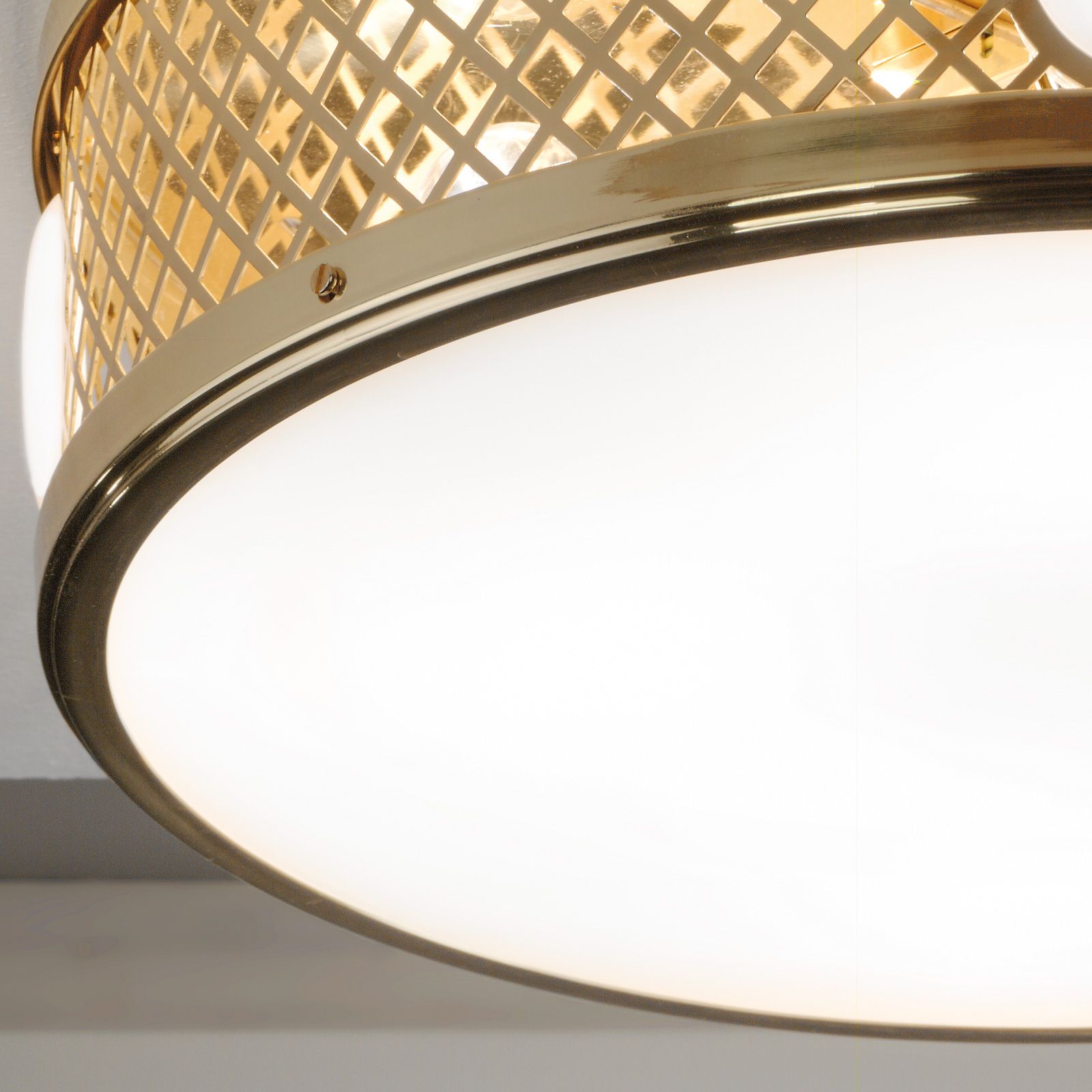 It borrows from wall and ceiling lights by "Wiener Werkstätte" - Vienna Workshop - but interprets its traditional design elements such as grids and appliqués in its own right. The all-round, brass-finished lattice with decorative stones artfully uses its entire height as shiny reflector and decorative body, creating an exciting light and shadow play.