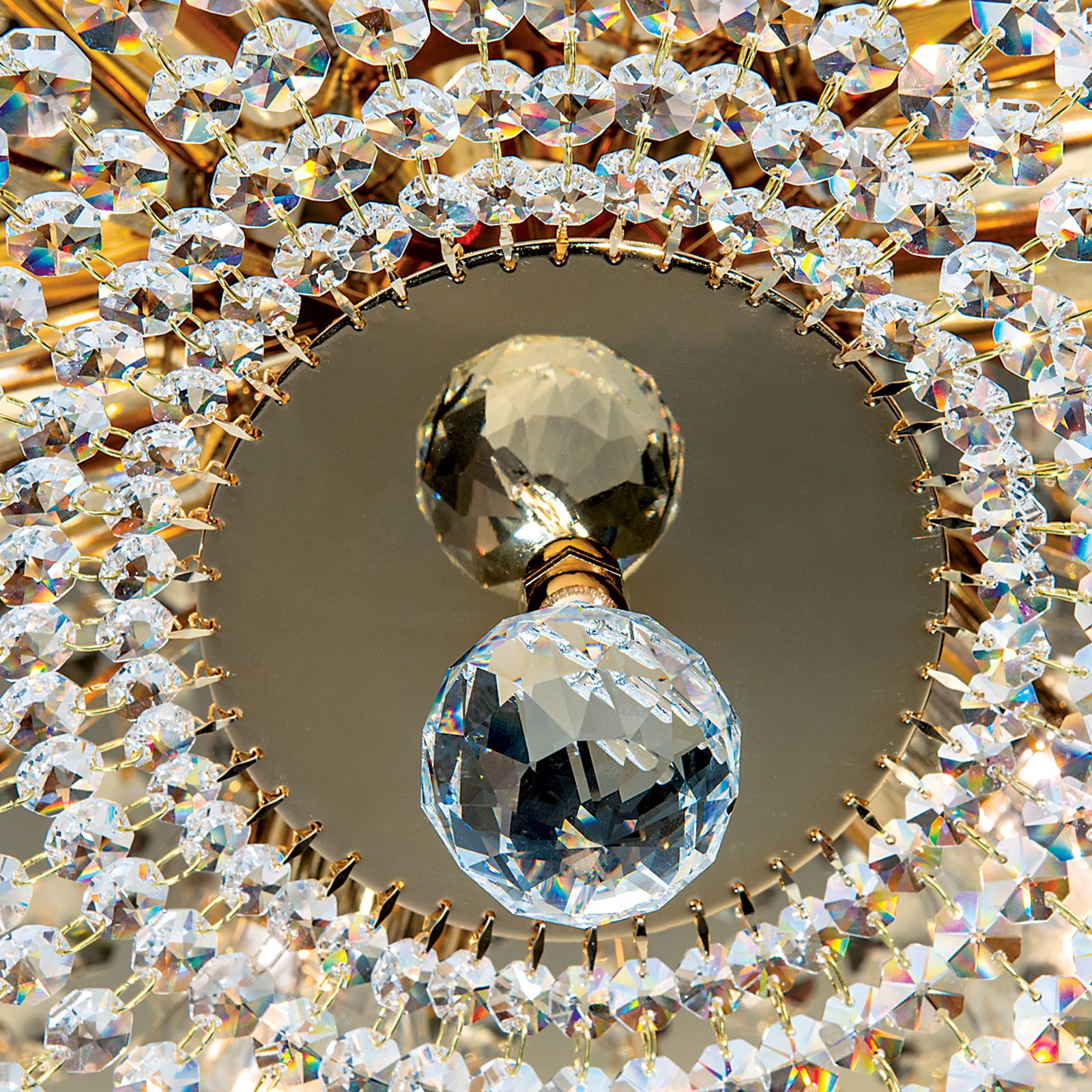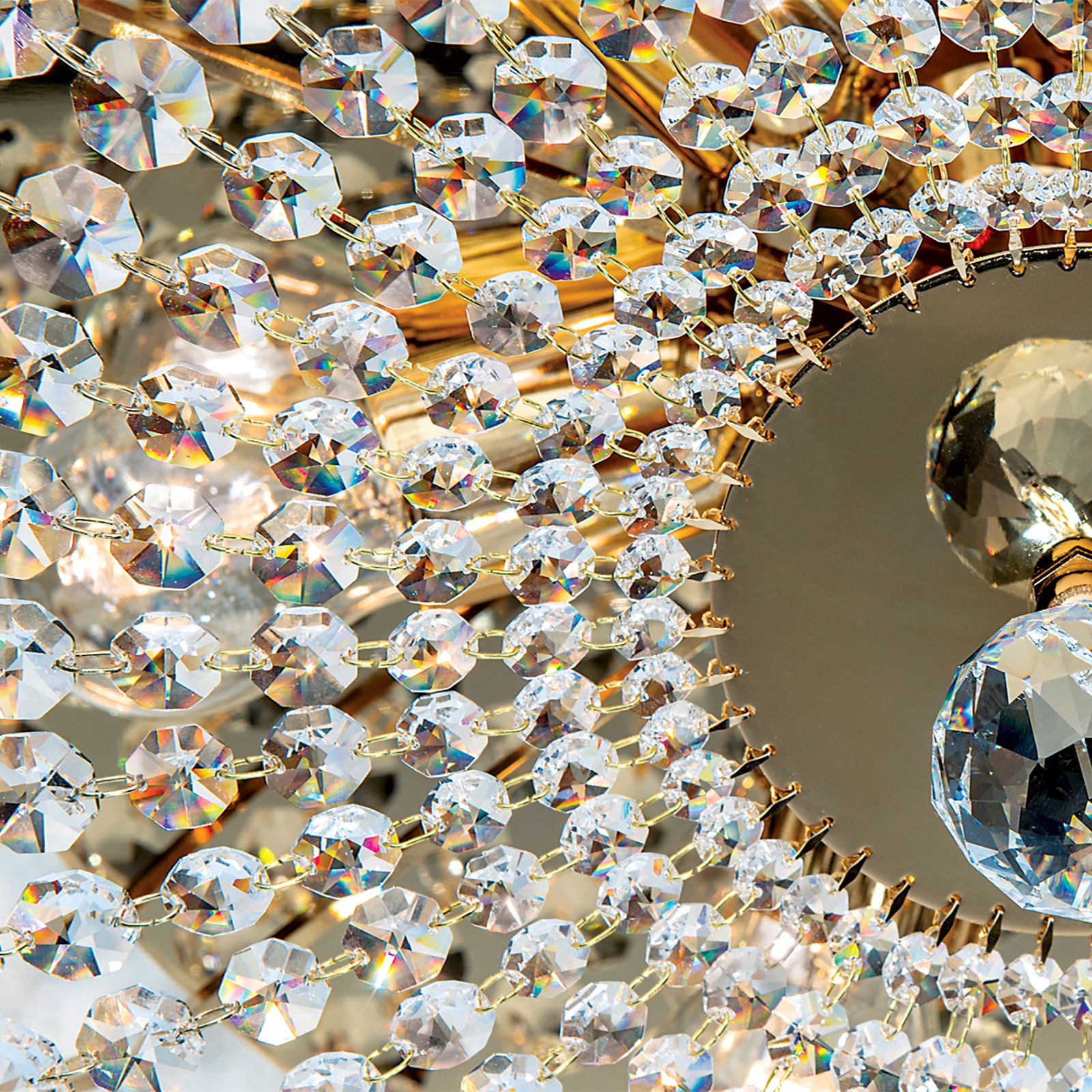 The SHERATON crystal ceiling light is truly a gem and looks great in a classically furnished living or dining room. With its numerous clear SCHÖLER CRYSTAL® crystals, it provides an enchanting glitter and sparkle in the room. Its lamp body is made of brass and available in a 24-carat gold or chrome finish. The ceiling chandelier with a considerable diameter of 65 centimetres is equipped with 8 E27 sockets and can be fitted with a maximum of 60 watts per socket. In combination with economical LED lamps, the ceiling chandelier can also be used for energy-efficient, permanent lighting. The quality of the Kirstall hanging is particularly high and comes from SCHÖLER. We would like to point out that this product is a shipping item.