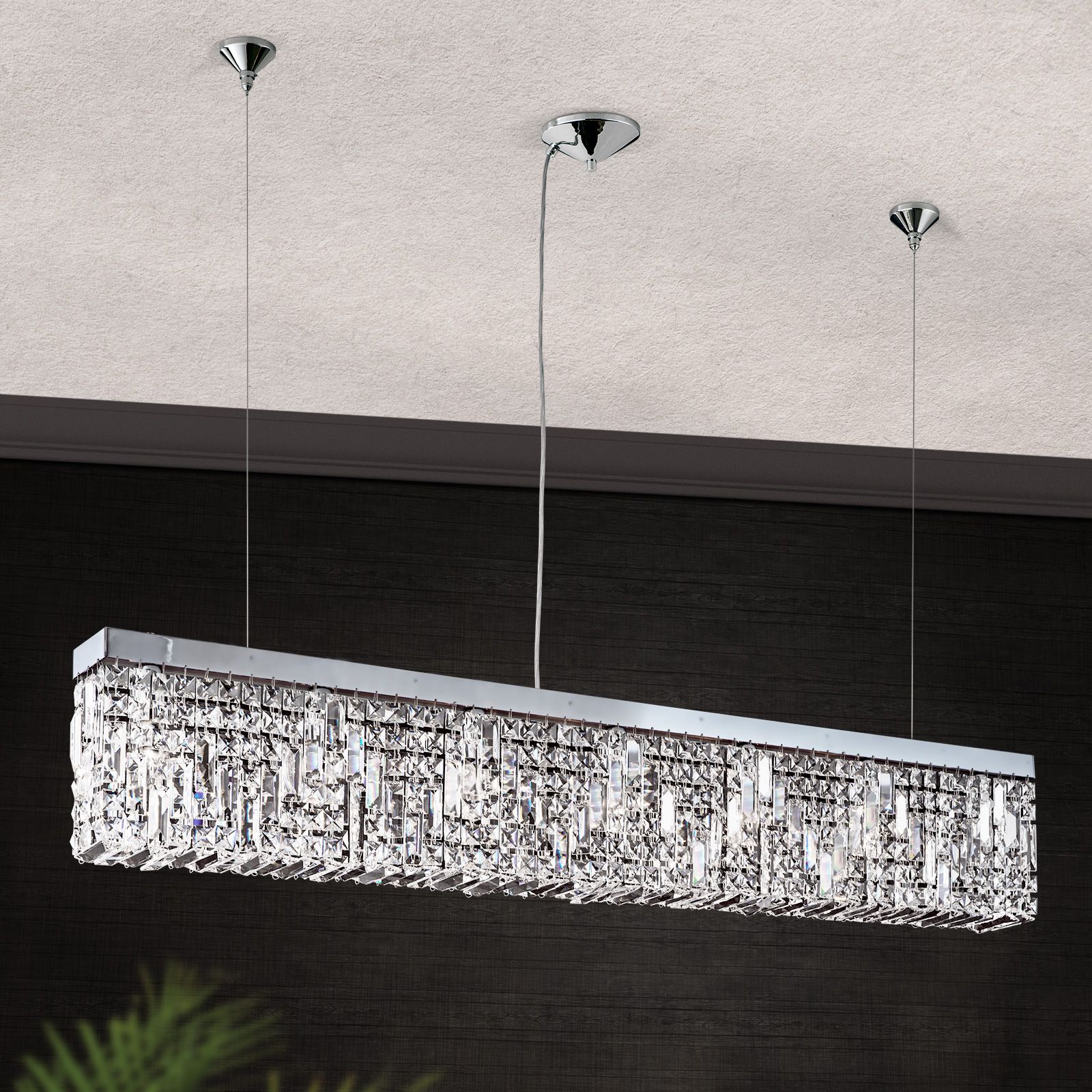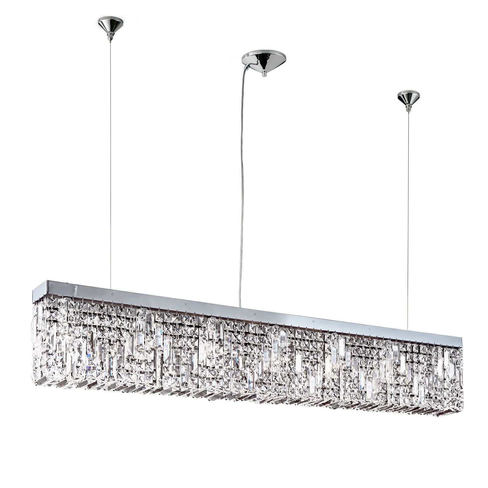 Pendant lamp RING presents itself in a classic yet modern way. Its straight shape and length of 130 cm make it perfect for mounting above dining tables. The brass frame with shiny finish harmonises perfectly with the numerous Asfour crystals. 7 bulbs in E14 sockets are hidden behind a crystal curtain to create unique light reflections inviting the beholder to marvel. Thus, the lamp not only serves as light source, but is also chic home accessory. For individual lighting moods, the pendant lamp can be dimmed. This light is available in chrome and gold finishes.