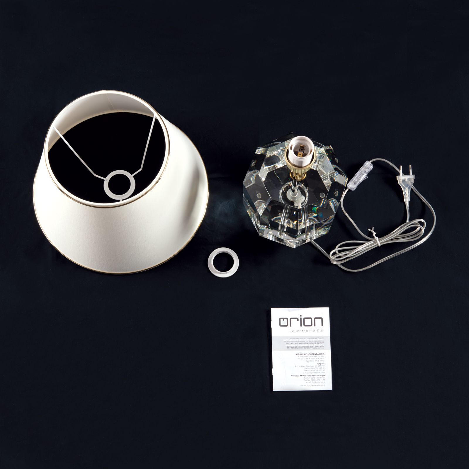 Particularly chic in appearance, the table lamp ALEXIS presents itself with its unusual stand. In classically or modernly furnished interiors, a place on a sideboard or a free-standing shelf for ALEXIS can certainly be arranged and there attract all eyes. The base is reminiscent of an oversized piece of jewelry, which is made of K9 crystal glass. Thus, the column of the light located in it is visible. When the light is turned on, the shiny surface is reflected, flooding the crystal with an enchanting light. Delicate golden stripes adorn the cone-shaped shade and complete the overall look. Equipped with an E27 socket, ALEXIS is operated with a maximum of 60 watts.