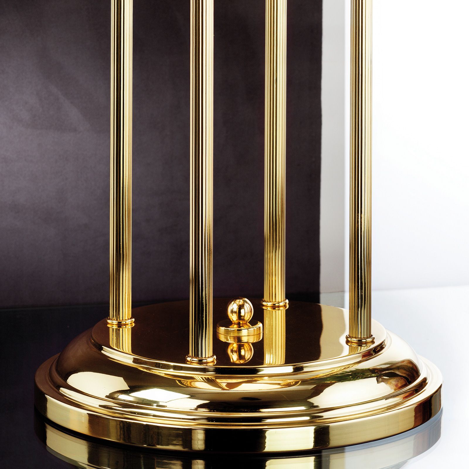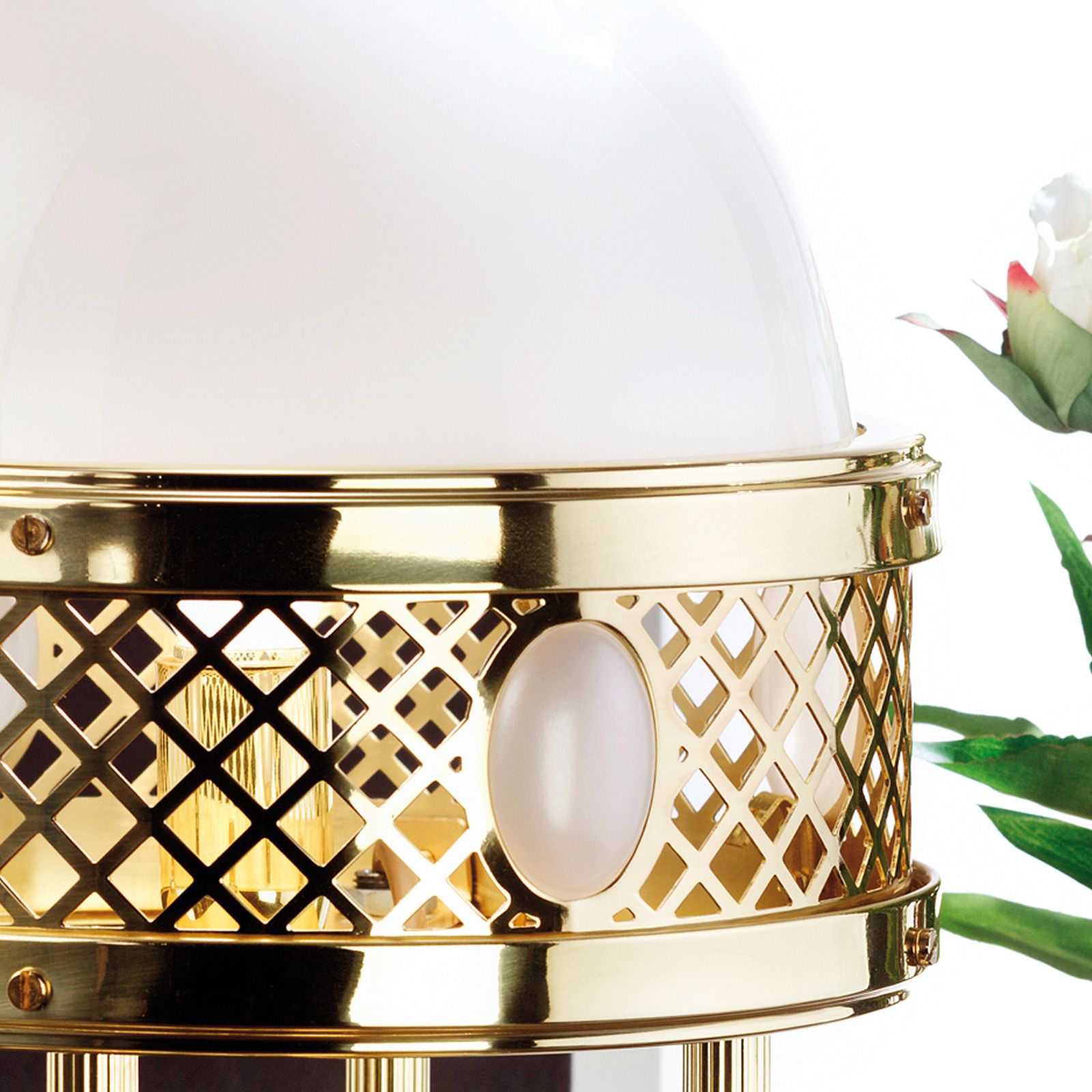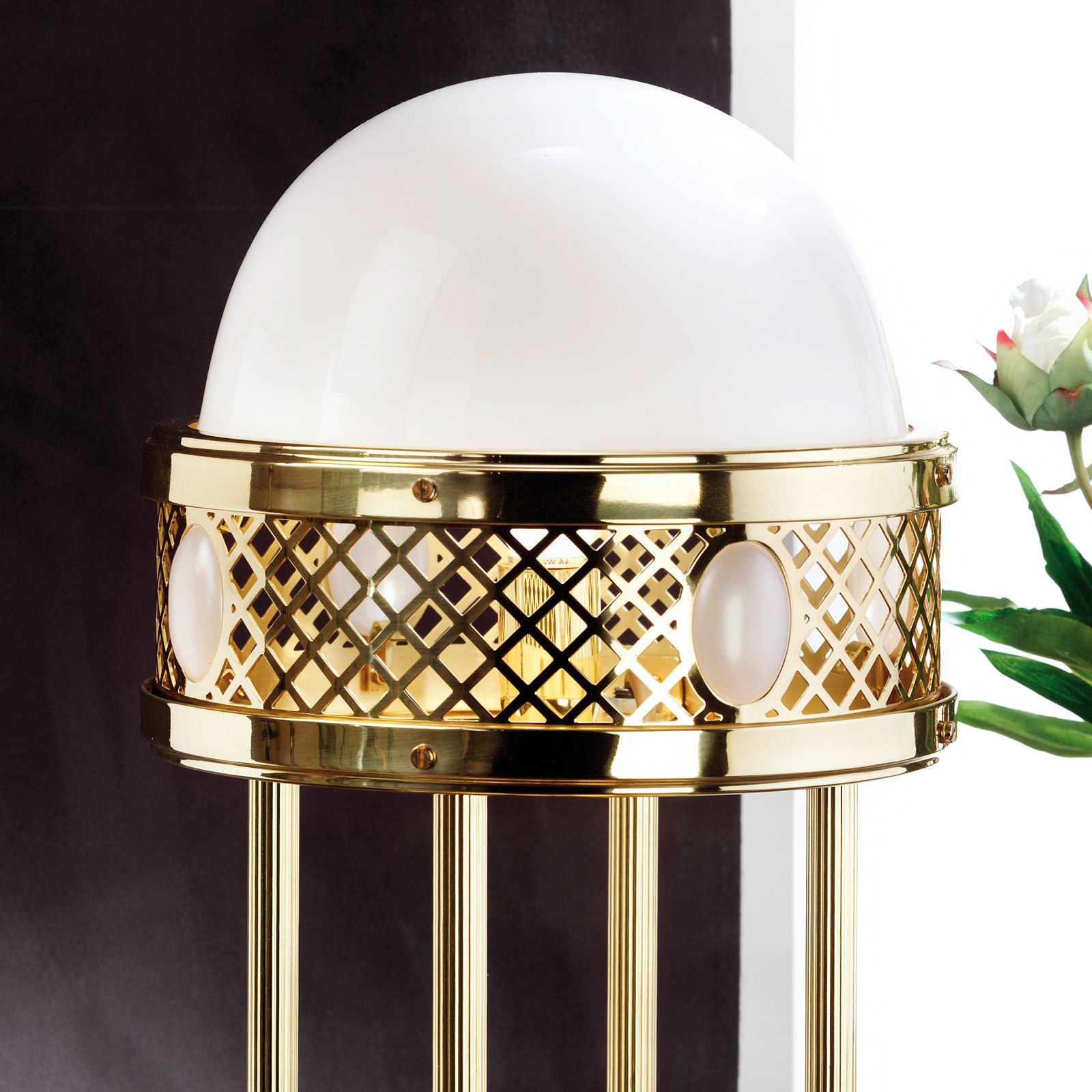 More than any other light, a table lamp is a piece of furniture, an interior accessory that also illuminates so to say as an "additional benefit". This makes its design all the more important. The table lamp from the ALT WIEN series leaves nothing to be desired in this respect: it actually is a sculpture with balanced proportions. Four clear lines grow out of a column-like base. They support a gold shining hoop. The crowning glory is the glass dome. Four oval appliqués on the brass grid as only ornaments are enough to attribute this light to Art Nouveau. The table lamp is equipped with an E27 socket for up to 60 watts.