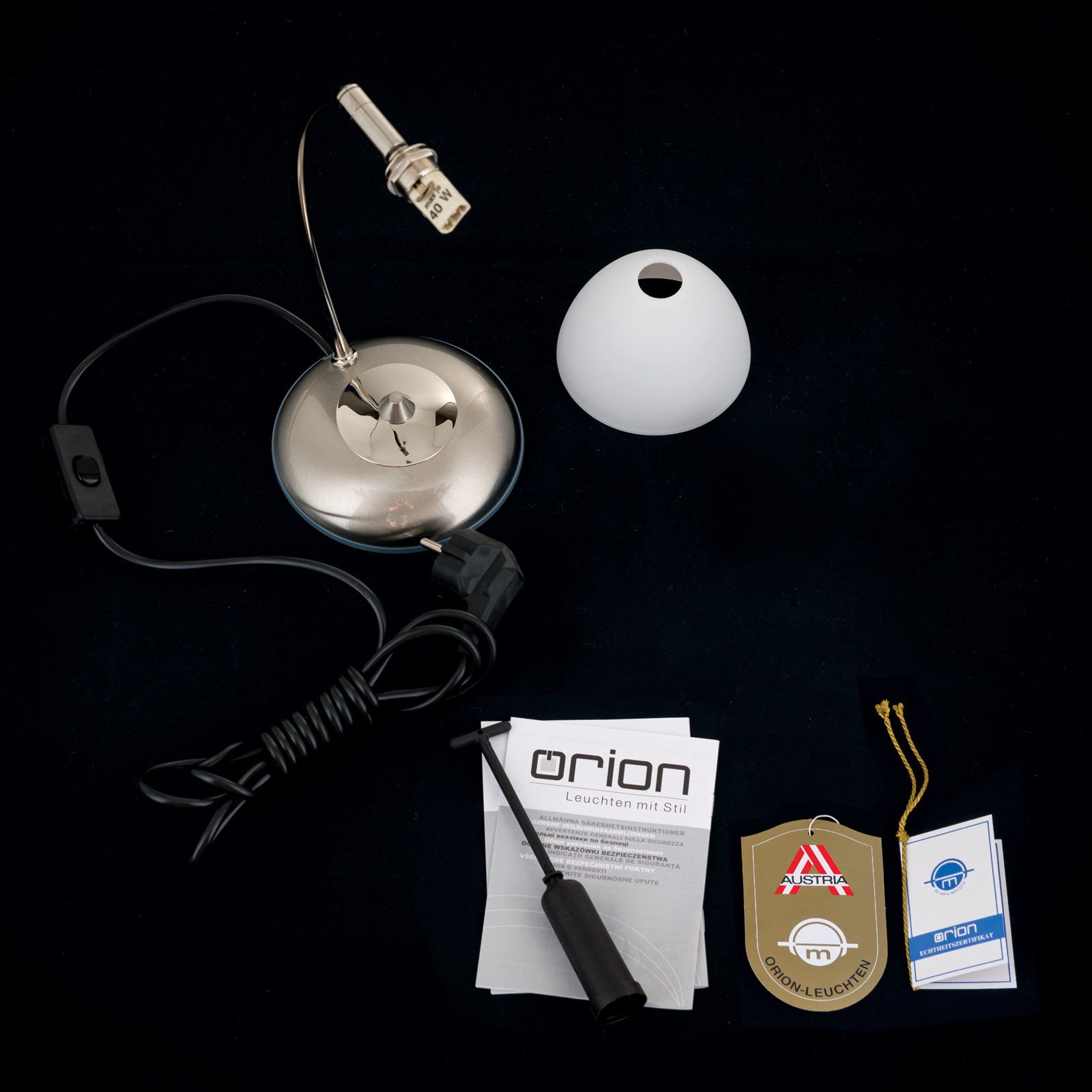 It is ideal as reading lamp on a small side or bedside table and operated with a rocker switch on the cable. It is equipped with 1 G9 socket for a pin base lamp with 40 watts maximum that is included in the scope of delivery.