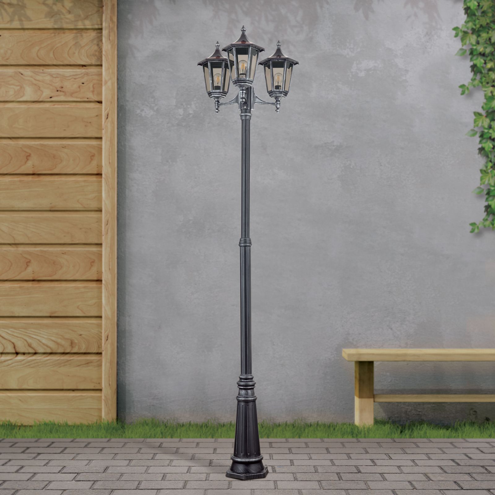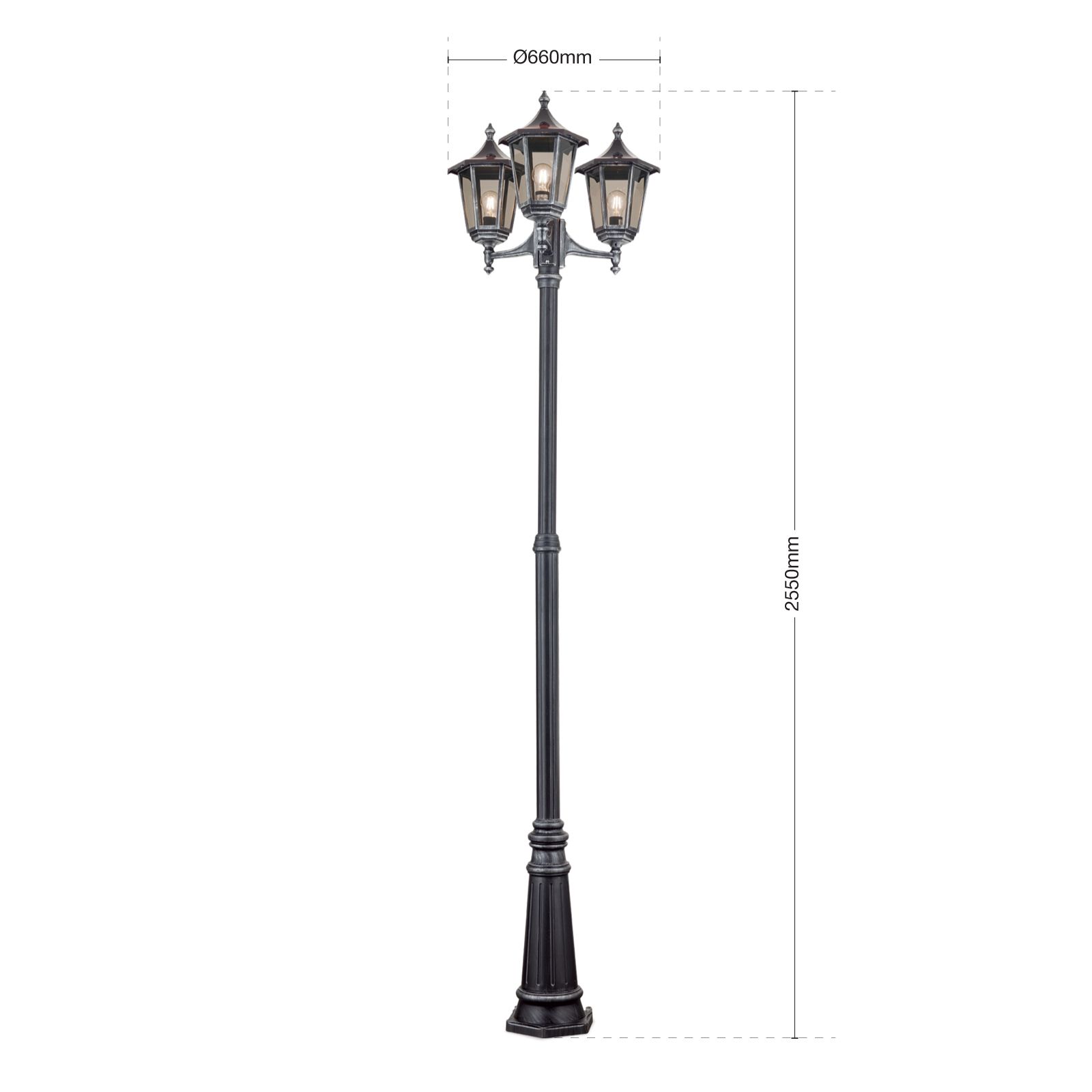 Die dreiflammige Mastleuchte HERMINE überzeugt durch ihr klassisches Design und den robusten Charakter. Die Schutzart IP43 und der hochwertige Siluminguss machen sie besonders witterungsbeständig und wetterfest. Durch ihr antikes Erscheinungsbild verleiht sie Garten- und Parkanlagen einen verwunschen, romantischen Charakter und sorgt gleichzeitig für eine sichere Beleuchtung großer Außenareale. Die Oberfläche ist in einem antiken Schwarzsilber gestaltet und wird von einem kupferbraunen Dach mit schwarzer Spitze bekrönt.