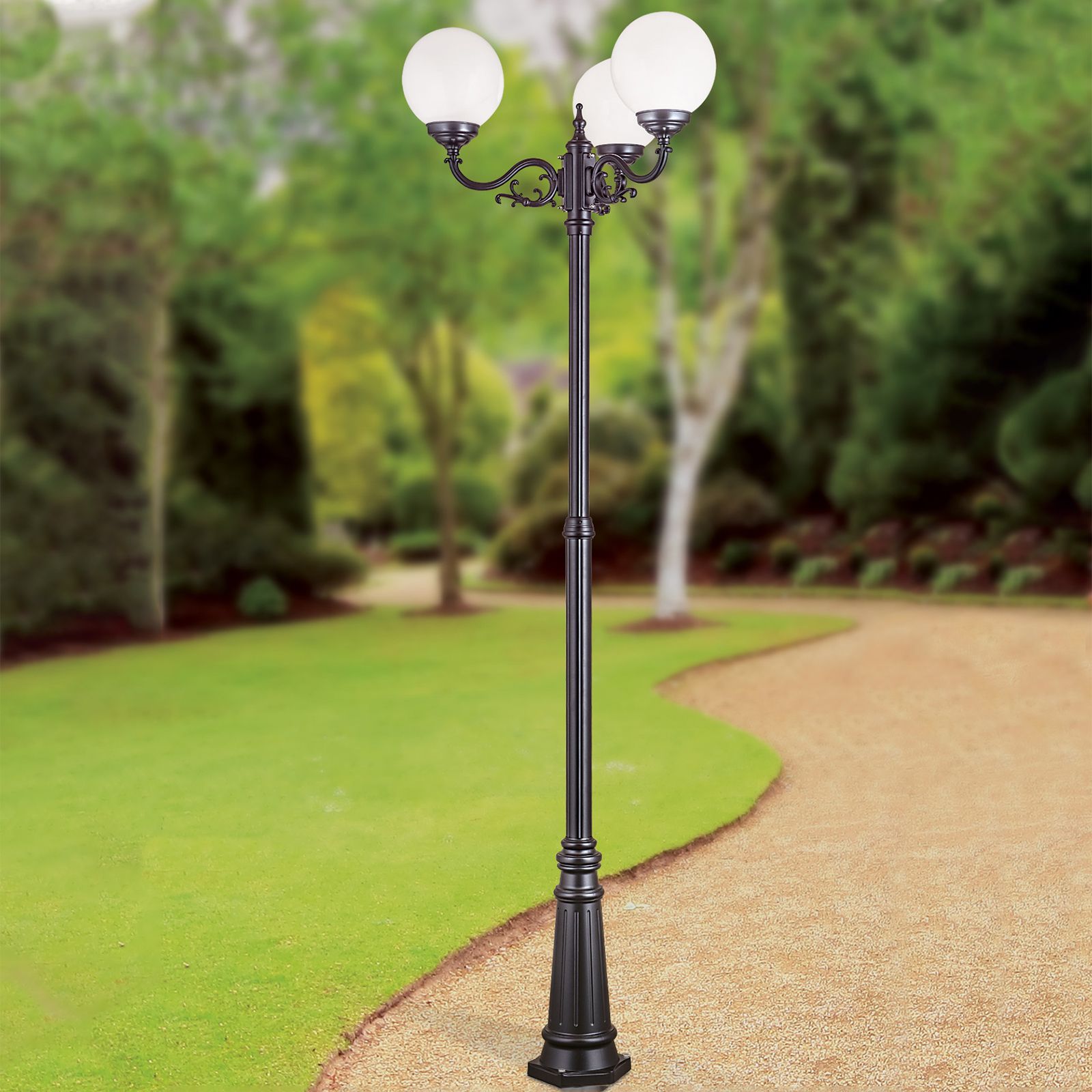 Bei der dreiflammigen Mastleuchte REIKA handelt es sich um eine dekorative Außenleuchte, die sich hervorragend als Orientierungslicht an einem Wegrand eignet. Mit dem dezenten, aber auch märchenhaften Design sorgt sie für eine gute Beleuchtung im gewünschten Bereich und bringt somit auch mehr Sicherheit im Dunkeln. Auf ihrem Mast sind drei opal-glänzende Acrylglaskugeln im gleichen Abstand zueinander befestigt, die für eine gleichmäßige und angenehme Lichtverteilung sorgen. Die Leuchte ist mit einem Phasenanschnittdimmer dimmbar, wenn das Variieren der Helligkeit erwünscht ist. Ausgestattet ist sie mit drei E27-Fassung und kann mit maximal 75 Watt bestückt werden. LED-Lampen sind die ideale Ergänzung für diese Mastleuchte, um den Energie- und Wartungsaufwand niedrig zu halten.