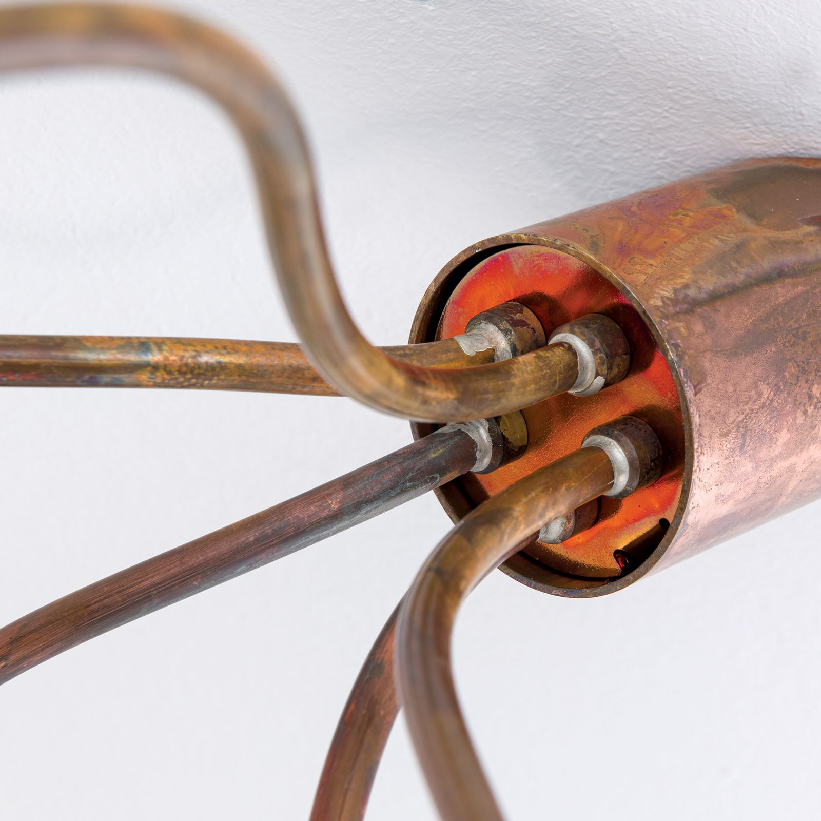 Ihren Namen verdankt die Deckenleuchten COPPY ihrem charakteristischen Kupfergestänge. Flexarme in Form roh verarbeiteter Kupferrohre ermöglichen es, diese nach eigenen Vorstellungen auszurichten und so ganz unterschiedliche Formen zu kreieren.
