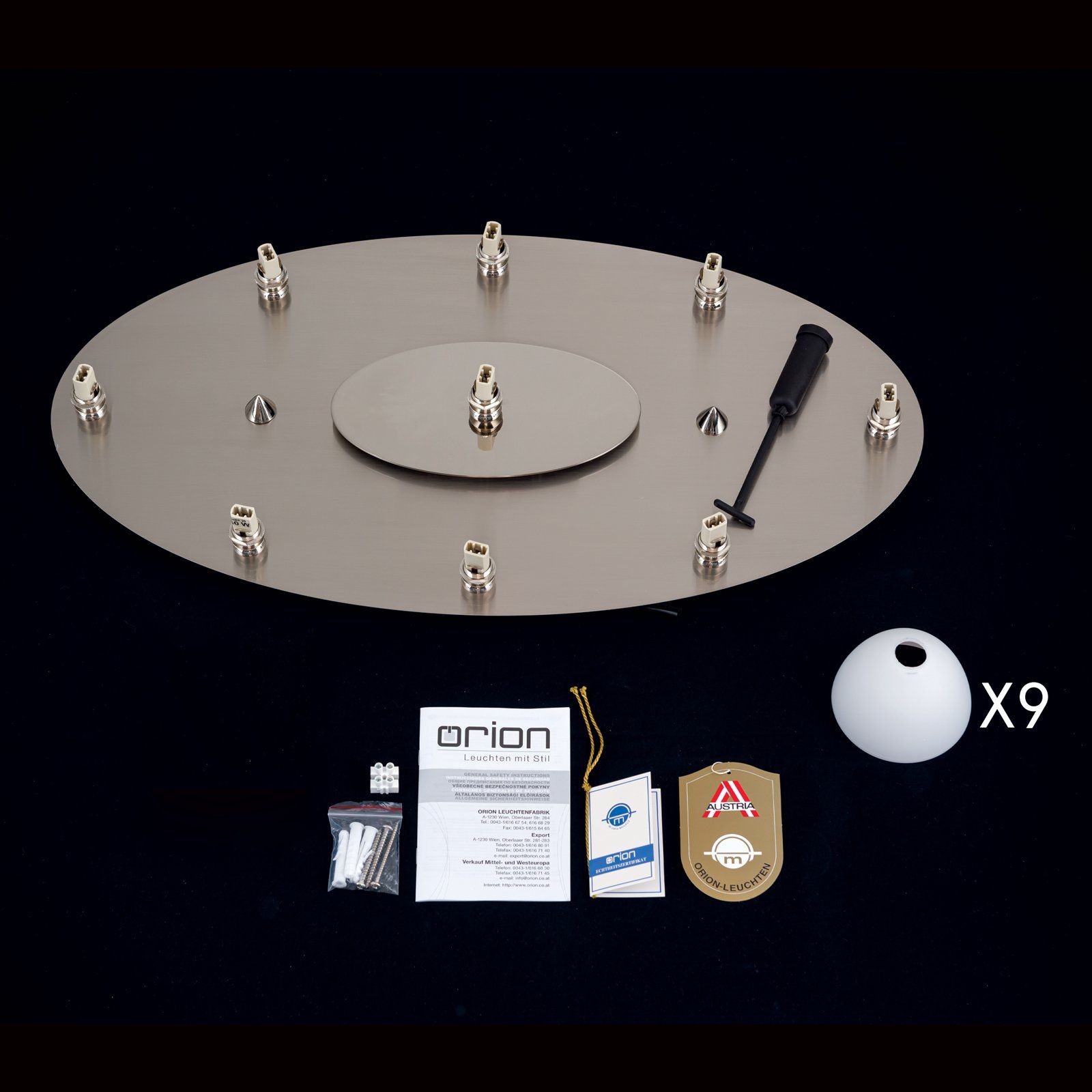Sie ist wahlweise mit einem Oberflächenfinish in Gold-matt oder Satin erhältlich. Die 9 G9-Stecksockellampen, die für den Betrieb der dimmbaren Leuchte benötigt werden, sind im Lieferumfang enthalten.