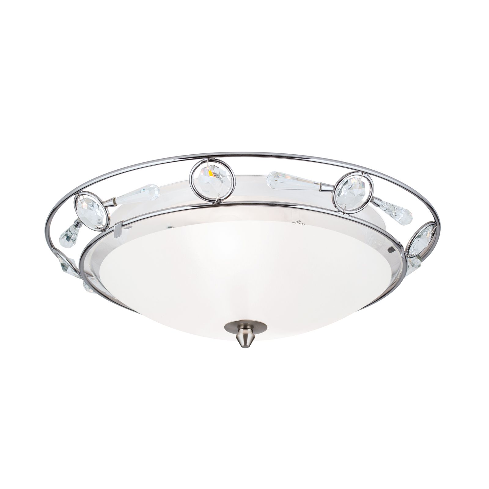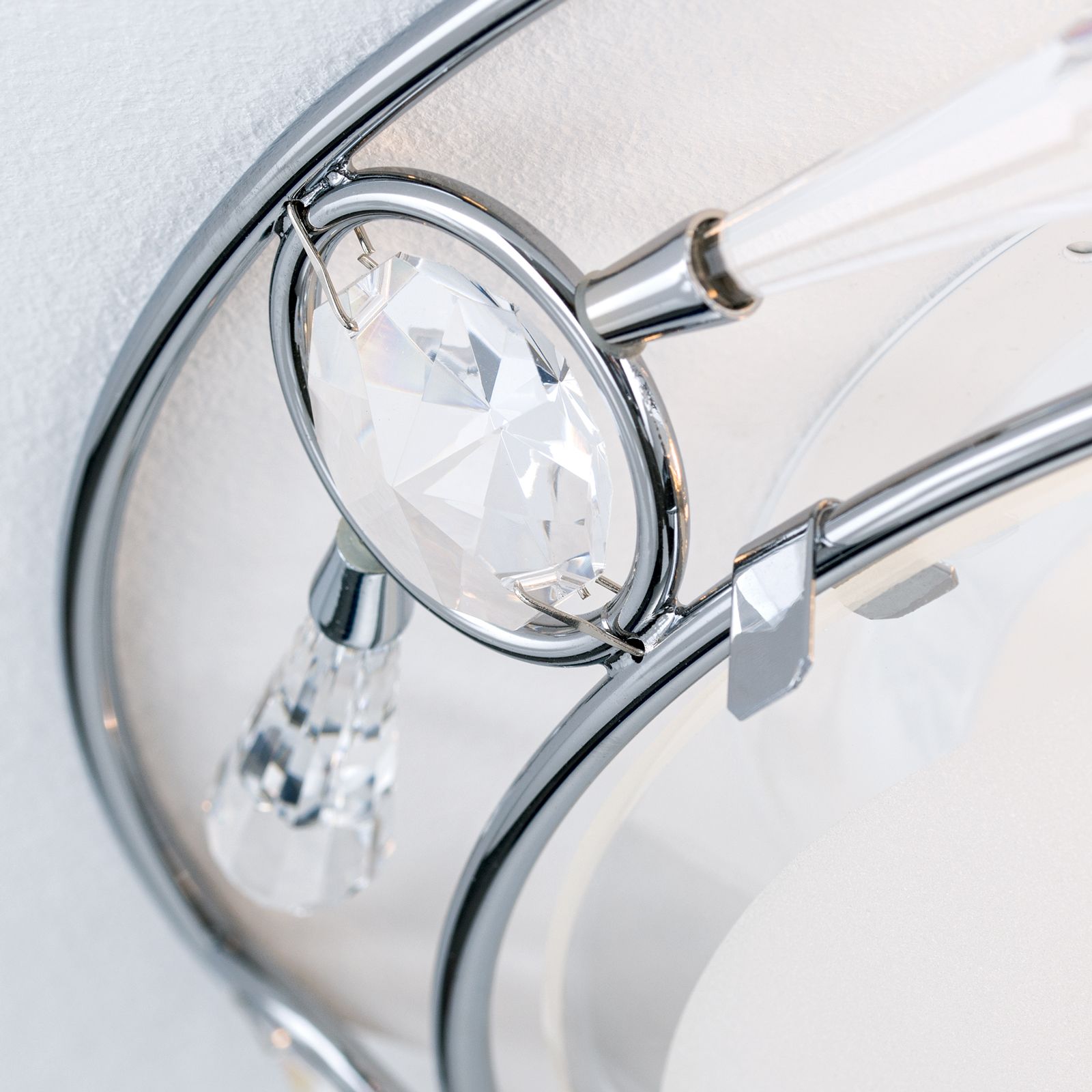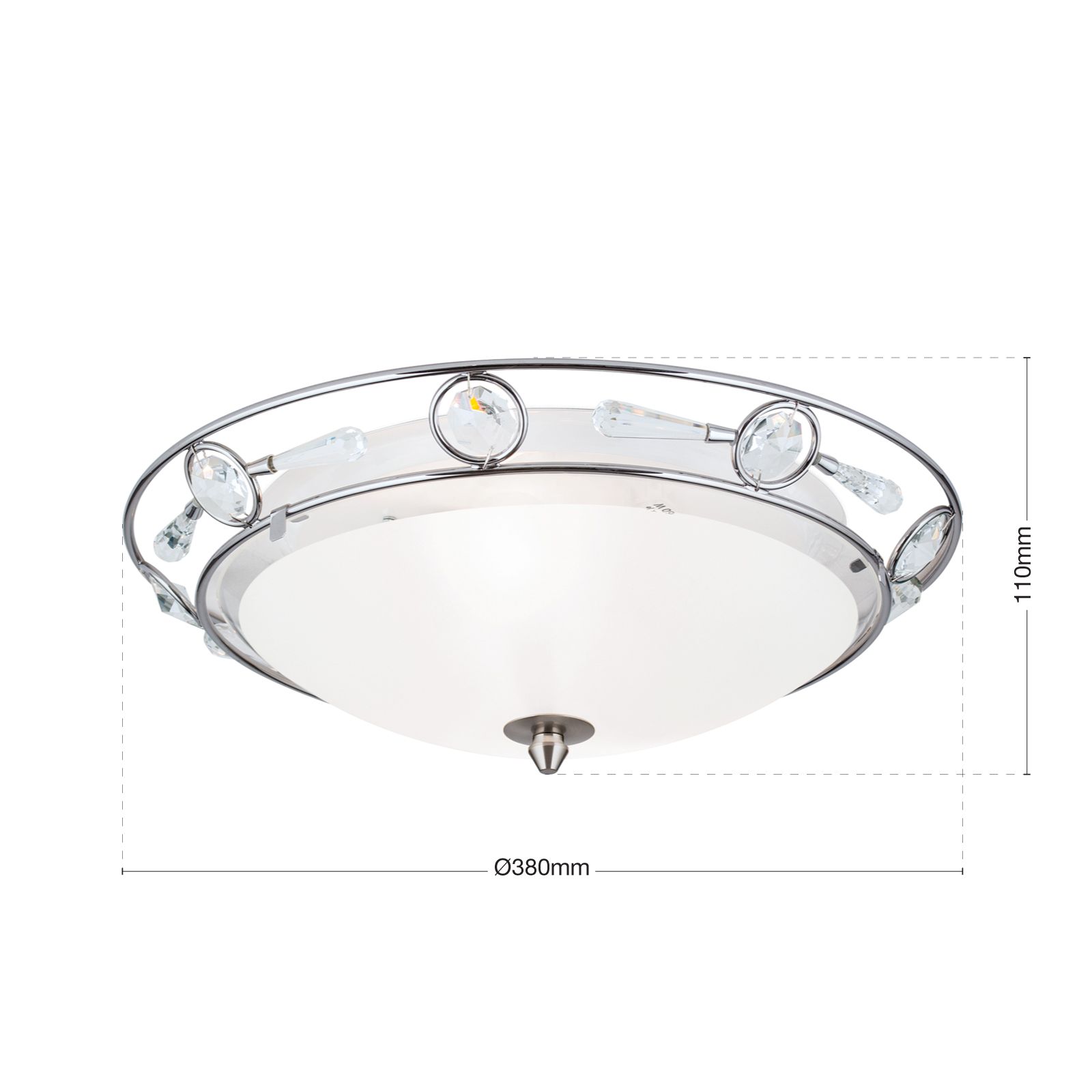 Mit einem Durchmesser von 38 cm ist sie perfekt geeignet für Wohnzimmer, Schlafzimmer oder Flure. Doch ihre wahre Schönheit steckt im Detail: An der oberen Kante der Leuchte sind funkelnde Kristalle kunstvoll eingearbeitet, die dem Design eine luxuriöse Note verleihen.