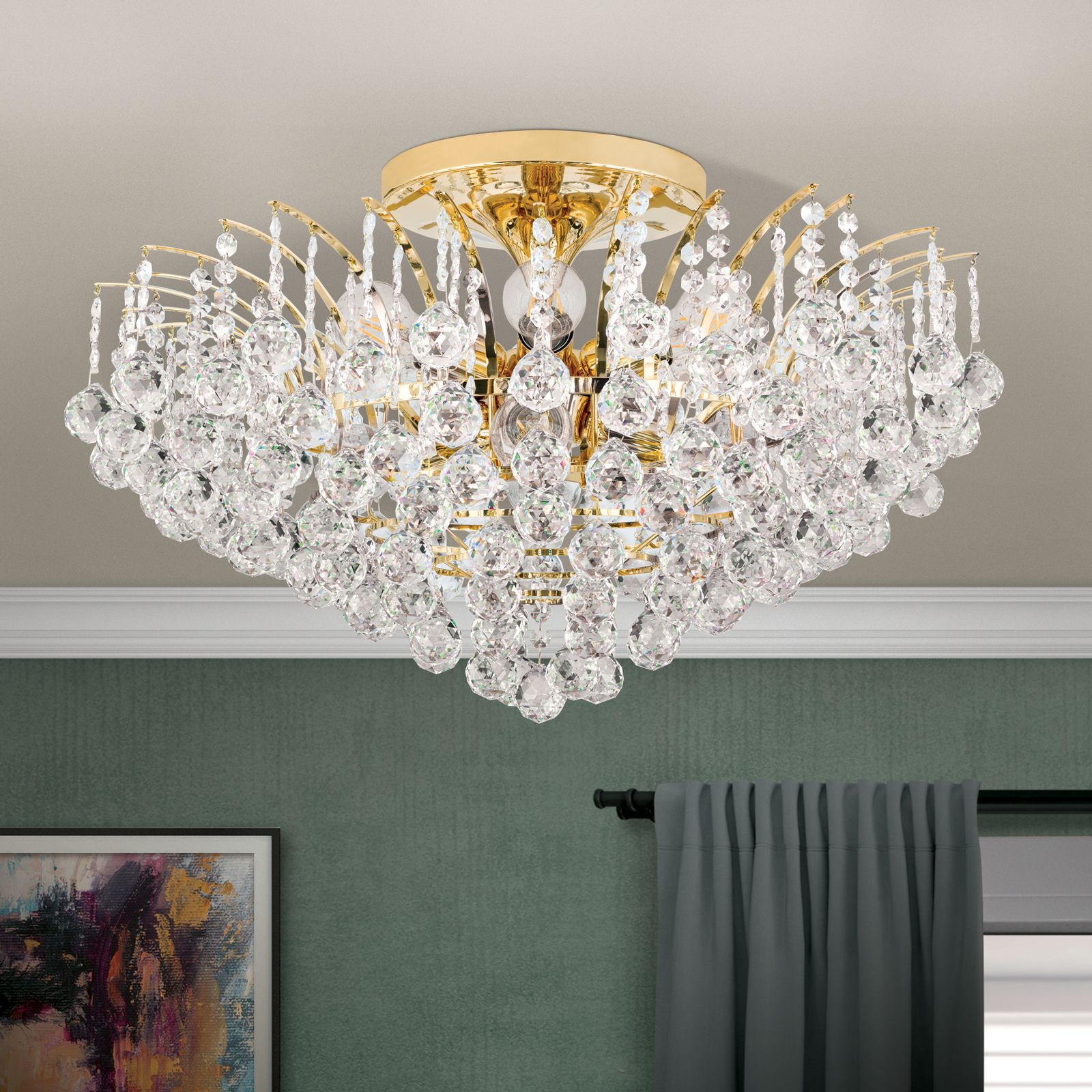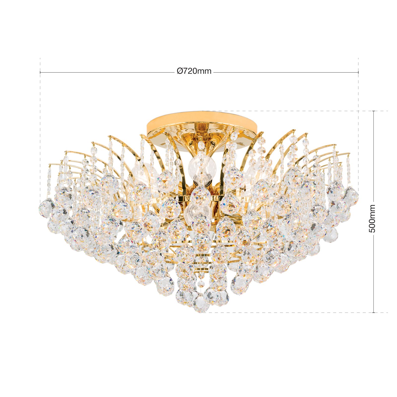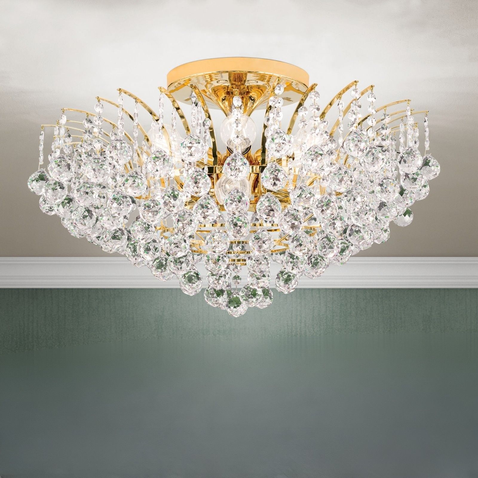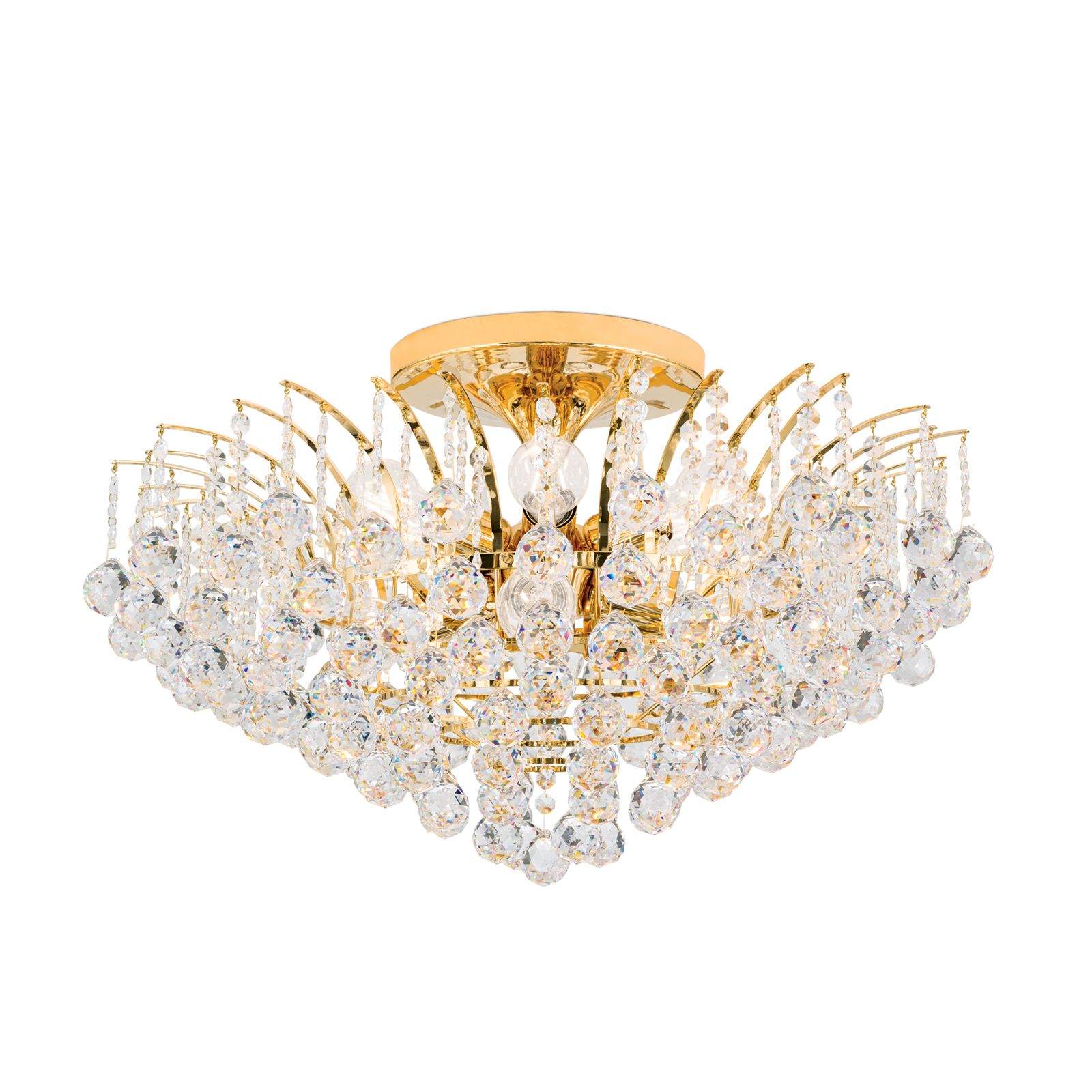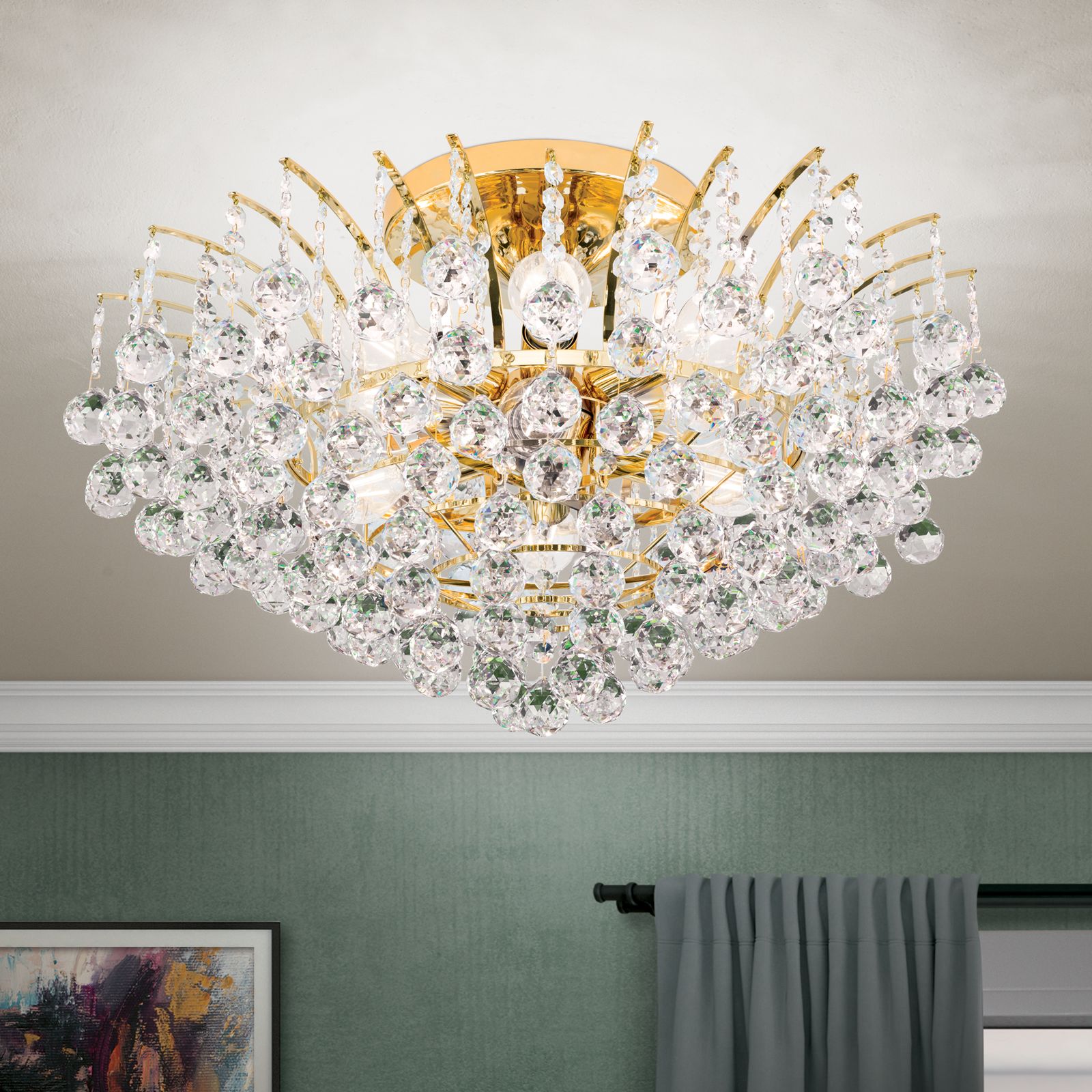 Klare Kristalle aus dem Hause Asfour sind bei dem Deckenkronleuchter KRISTALL KLASSISCH rund um das Vollmessinggestell angebracht. Seine Form erinnert an zu Kristallen gefrorene Wasserfontänen, die aufgrund der kaum sichtbaren Befestigungspunkte zu schweben zu scheinen. Aufgrund seines Designs eignet er sich sowohl für klassische, aber auch modern eingerichtete Wohnräume und kann ein Wohn-, Esszimmer oder Eingangsbereich voll ausleuchten. Der Kristallbehang besteht aus unzähligen facettierten Kristallkugeln, die mit Kristallkoppen verbunden sind und bei Lichteinfall ihre volle Pracht entfalten. Die glänzende Oberfläche des Gestells verstärkt diesen Effekt. Die 10 E27-Fassungen, die mit maximal je 60 Watt betrieben werden, sitzen hinter den Kristallen versteckt und können bei Bedarf mit einem Dimmer in der Helligkeit reguliert werden.