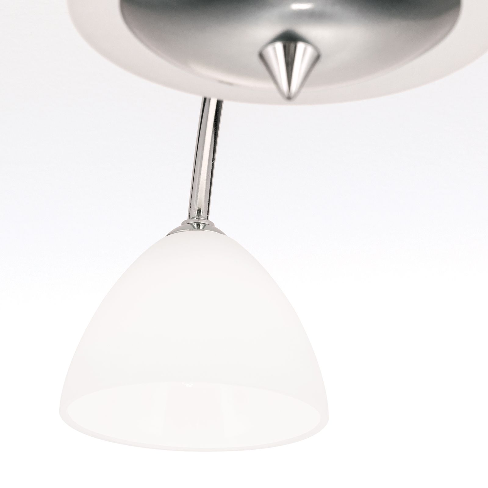 Der sanfte Bogen der Leuchtenarme findet sich in den Glasschirmen wieder, die das Licht weich streuen und zu einer gemütlichen Grundbeleuchtung in einer Küche, einem Ess-, Wohnzimmer oder Vorraum beitragen.