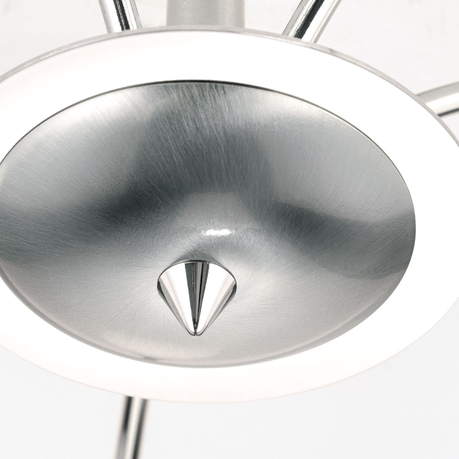 Die nach unten gerichteten Schirme sind aus opalmattem Glas gefertigt, die Leuchtenmontur aus Messing hergestellt und mit einem Oberflächenfinish in Gold oder Satin versehen. Die Deckenleuchte ist mit 5 G9-Fassungen ausgestattet und kann mit maximal 40 Watt je Fassung bestückt werden.