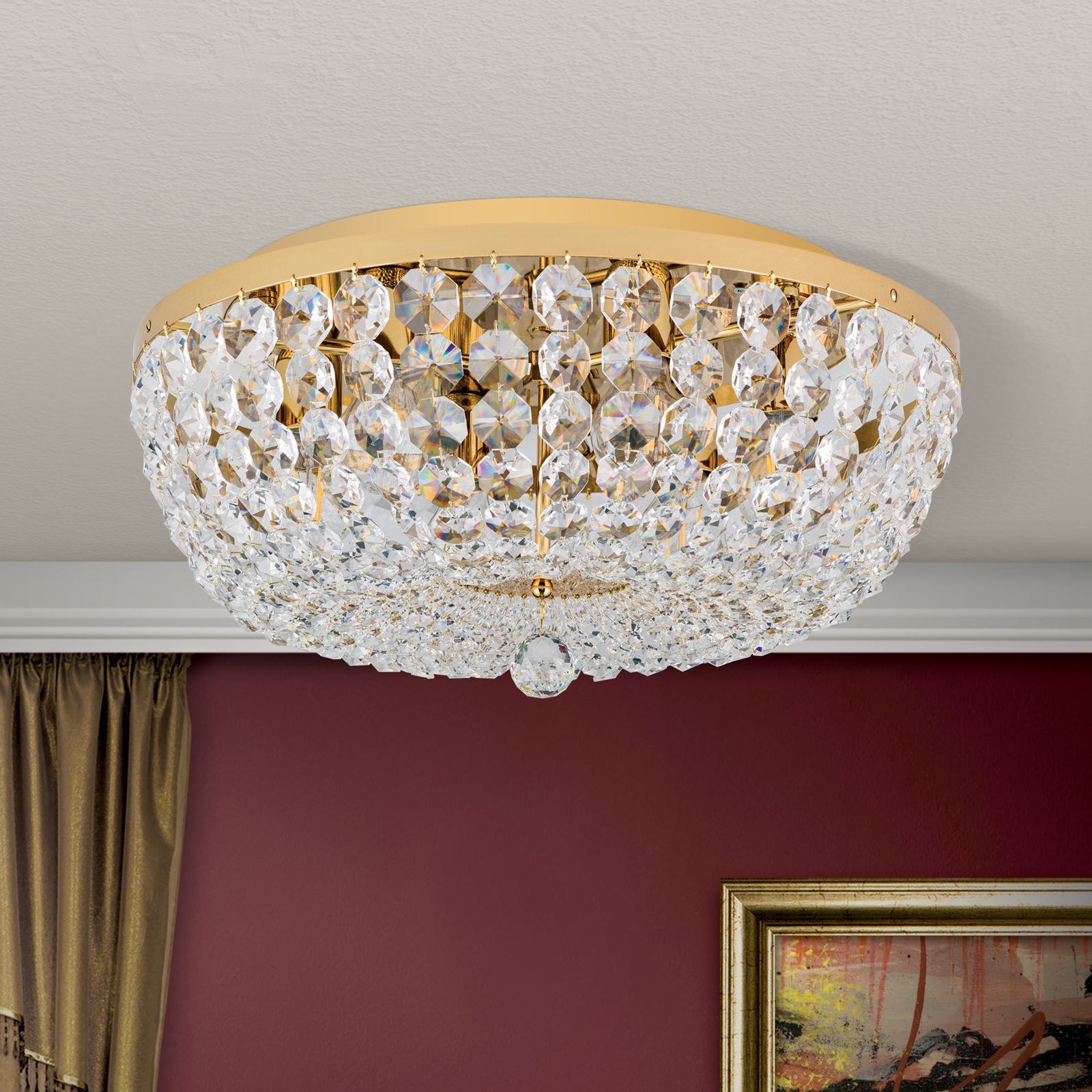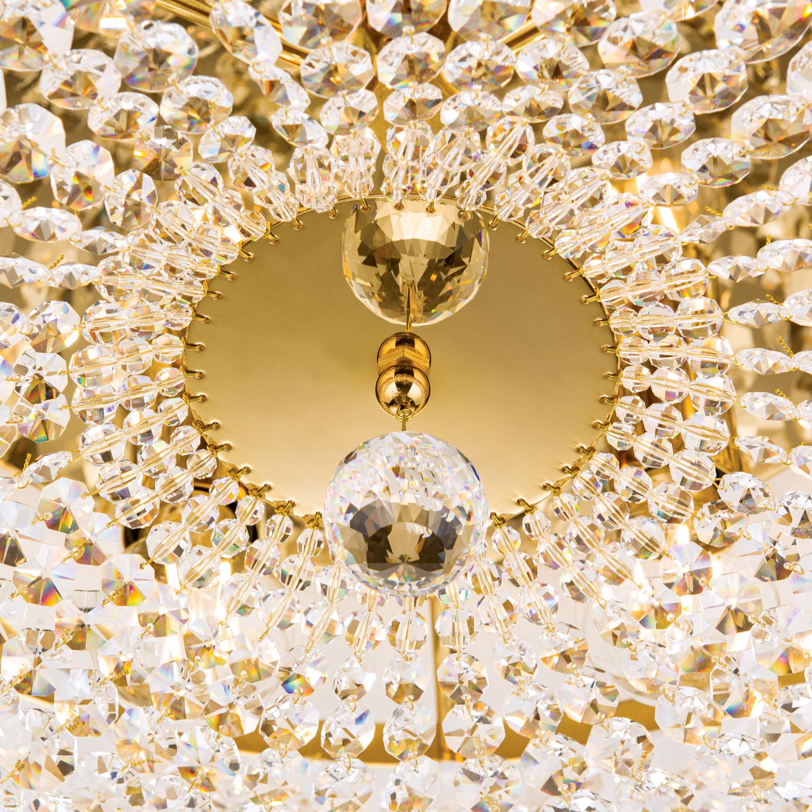Die 24-Karat vergoldete Deckenplatte aus Vollmessing mit einem Durchmesser von 55 cm trägt einen Messingring, welcher eine Vielzahl an Kristallketten in Koppenform trägt. Die Ketten verlaufen schön geschwungen zur Mitte, wo sie auf eine facettierte Kristallkugel treffen, die für das gewisse Etwas sorgt.