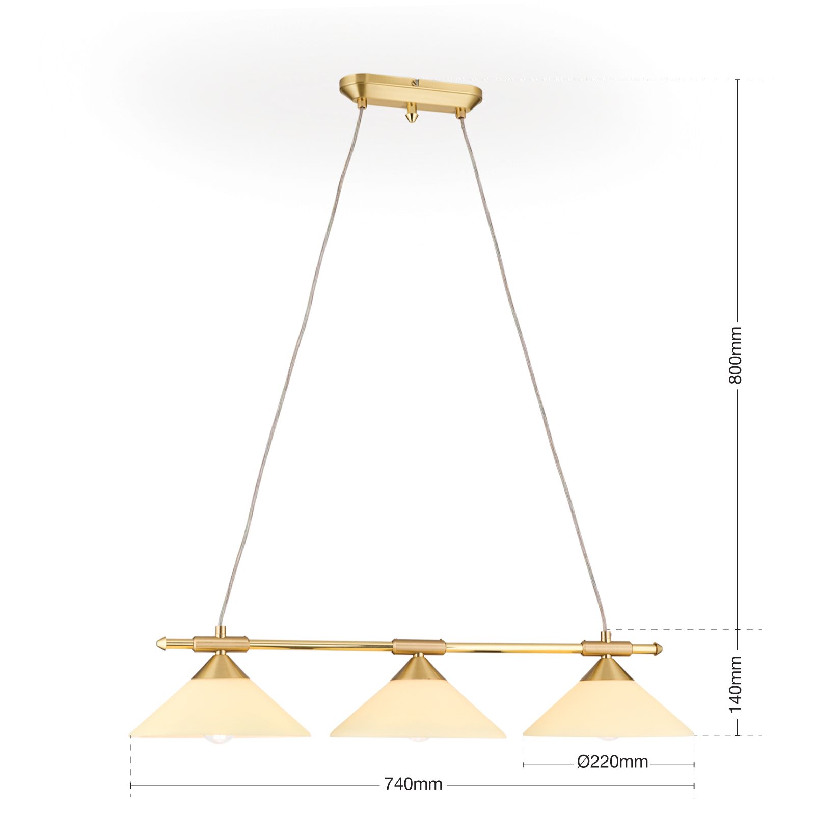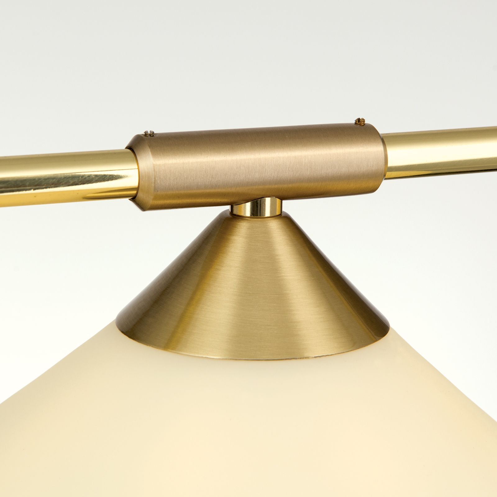 Die charakteristischen Kegelgläser der gleichnamigen Serie sind an einem horizontalen Messingrohr aufgereiht und verteilen das Licht gleichmäßig.