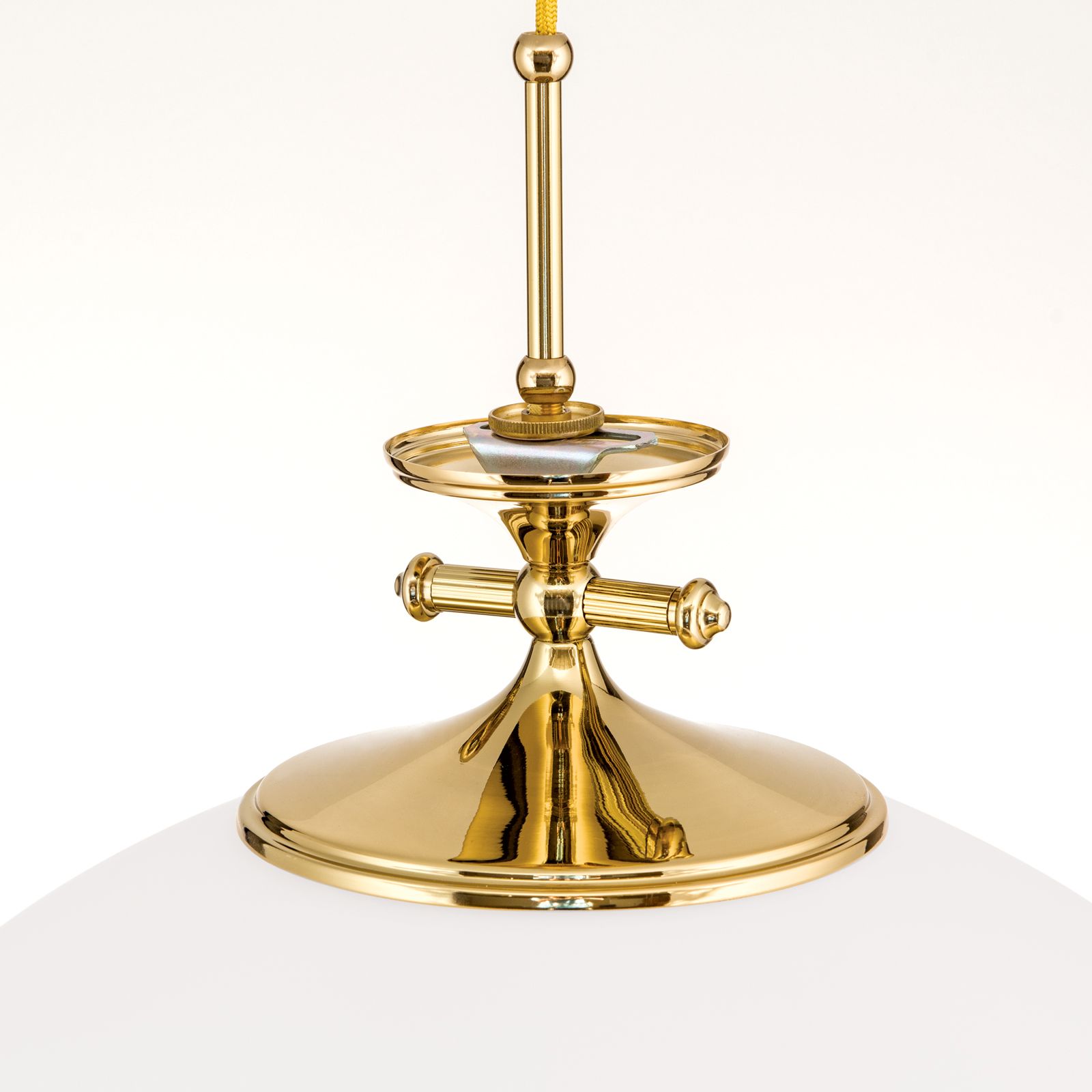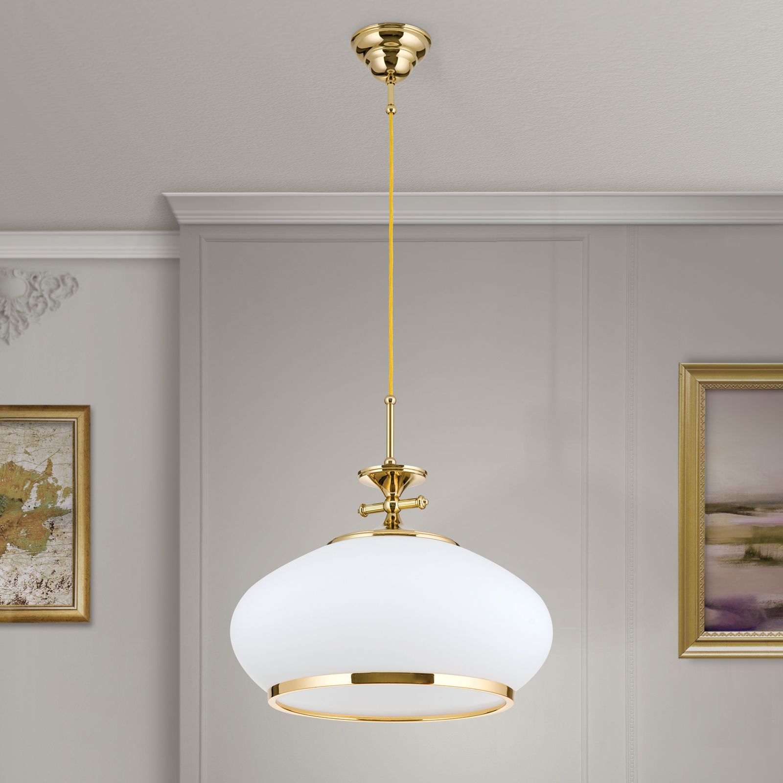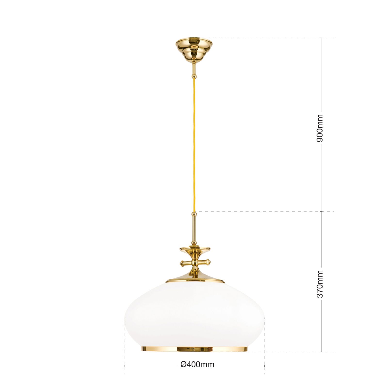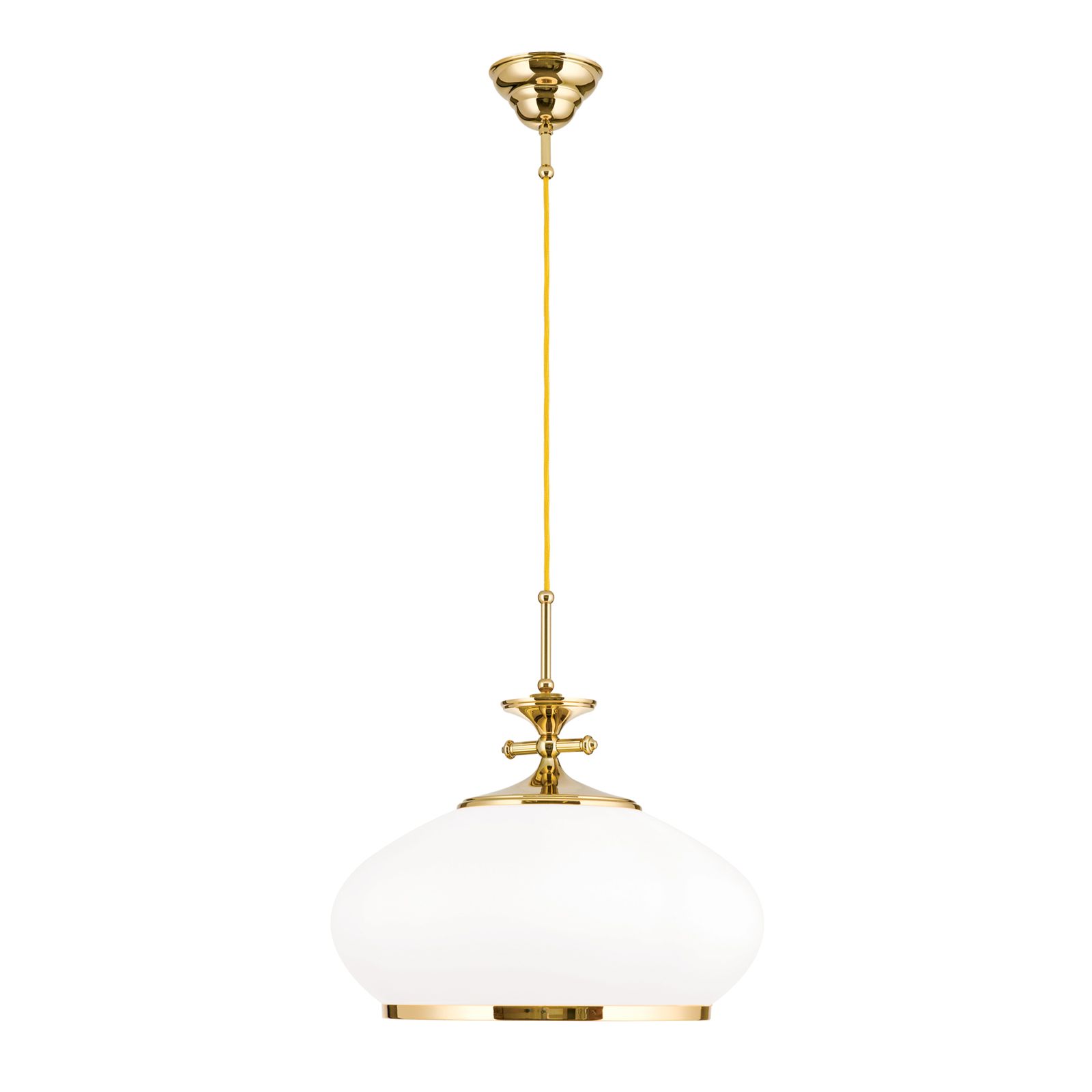 Die Hängeleuchte aus der Reihe EMPIRE verwöhnt mit warmem Licht, edlen Materialien und einer klassischen Form. Der Bogen des Schirmes läuft am unteren Ende in eine Messingeinfassung und geht am oberen Ende in das den Bogen übernehmende sanduhrförmige Gestell über. Sehr zurückgenommene Zierelemente wie die Kanneluren in den beiden abstehenden Stiften in der Schaftmitte verfeinern das Gesamtbild. Dieser Klassiker des Fin de Siècle erfreut auch heute noch den Betrachter. Über einem Ess- oder Spieltisch, als zentrale Leuchte eines großen Vorzimmers wird der Grundstein eines nostalgisch-stilvollen Interieurs gelegt. Eine E27-Fassung sorgt für bis zu 75 Watt.