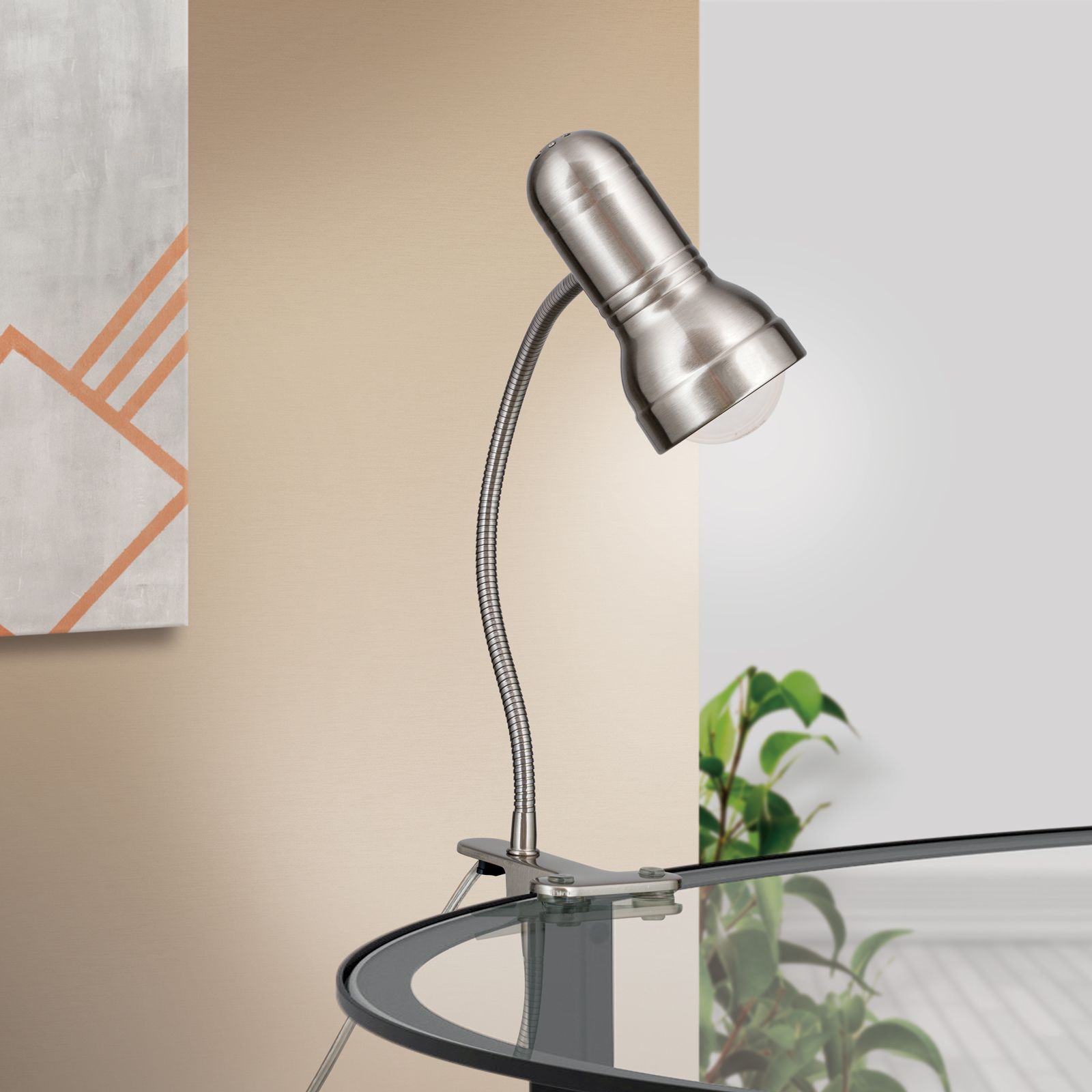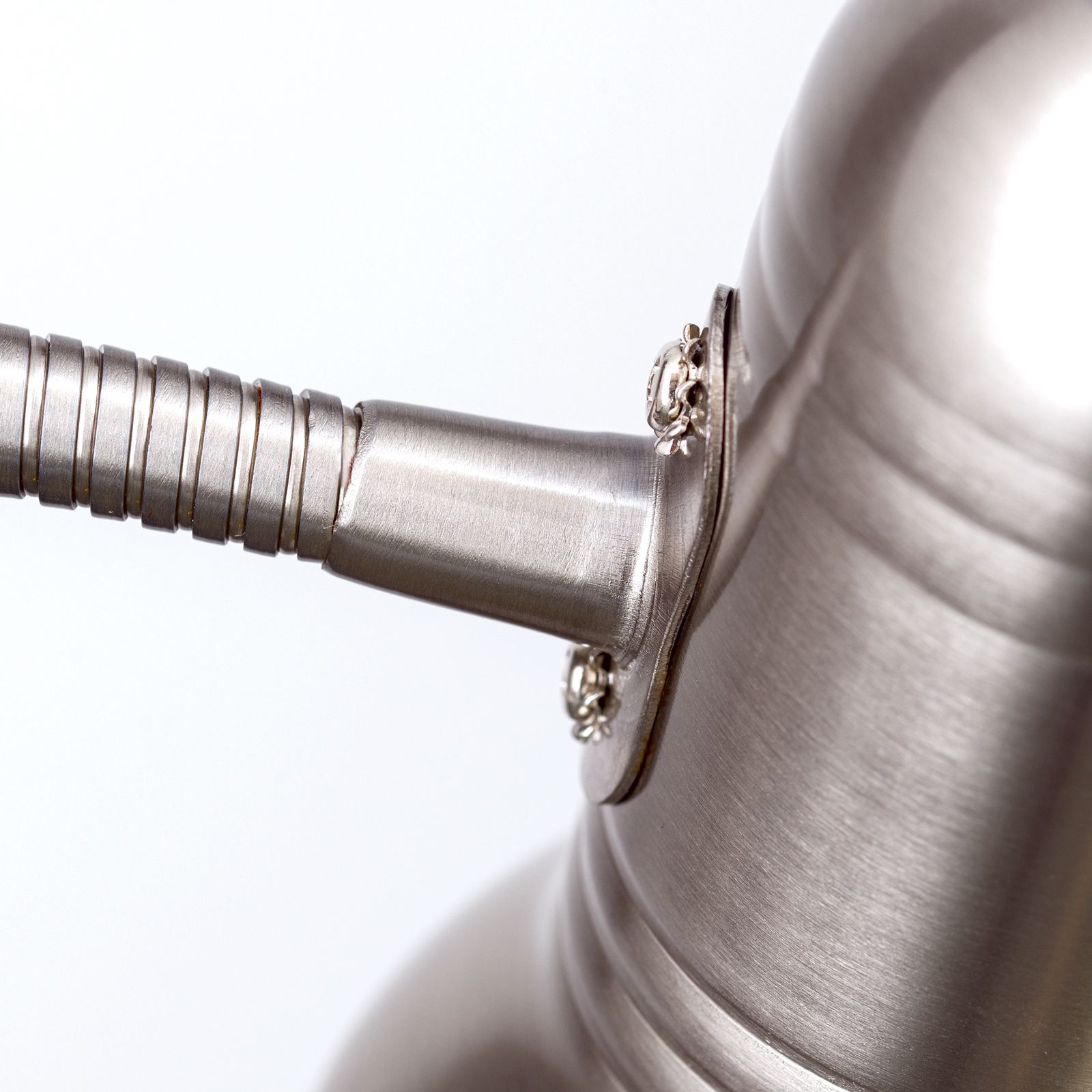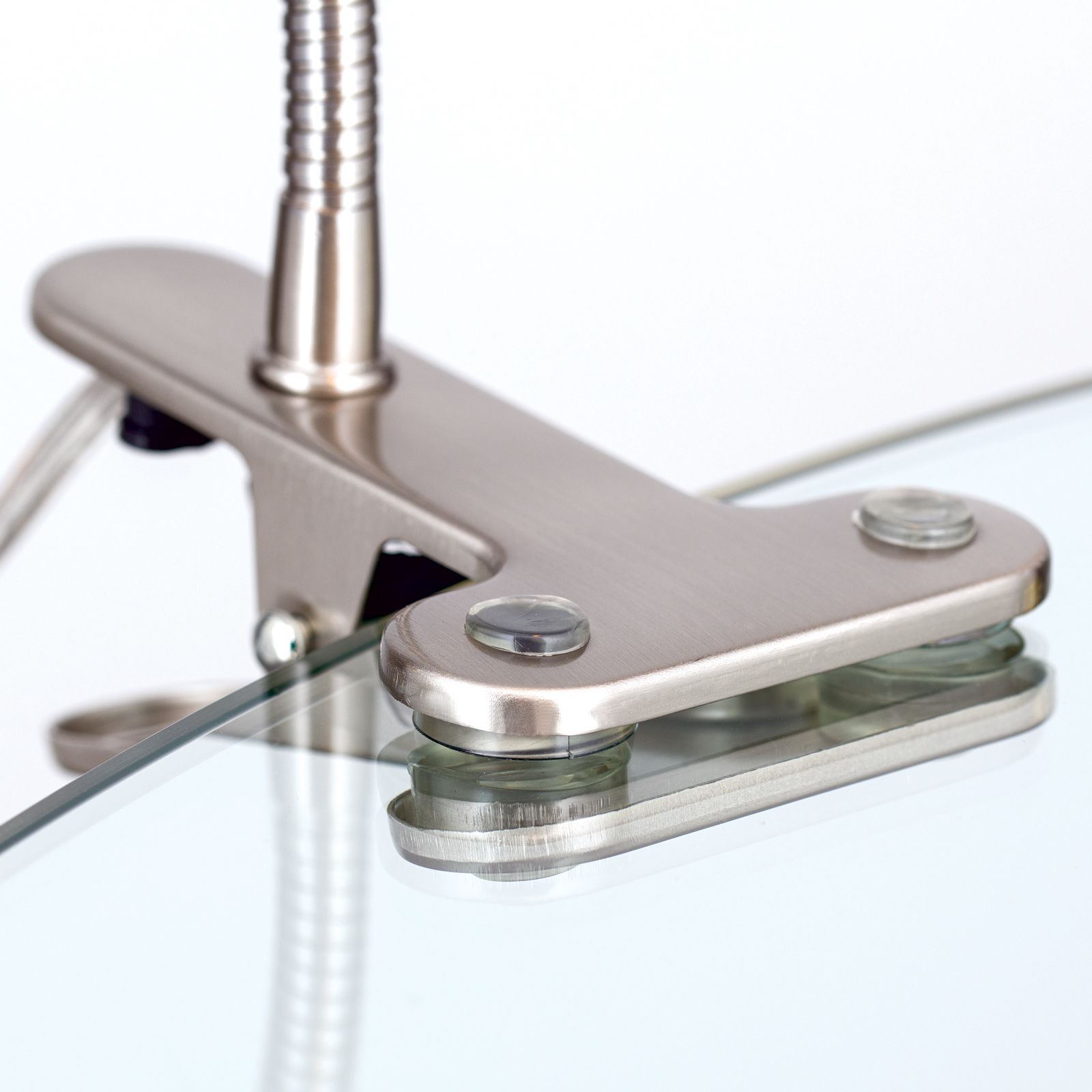 Der kühle Glanz sowohl des Lampenstiels als auch des Lampenkörpers erhalten durch die Spiraloptik und die Rippung des Lampenschaftes ein hochwertiges Designelement. Gleichzeitig besticht die Leuchte durch Schlichtheit, wodurch sie sich harmonisch in jedes Ambiente eingliedert. Der lange, biegbare Lampenstiel erlaubt besonders beim Einsatz in einem Büro oder Arbeitsraum eine flexible Punktbeleuchtung. Einen Arbeitstisch wiederum vermag die Leuchte großflächig und gleichmäßig auszuleuchten. Der Strahler wird mit einer E27-Fassung für maximal 60 Watt ausgeliefert. Bei Verwendung von energiesparsamen Leuchtmitteln wird überdies dem Umweltschutzgedanken Rechnung getragen. Perfekt geeigent sind dafür matte E27-LED-Lampen in Tropfenform. Den Klemmstrahler WILHELM finden SIe sind auch in Kurz- oder Patinaausführung.