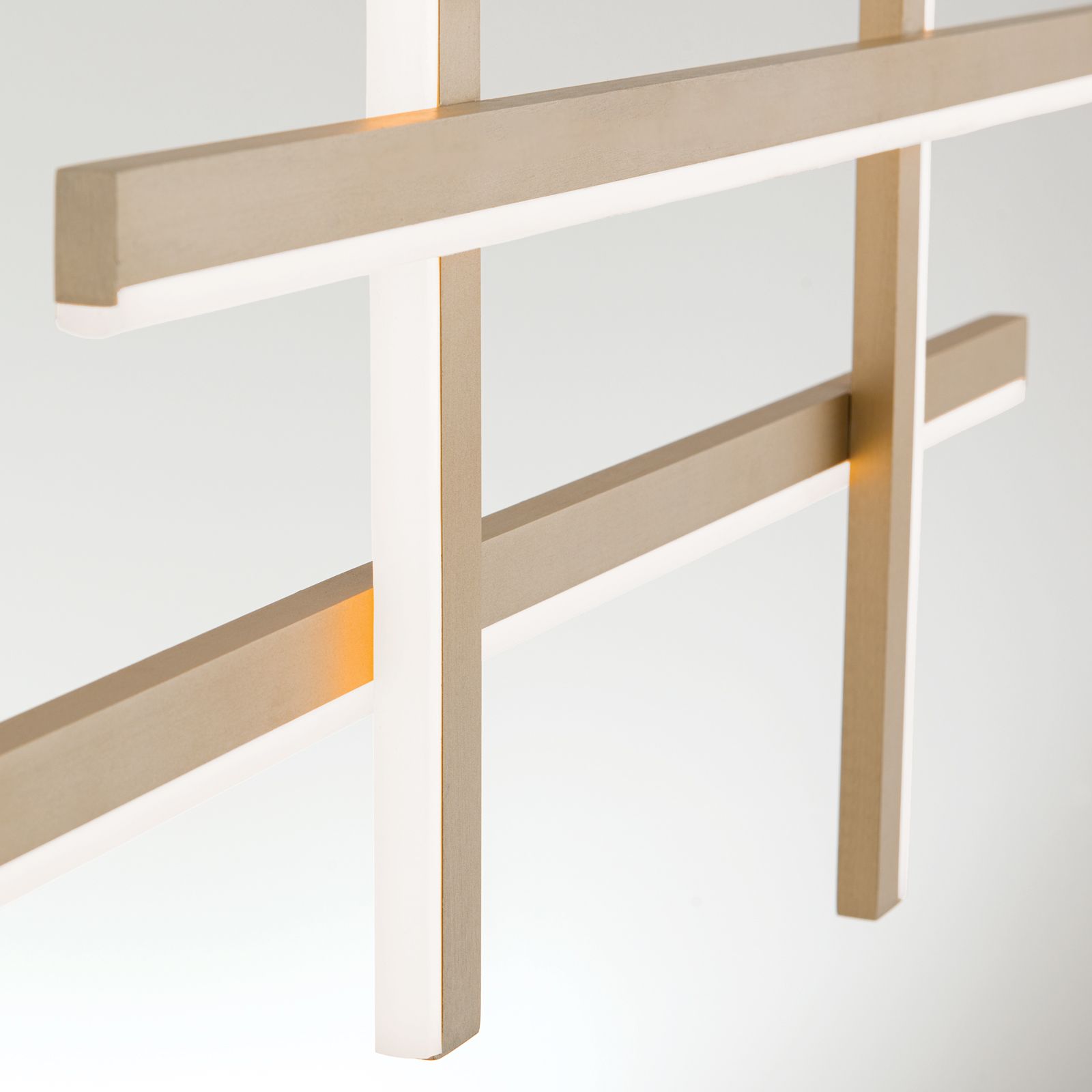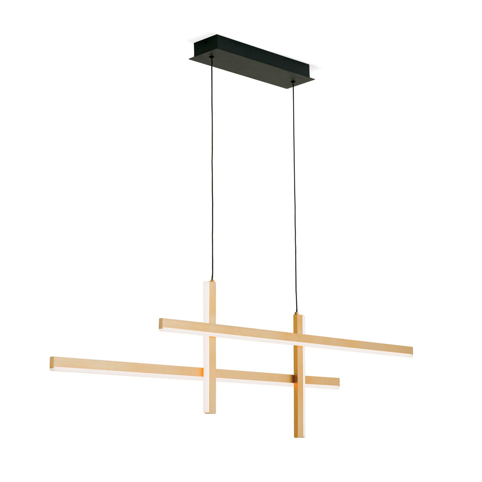 Die LED-Hängeleuchte STARTGATE überzeugt durch ihr auffälliges, lineares Erscheinungsbild. Vier über Kreuz angebrachte linienförmige LED-Element mit einem goldmatten Finish bilden den außergewöhnlichen Leuchtenkorpus. Die waagrechten Elemente geben ihr Licht nach unten ab, die senkrechten Element strahlen in den Raum. Sie sind mit schwarzen Kabeln ausgestattet, die in einem schlichten schwarzen Baldachin enden.
