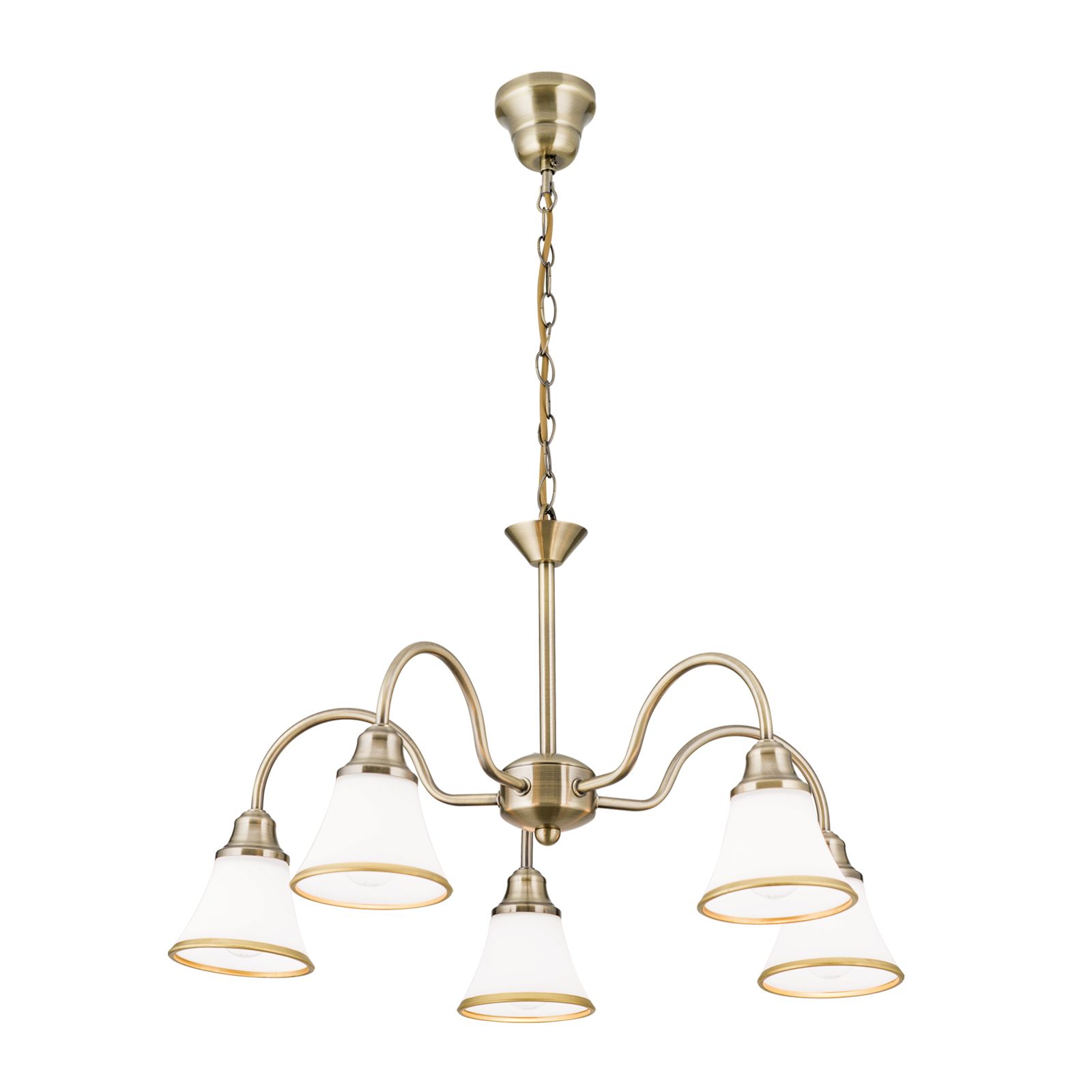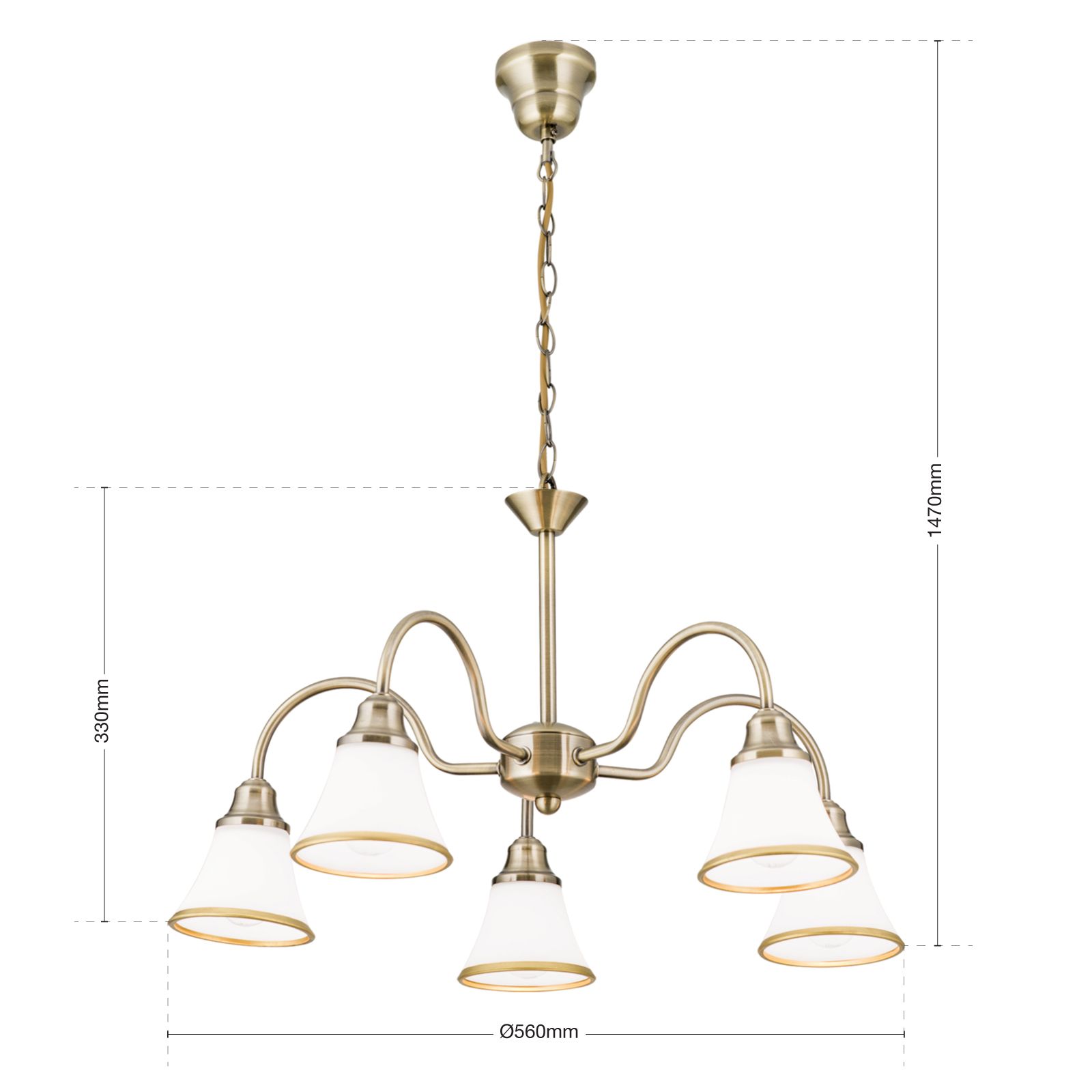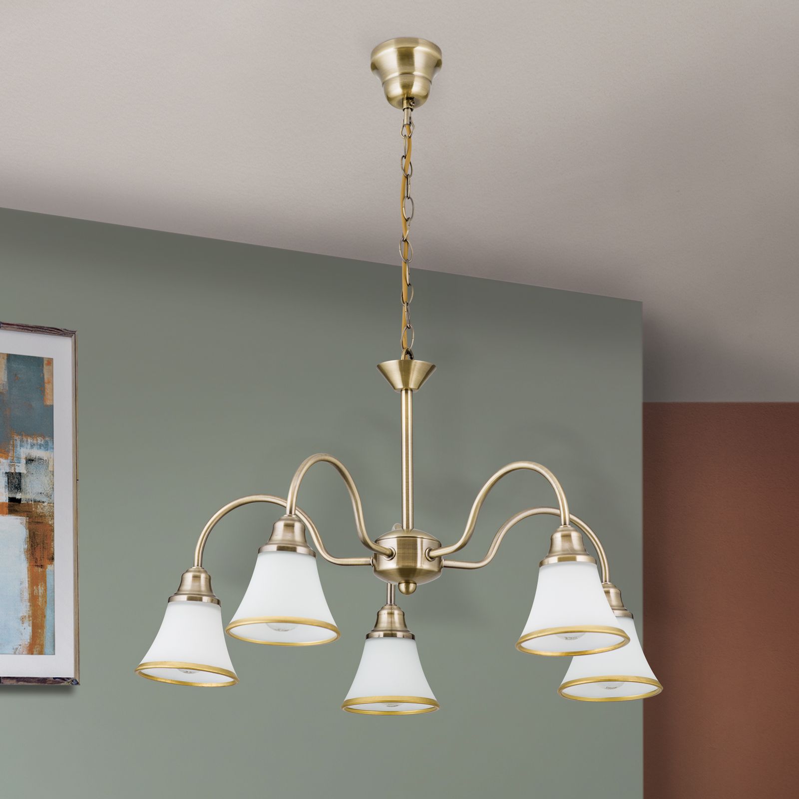 Der 5-flammige Kronleuchter MAJA fügt sich hervorragend in klassisch eingerichtete Ess- und Wohnzimmer ein. Die patinaveredelte Oberfläche verleiht ihm einen nostalgischen Ausdruck. An den gebogenen messing-matten Flammen befinden sich elegante Leuchtschirme. Ihr opalmattes Glas sorgt hierbei für eine angenehme und gleichmäßige Verteilung des Lichts. Mithilfe eines Phasenanschnittdimmers lässt sich sein Licht auch dimmen. Die vergoldeten Schirmränder komplettieren den Look auf interessante Weise.