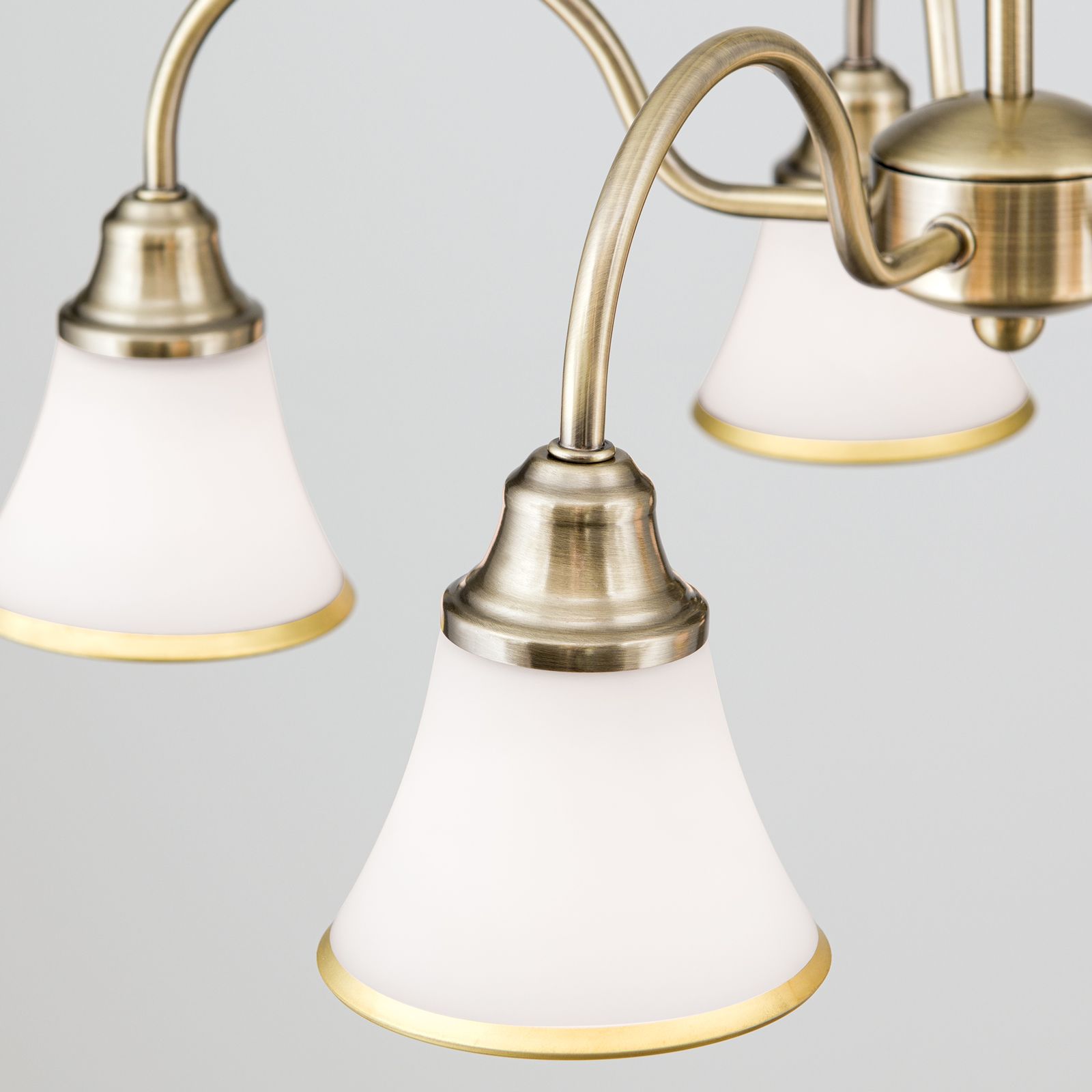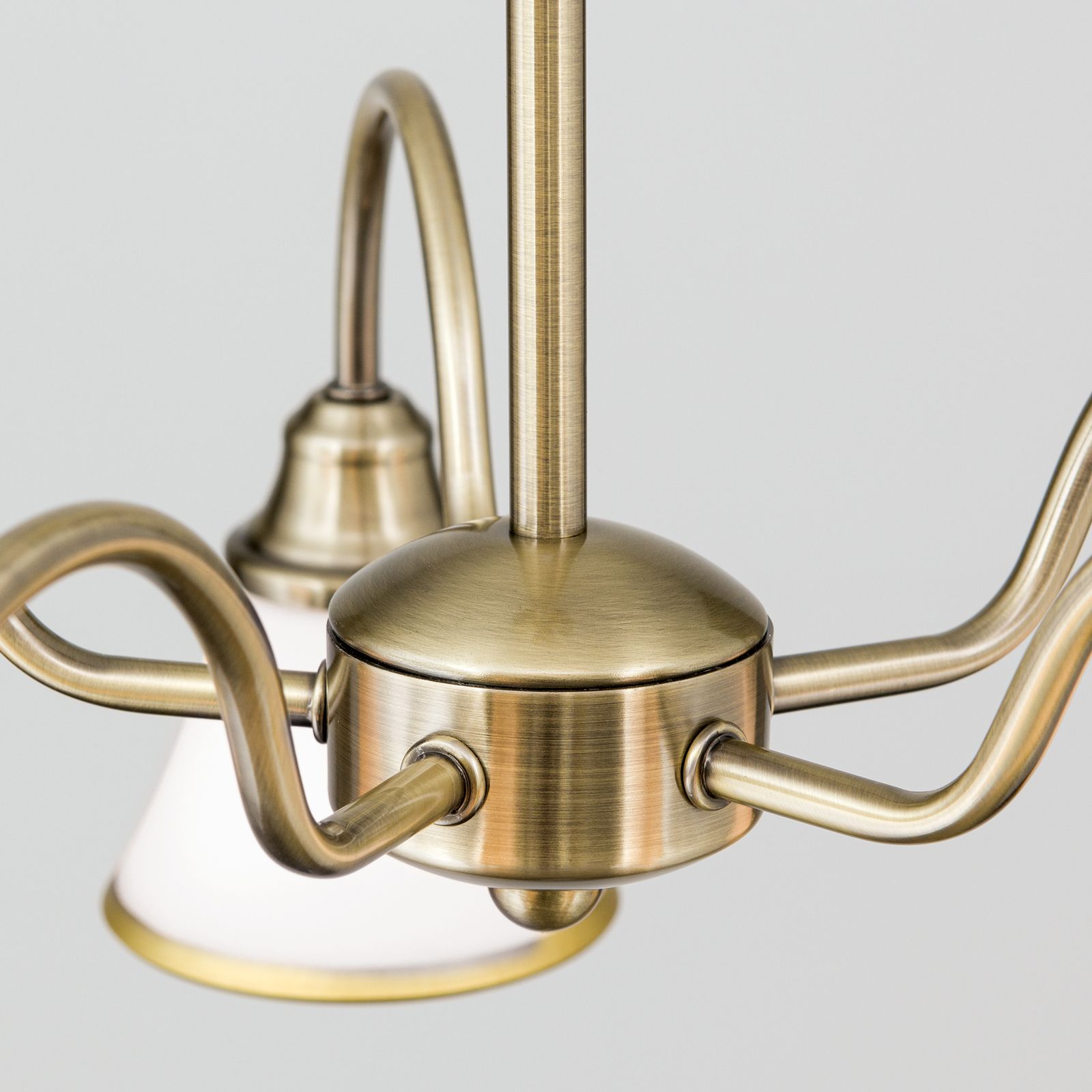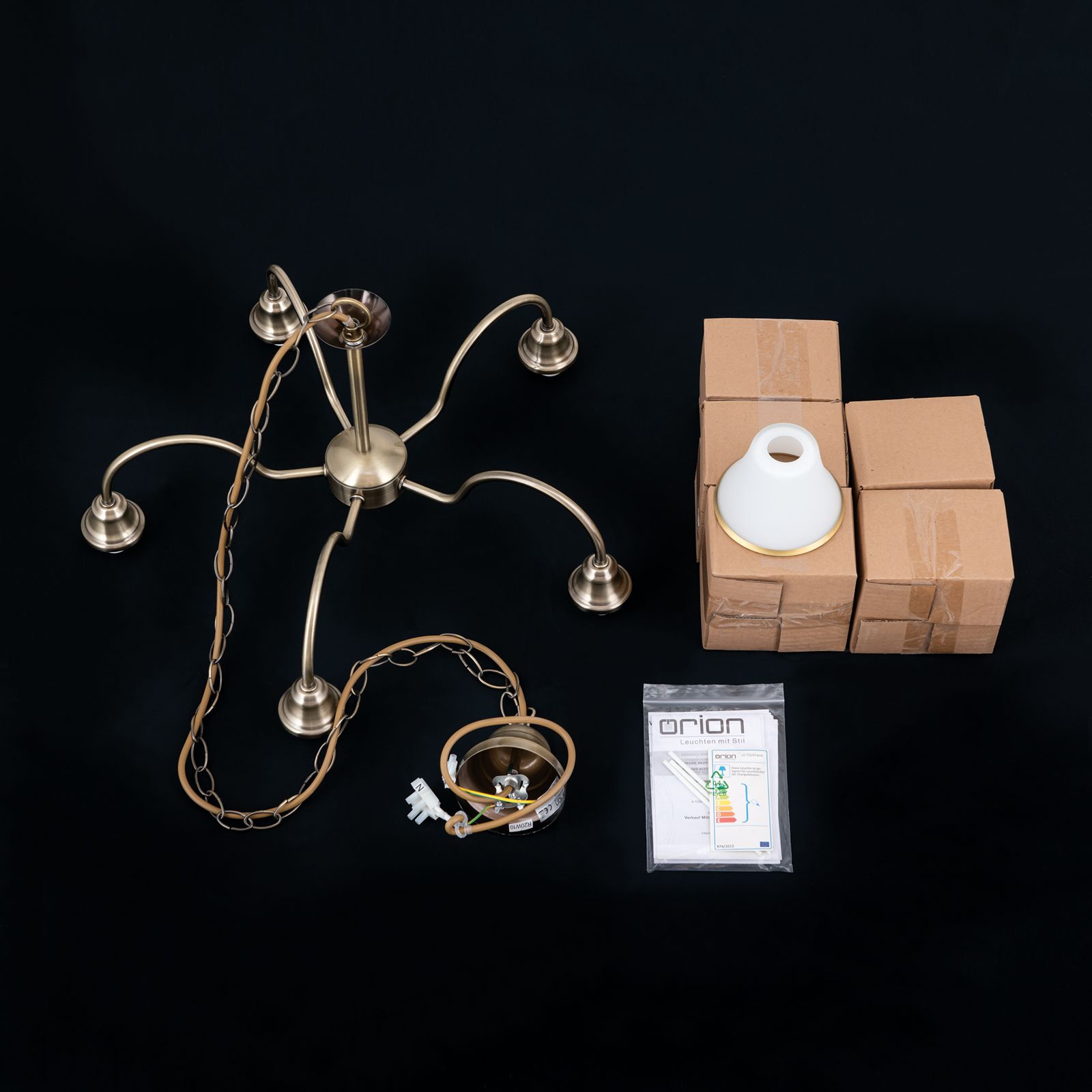 Der 5-flammige Kronleuchter MAJA fügt sich hervorragend in klassisch eingerichtete Ess- und Wohnzimmer ein. Die patinaveredelte Oberfläche verleiht ihm einen nostalgischen Ausdruck. An den gebogenen messing-matten Flammen befinden sich elegante Leuchtschirme. Ihr opalmattes Glas sorgt hierbei für eine angenehme und gleichmäßige Verteilung des Lichts. Mithilfe eines Phasenanschnittdimmers lässt sich sein Licht auch dimmen. Die vergoldeten Schirmränder komplettieren den Look auf interessante Weise.