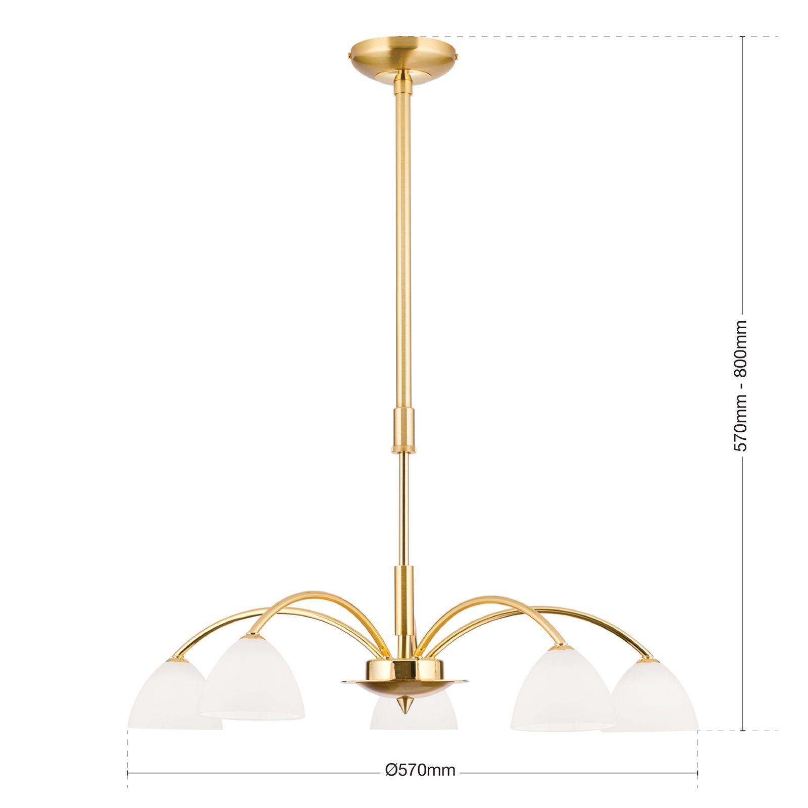 Die Pendelleuchte ist mit einer Teleskopstange ausgestattet, weshalb ihre Gesamthöhe zwischen 57-80 Zentimeter variiert und an die Gegebenheiten angepasst werden kann.
