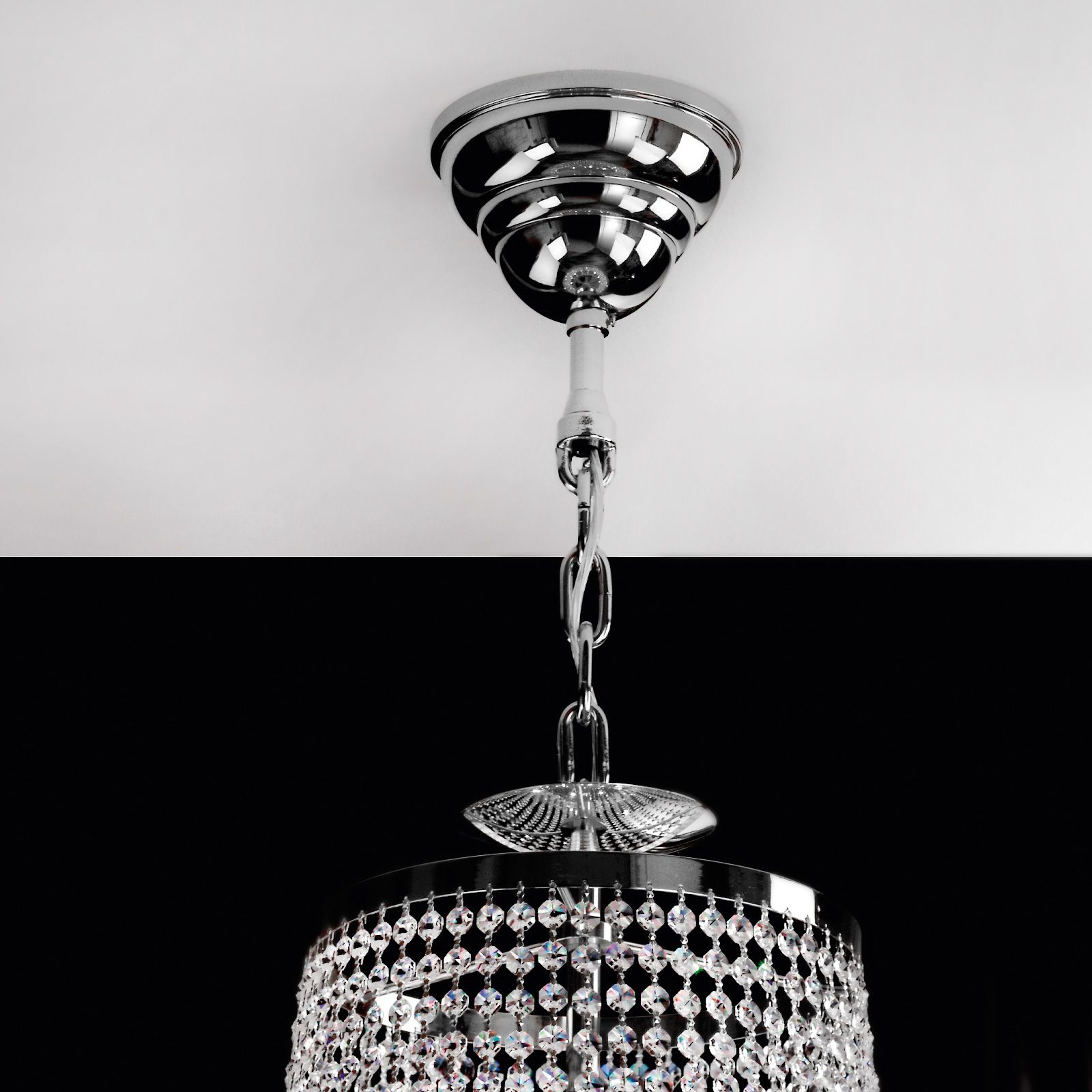 Auf einer Höhe von 150 cm mit einer Abhängung von 120 cm sowie einem Durchmesser von 105 cm sind verchromte Metallringe und unzählige zu Ketten verbundene Koppen angebracht. Im klassischen Kronleuchter-Stil bildet eine verspiegelte Zierplatte, umrandet von tropfenförmigen Kristallen und einer facettierten Kristallkugel den Abschluss. Hinter den vielen Kristallketten sitzen die 24 E27-Fassungen, die mit maximal 60 Watt bestückt werden und das faszinierende Lichtspiel der qualitätsvollen Kristalle auslösen. Für variierende Helligkeit kann mithilfe eines Dimmers gesorgt werden.