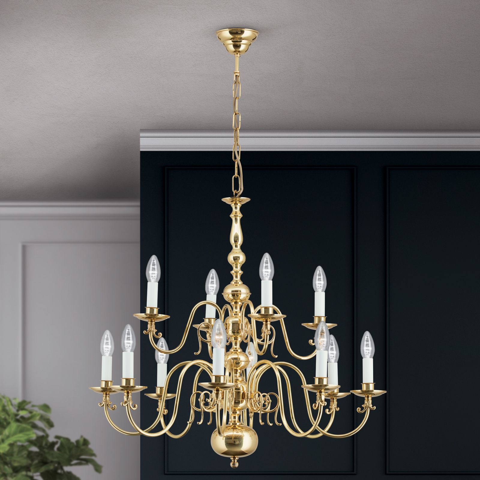 Der 12-flammige Luster aus der FLÄMISCH-Produktreihe ist auch in Patina verfügbar.