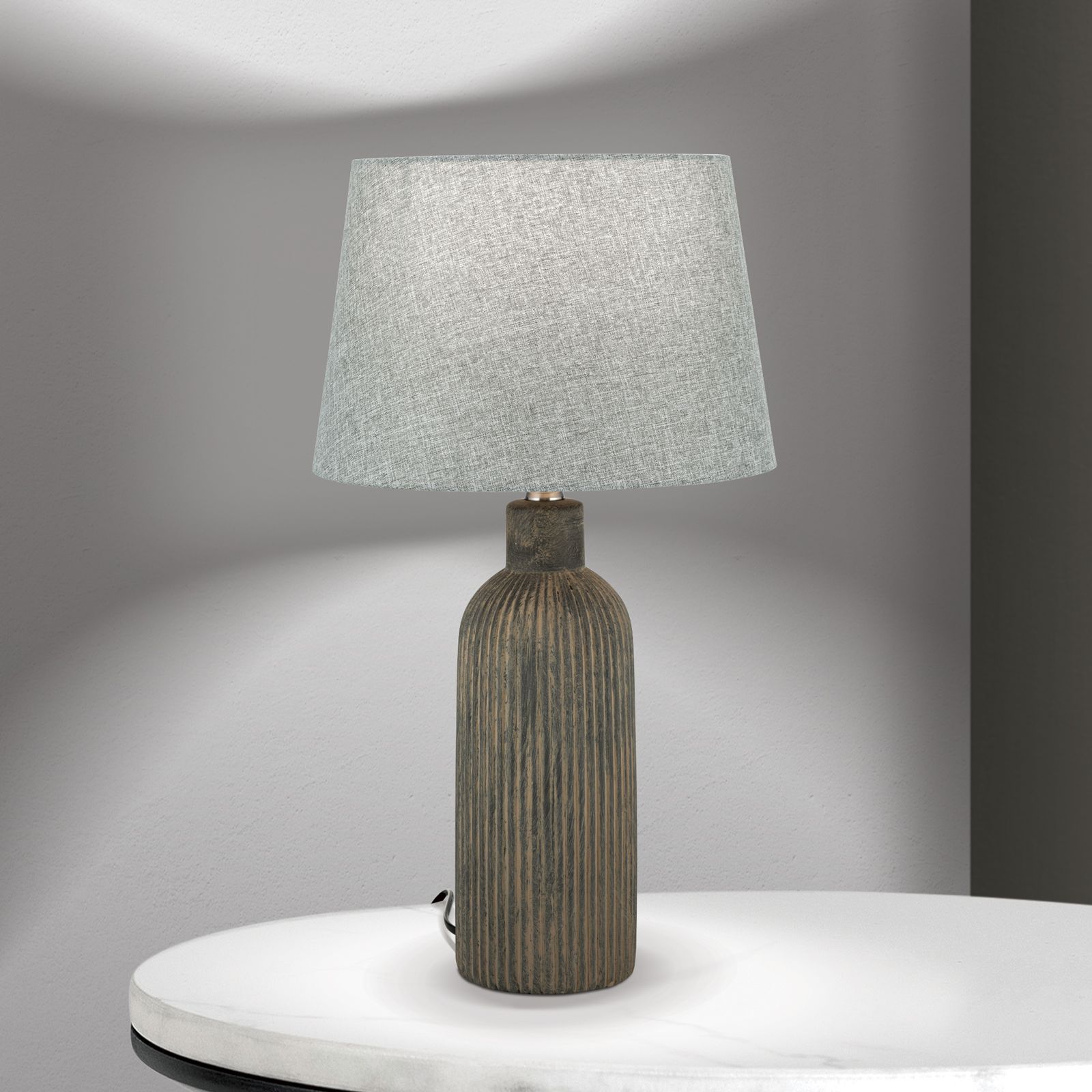 Der braune Keramikfuß verleiht der Lampe eine warme und natürliche Ausstrahlung, die sich harmonisch in verschiedenste Einrichtungsstile einfügt. Der Schirm aus grauem Leinen sorgt für eine angenehme Lichtverteilung und schafft eine behagliche Atmosphäre. Er wird mit einem praktischen Schraubring befestigt, was die Montage erleichtert und sicheren Halt gewährleistet.