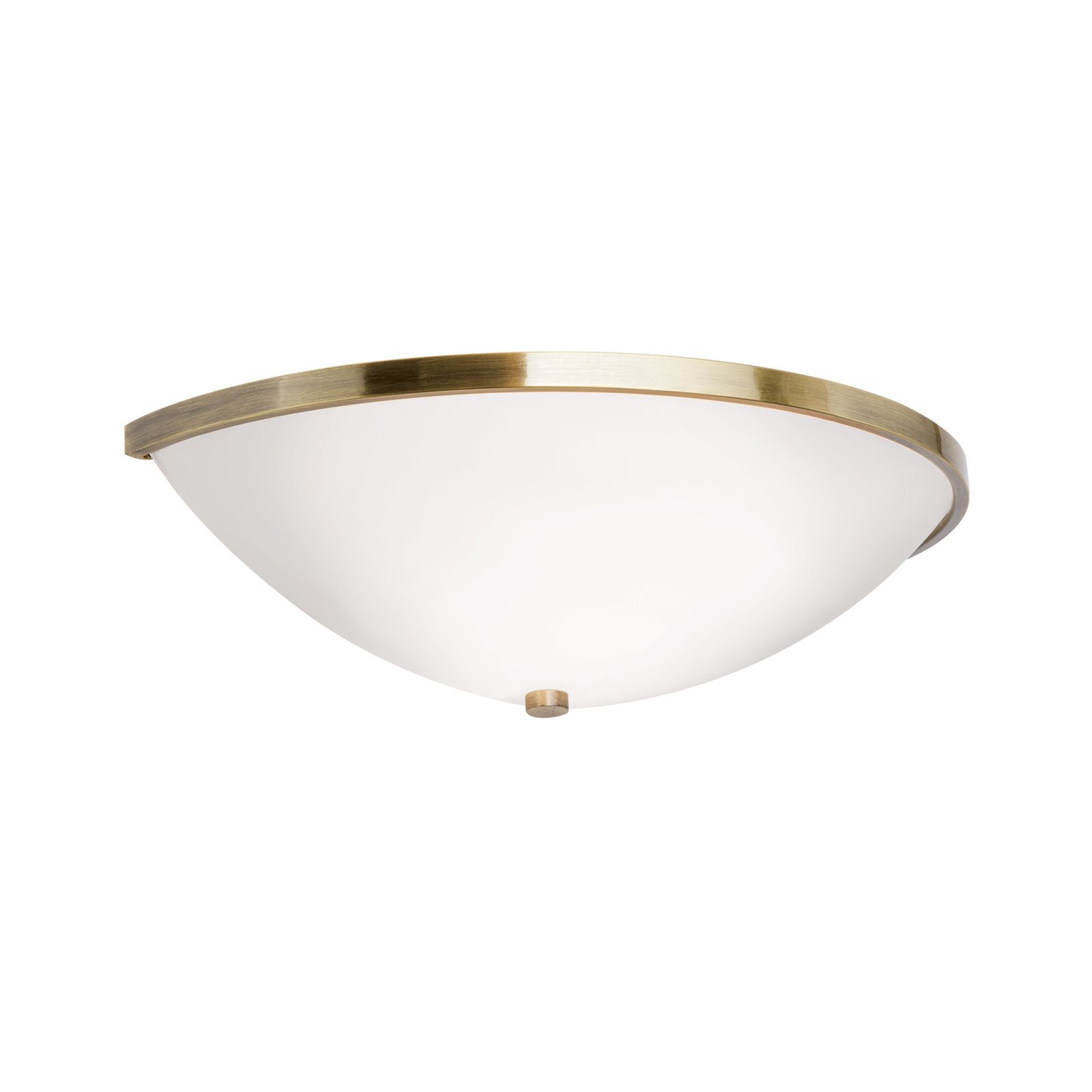 Patinierte Metallelemente wie die Schirmeinfassung und der zylindrische Knopf dienen als Halterung des matten Opalglasschirms und verleihen der Wandlampe eine zeitlose Eleganz.
