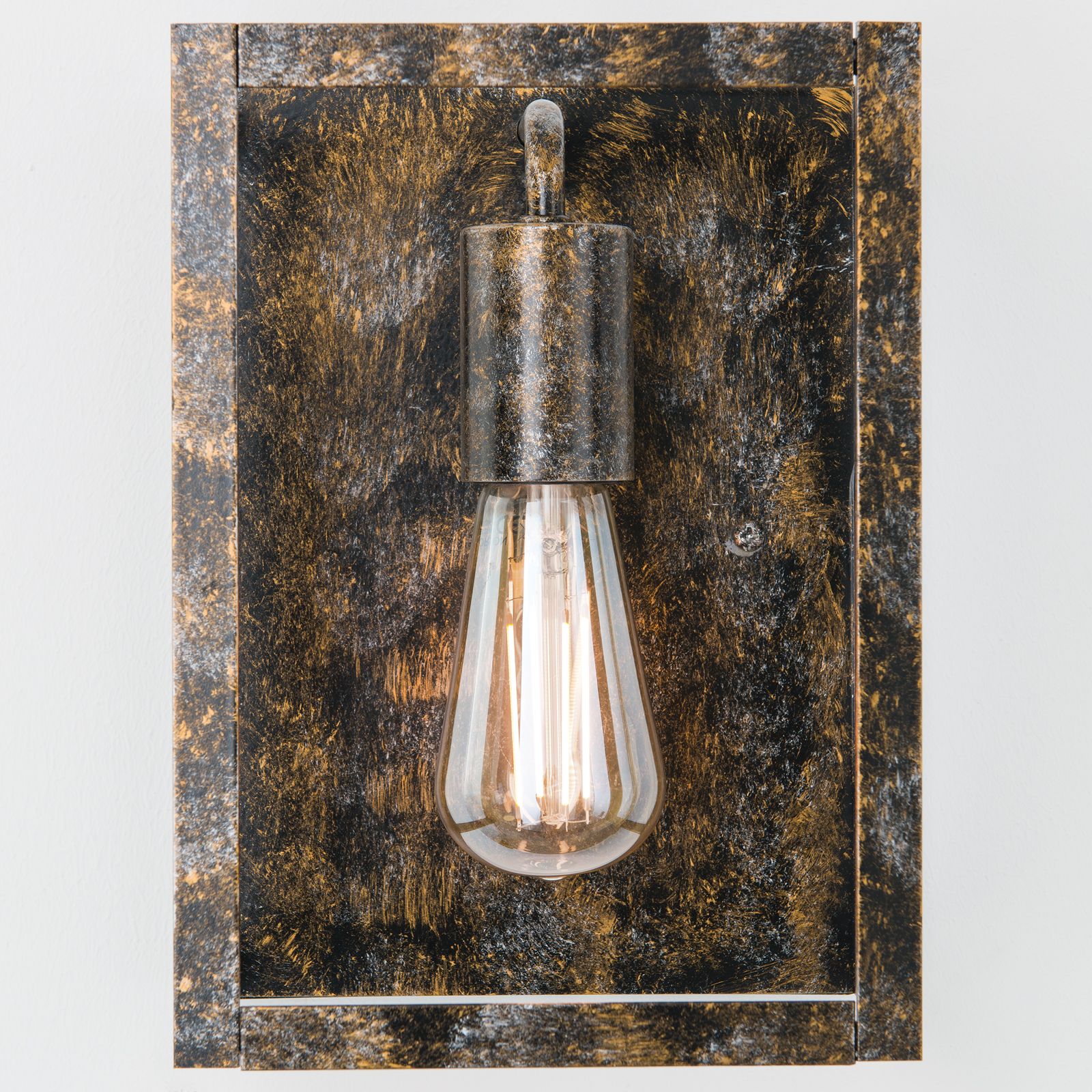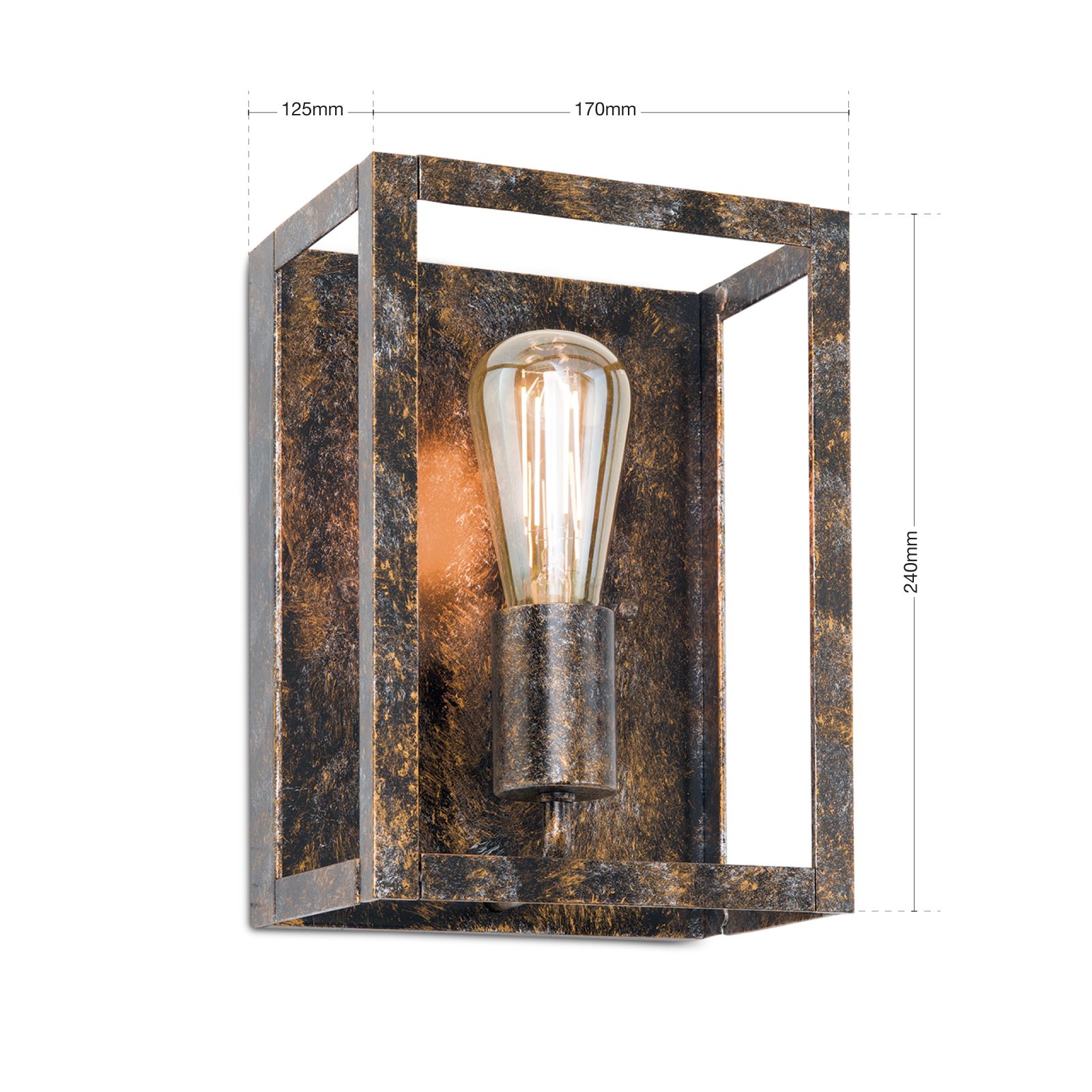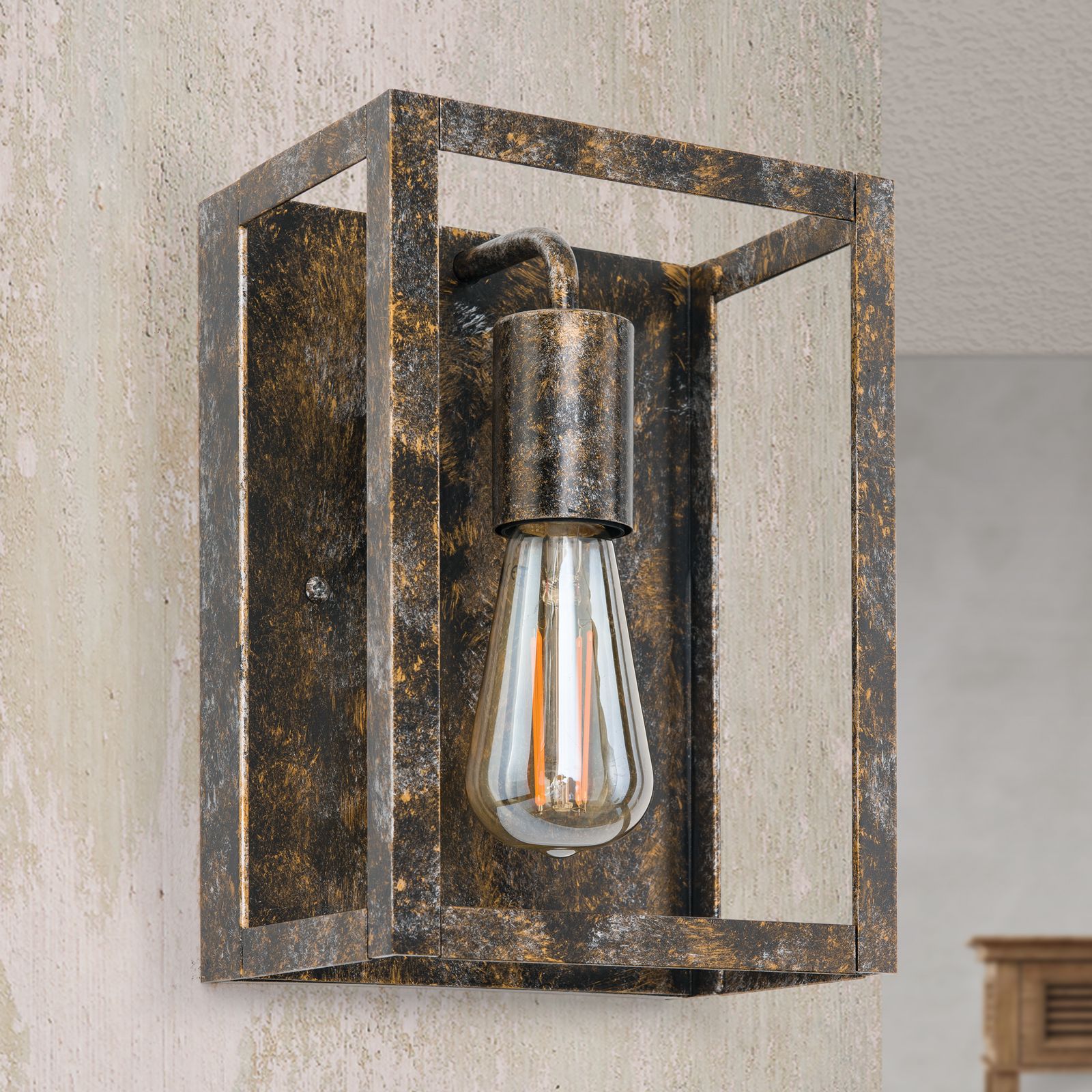 Ein patinierter Stahlrahmen bildet den Körper der Wandleuchte CAGE im Vintage-Look. Ihr rohes und einfaches Design versprüht einen ungeschliffenen Charme.