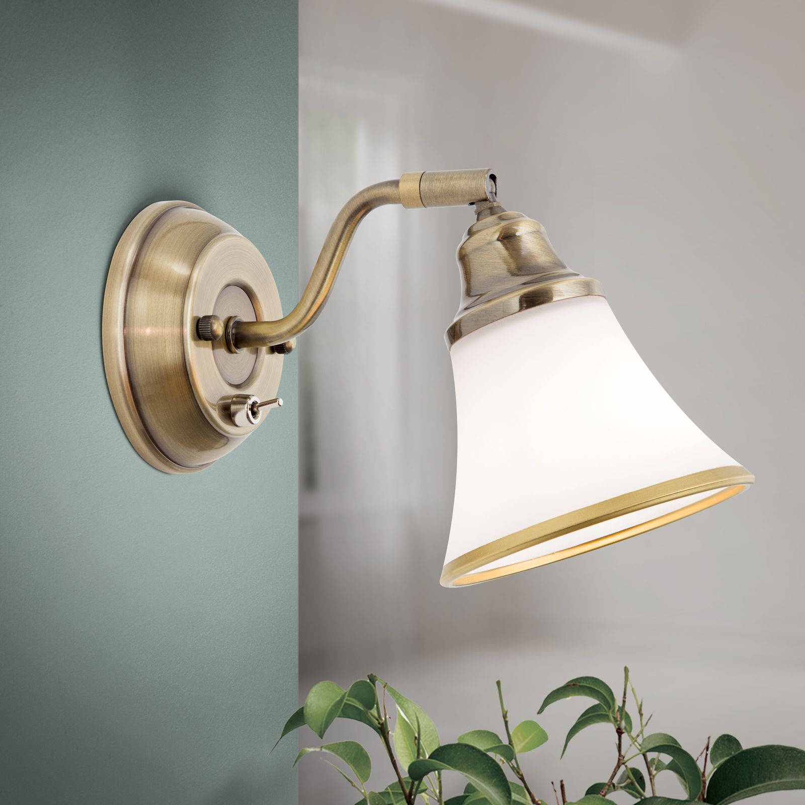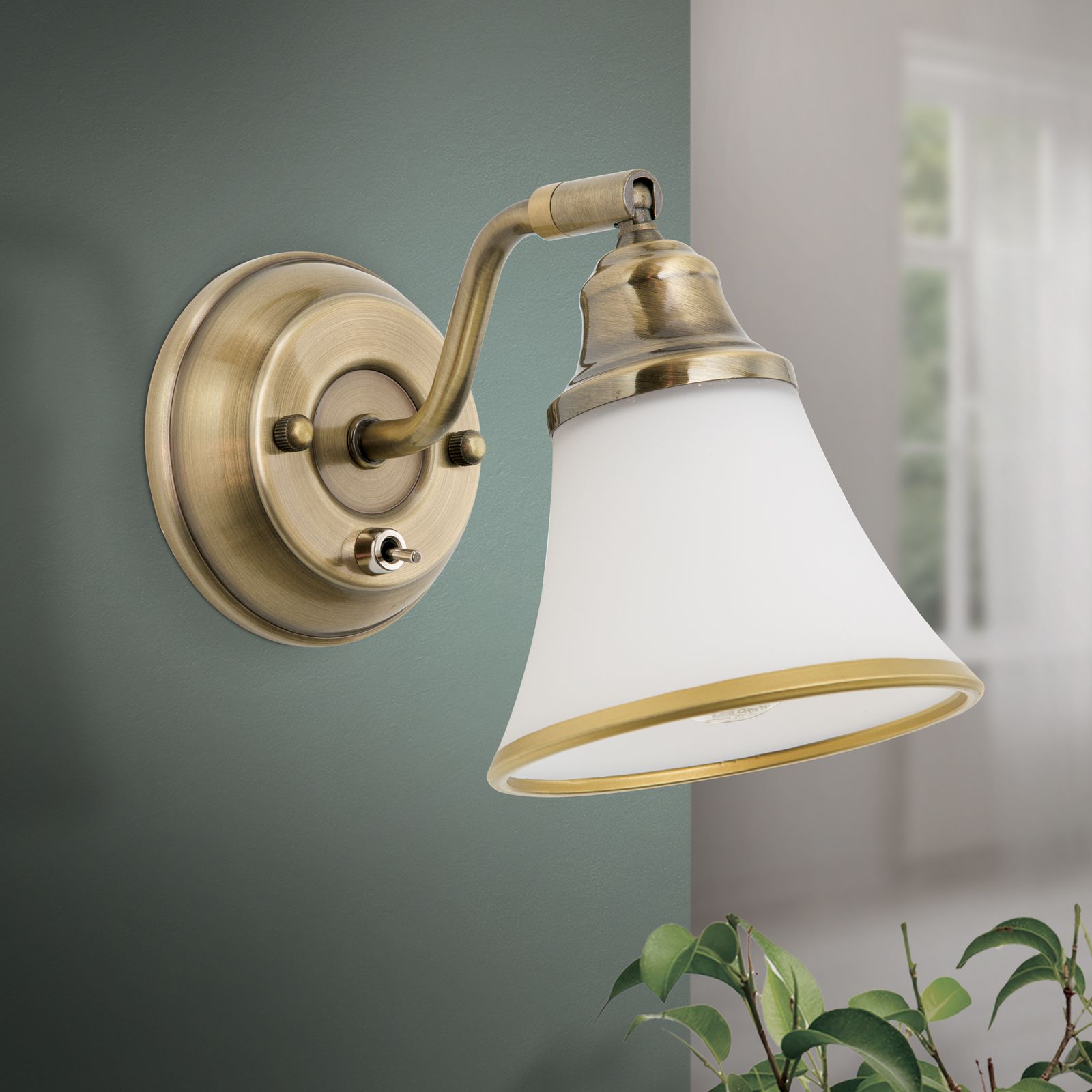 Eine schlichte als auch klassische Lichtquelle ist die Wandleuchte aus der Familie MAJA. Sie sorgt für ein stimmungsvolles und gleichmäßiges Licht in Fluren, Eingangs- oder anderen Wohnbereichen. Der Leuchtenschirm ist aus opalmatten Glas gefertigt und ermöglicht somit eine blendfreie Beleuchtung. Abgerundet wird das Design durch die patinaveredelte Oberfläche, welche auch den unteren Rand des Schirms ziert.
